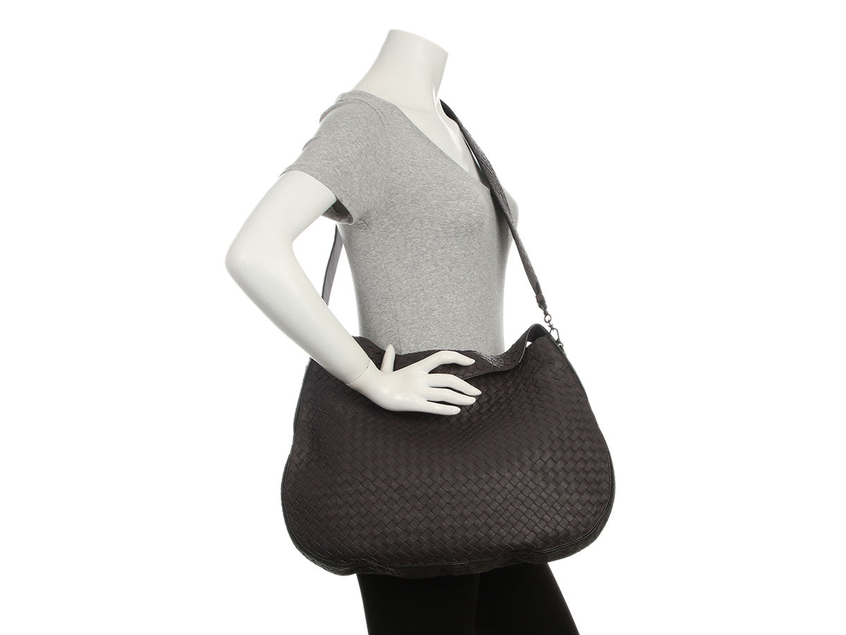 Bottega Veneta’s Gray Crossbody Hobo is spacious and slouchy! Made of gray woven leather, the top zips open to beige microfiber lining with one zipped pocket inside. In excellent condition with a dustbag, the front has some stressing. With a 7-inch drop to the top handle and a 19-inch drop on the detachable shoulder strap, it’s the perfect size for work, play, or a weekend away!