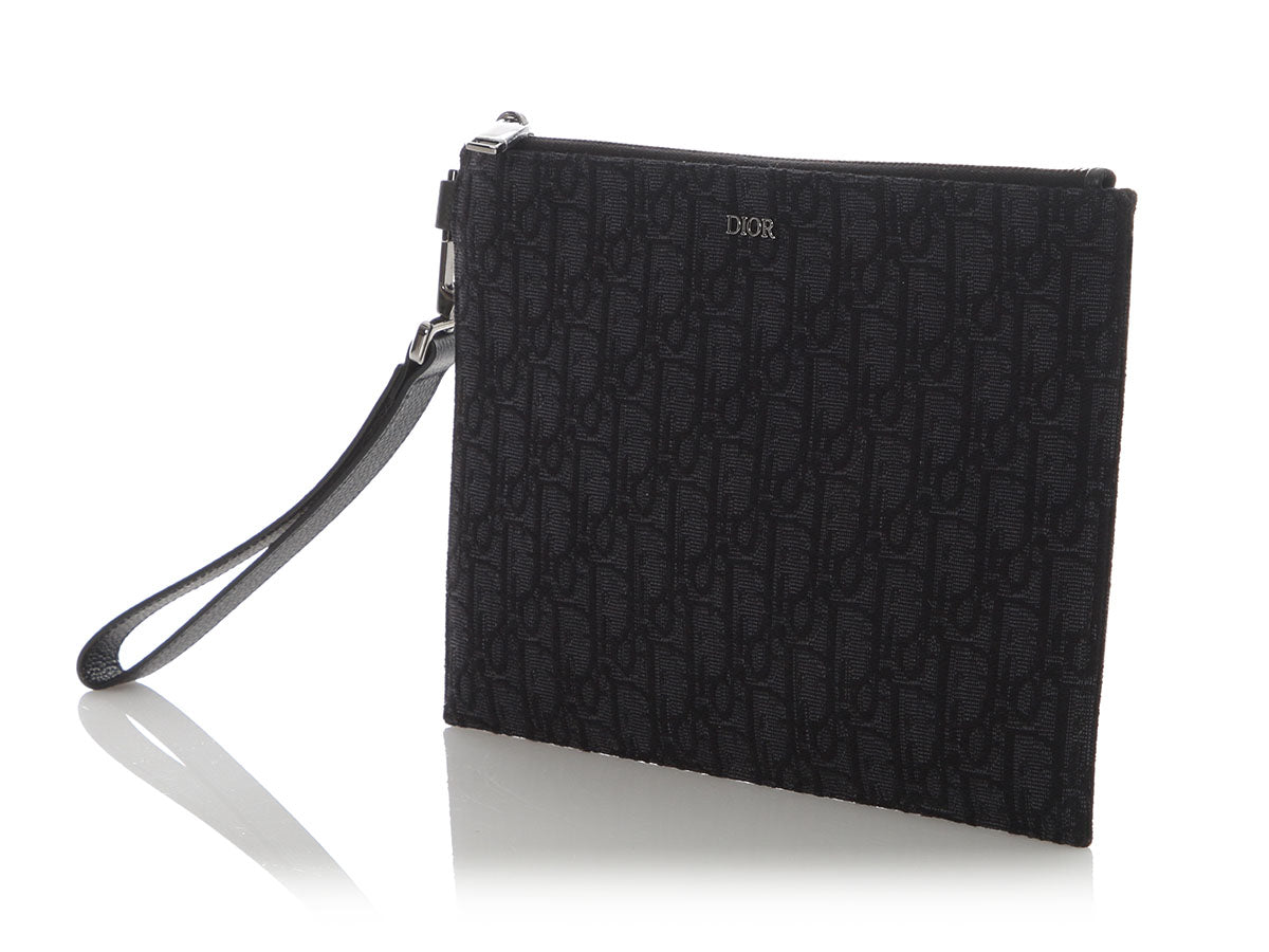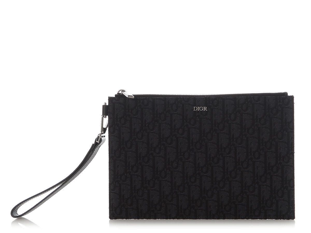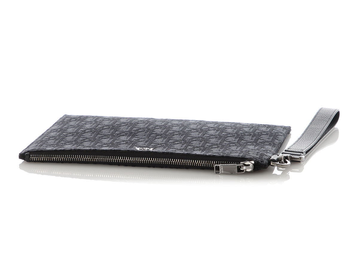 Dior’s Black Oblique Jacquard A5 Pouch is a slim, sleek piece with an elegant style! Made of jacquard canvas with a detachable thick leather wristlet, it shows “DIOR” on the front in silver hardware. The top zips open to black fabric lining with three slide pockets inside. In great condition with a box and dustbag, the hardware has some light scratches and there are a few marks inside. Tuck this lovely into a bigger bag, or use it as a clutch to flaunt its elegance!