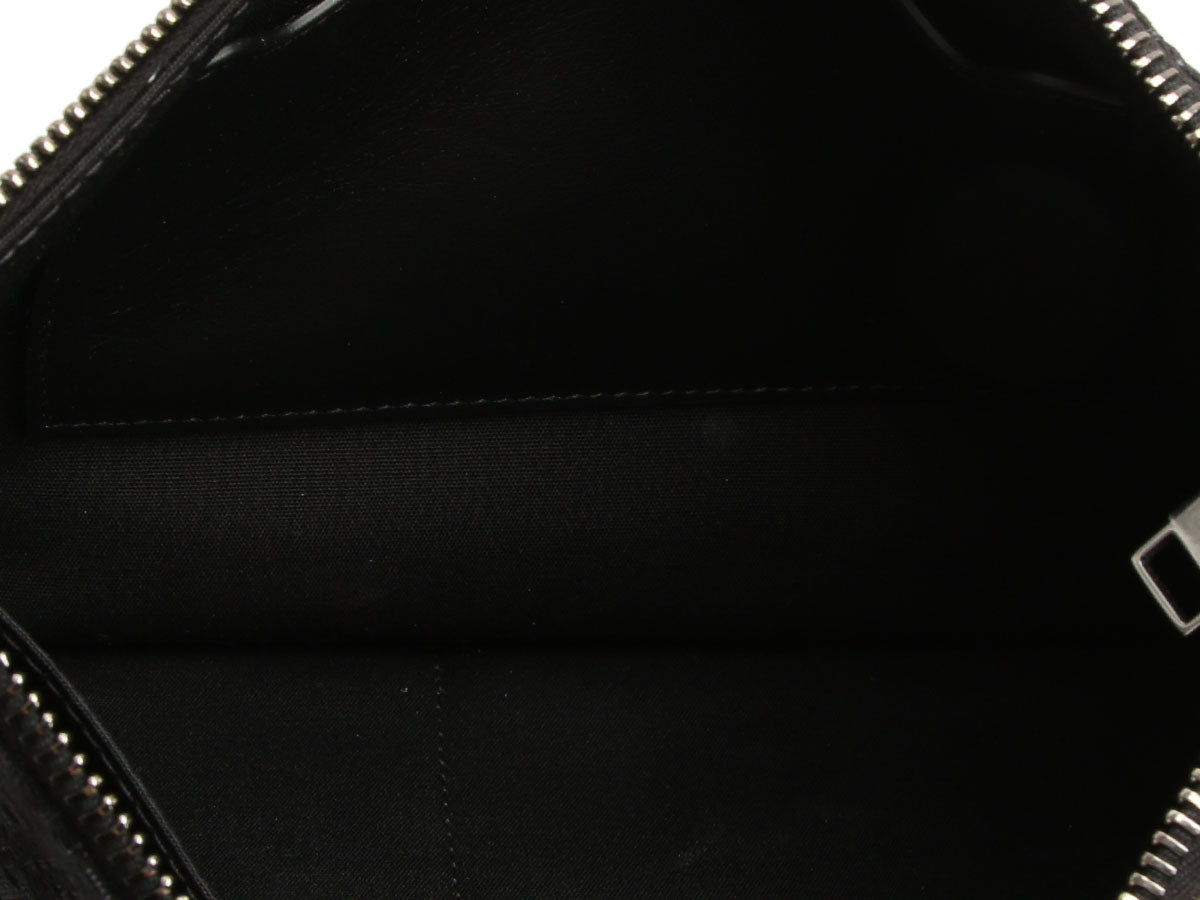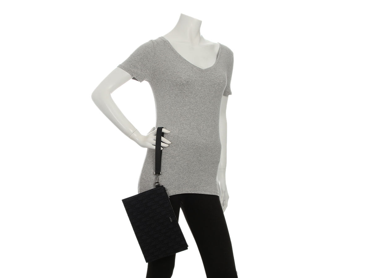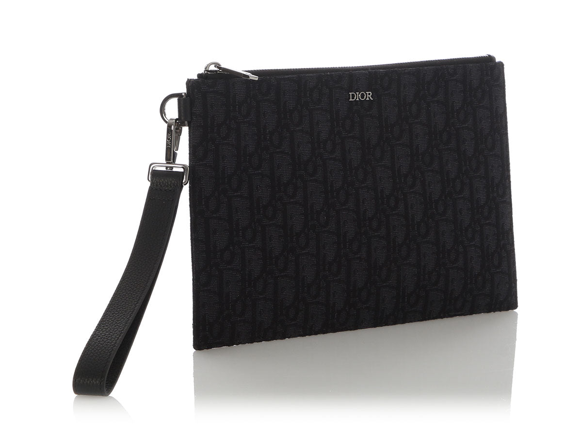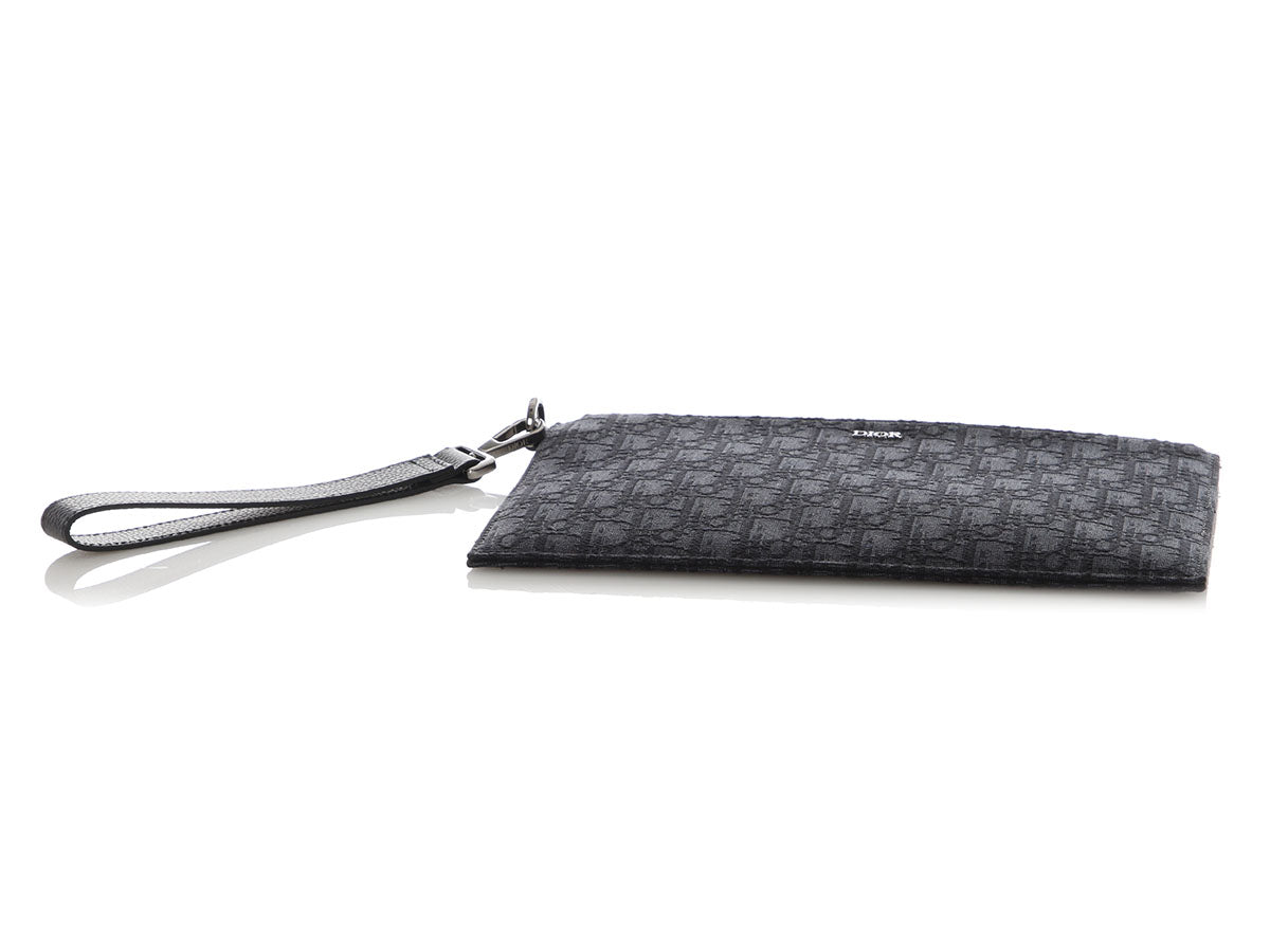 Dior’s Black Oblique Jacquard A5 Pouch is a slim, sleek piece with an elegant style! Made of jacquard canvas with a detachable thick leather wristlet, it shows “DIOR” on the front in silver hardware. The top zips open to black fabric lining with three slide pockets inside. In great condition with a box and dustbag, the hardware has some light scratches and there are a few marks inside. Tuck this lovely into a bigger bag, or use it as a clutch to flaunt its elegance!