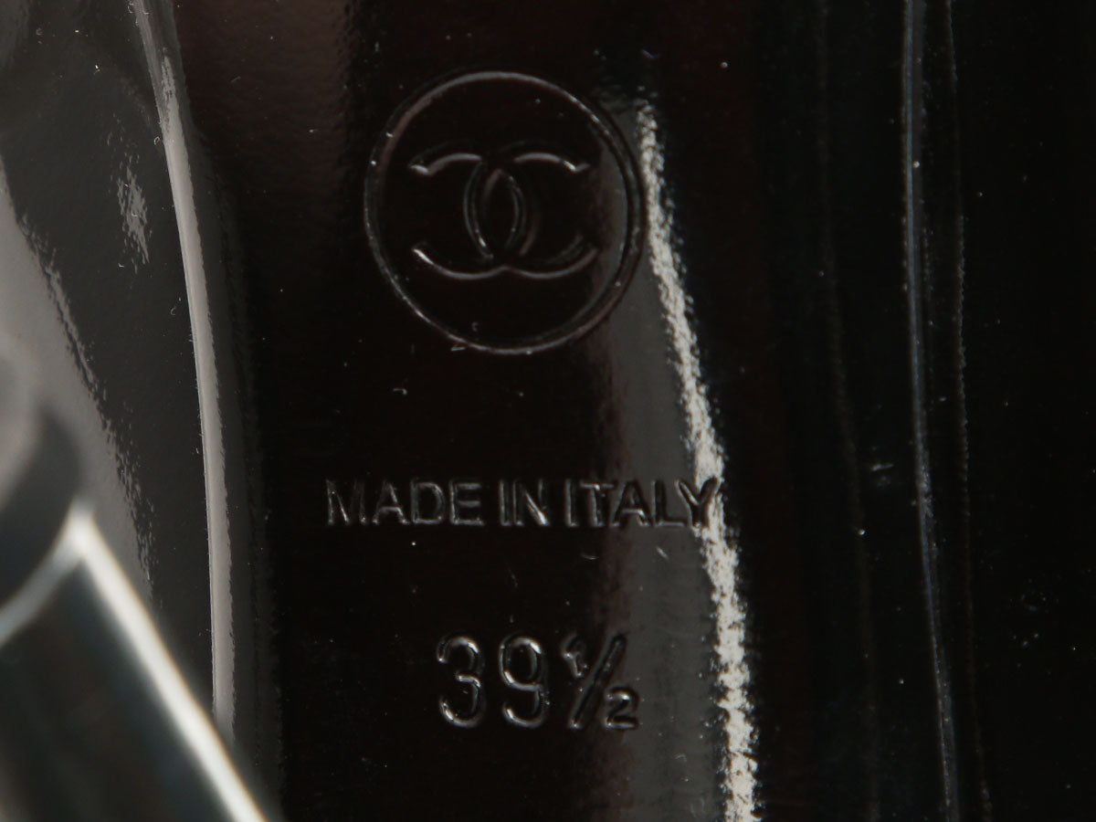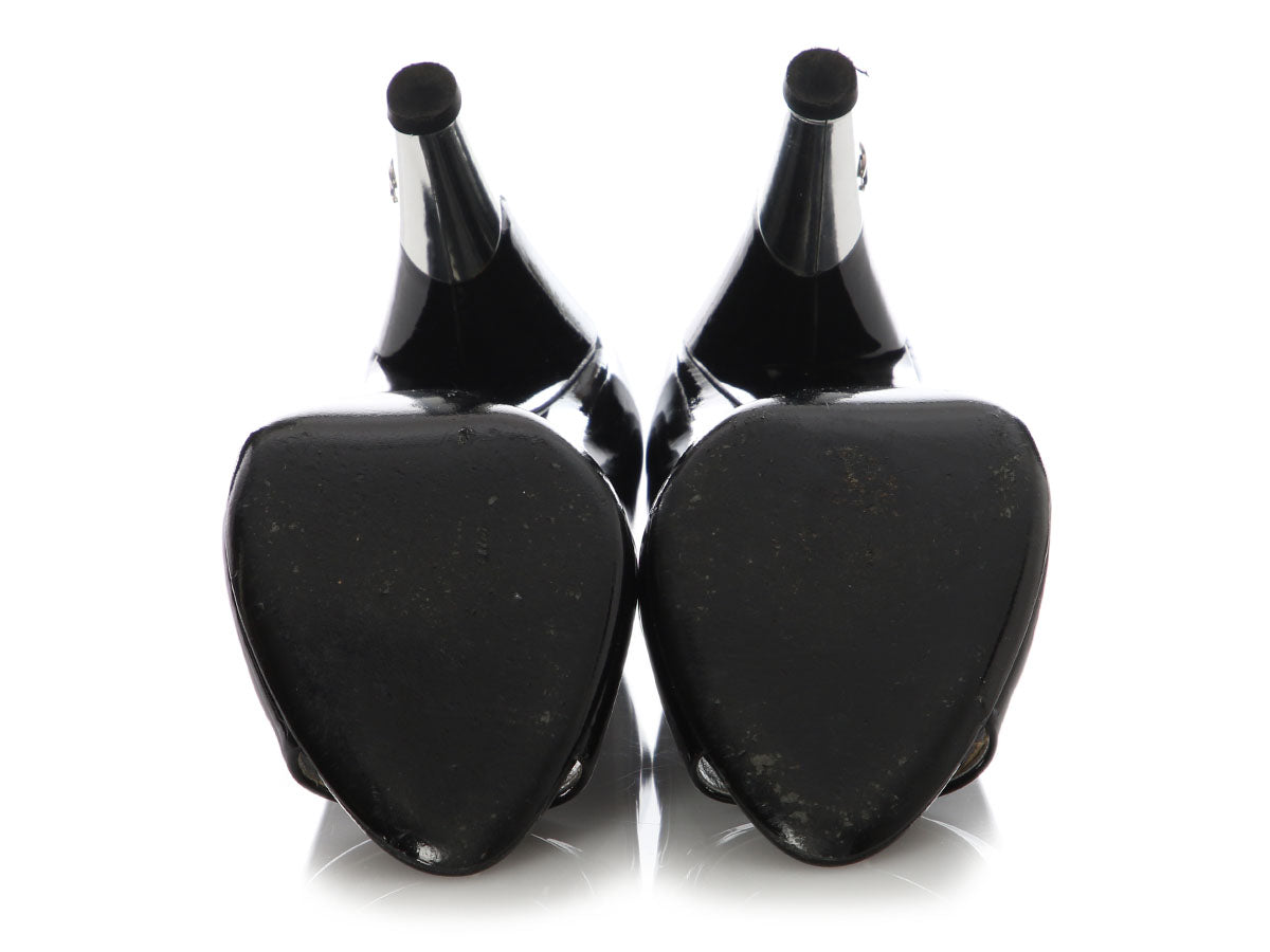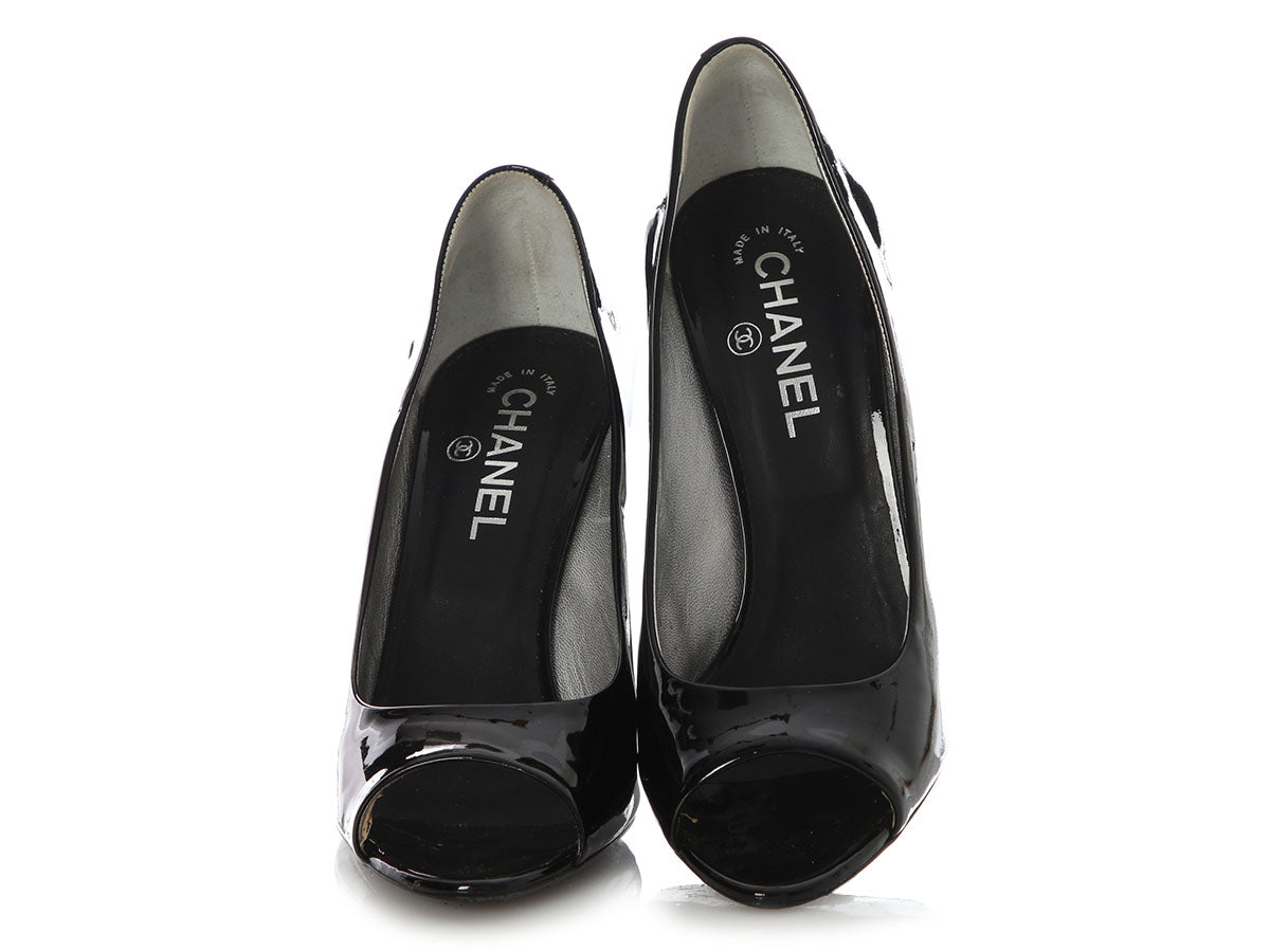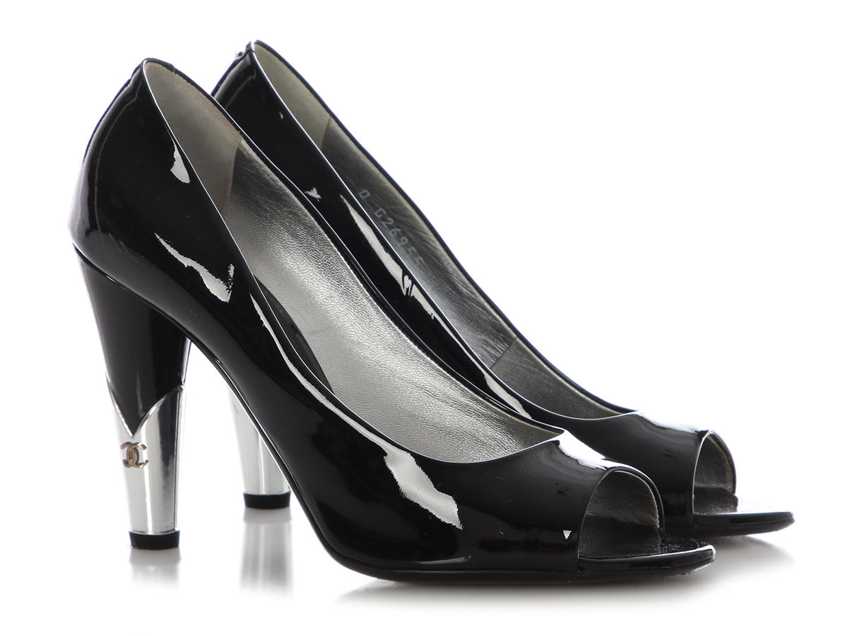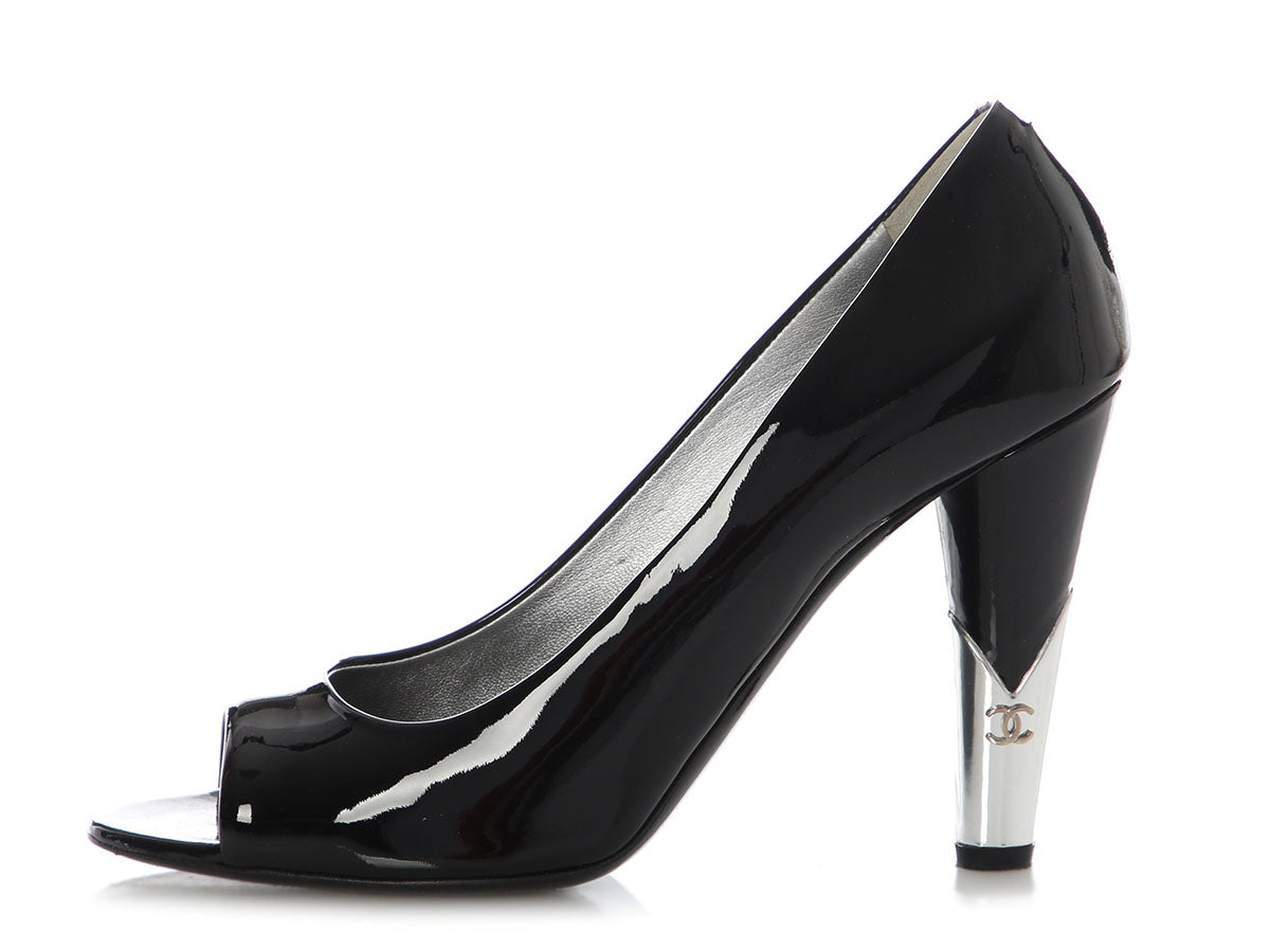 Chanel’s Black Patent Peep-Toe Pumps deliver sleek evening elegance with just the right dose of shine! Crafted from glossy black patent leather with leather inners and soles, they feature open toes and 4-inch heels accented with silver leather and tiny CCs at the back. In good condition with a box and two dustbags, they have wear on the soles, inside wear (notably on the right shoe), and light scratches and rub marks throughout. They have a timeless silhouette that steps confidently into any occasion!