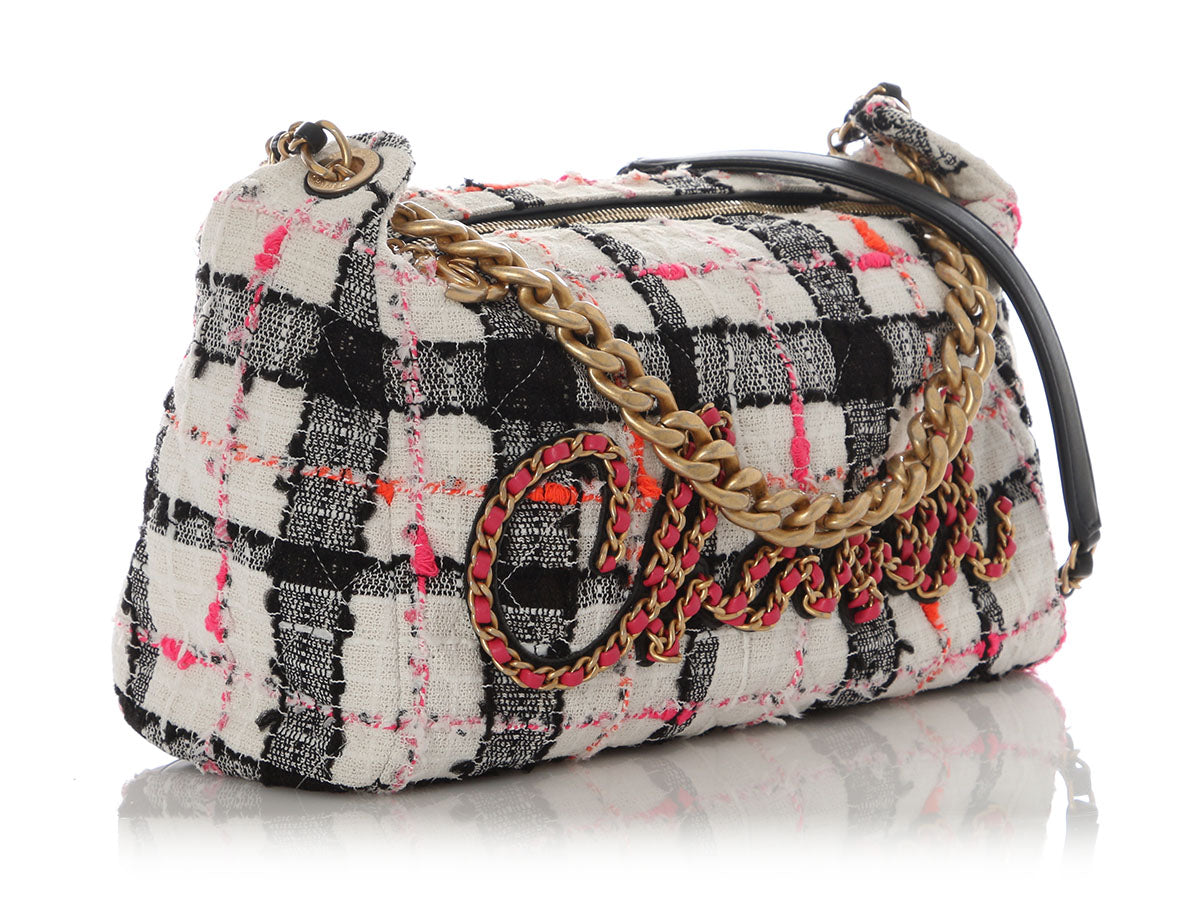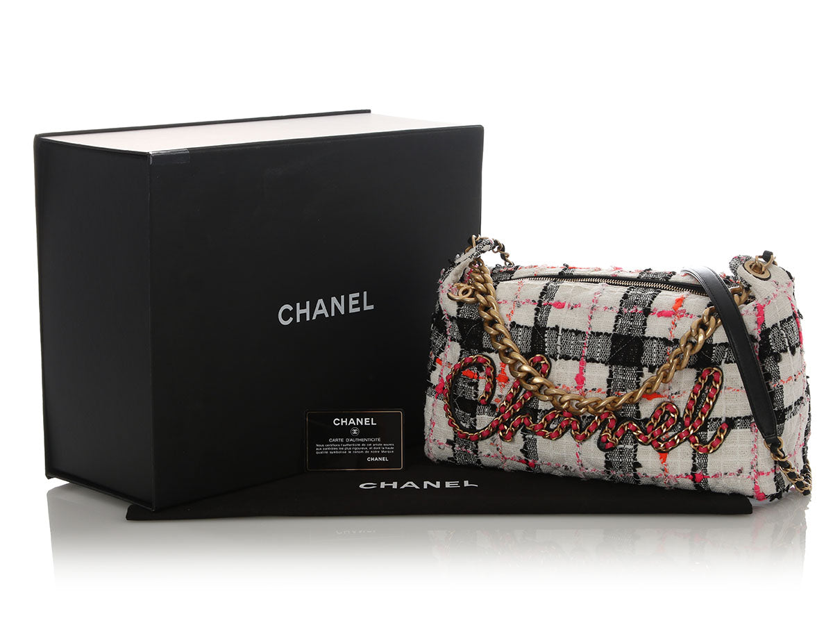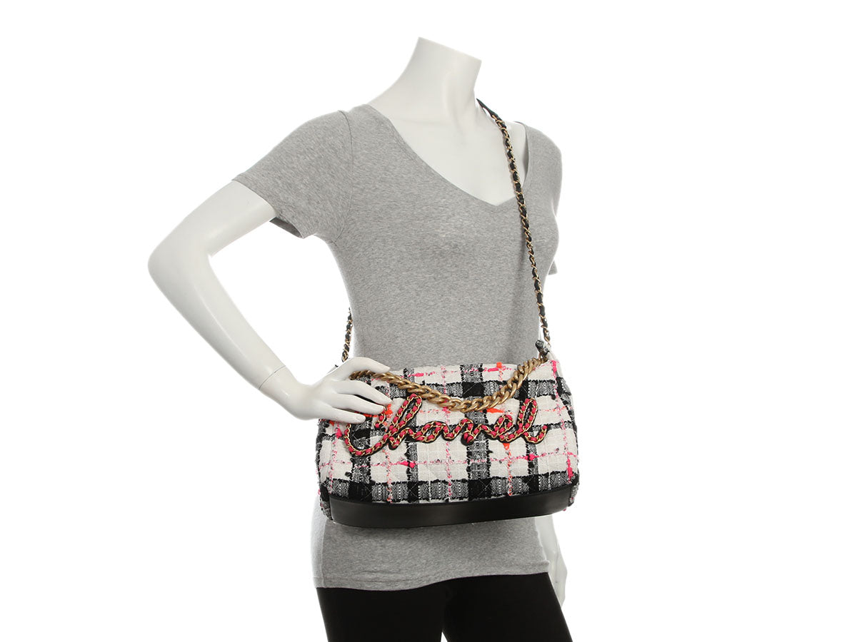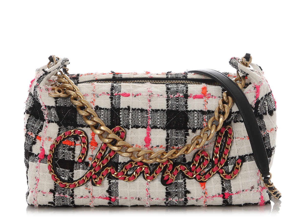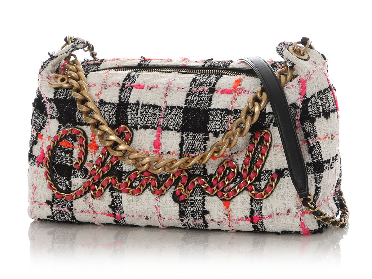 Chanel’s Tweed Signature Hobo is equal parts playful and polished, pairing pink, orange, black, and white tweed with antique gold hardware for a look that balances texture and attitude! The slouchy silhouette features a leather-through-chain strap with a 19-inch drop or a chain top handle with a 6-inch drop, while pink leather lettering woven through chain gives the bag its signature charm. The zip top opens to black fabric lining with one zipped pocket and two slide pockets, and a slide pocket on the back adds quick-access convenience. In great condition from 2021 with a dustbag, box, and card, it has wear on the hardware. Fresh, fun, and unmistakably Chanel, this hobo brings a confident personality to every carry!