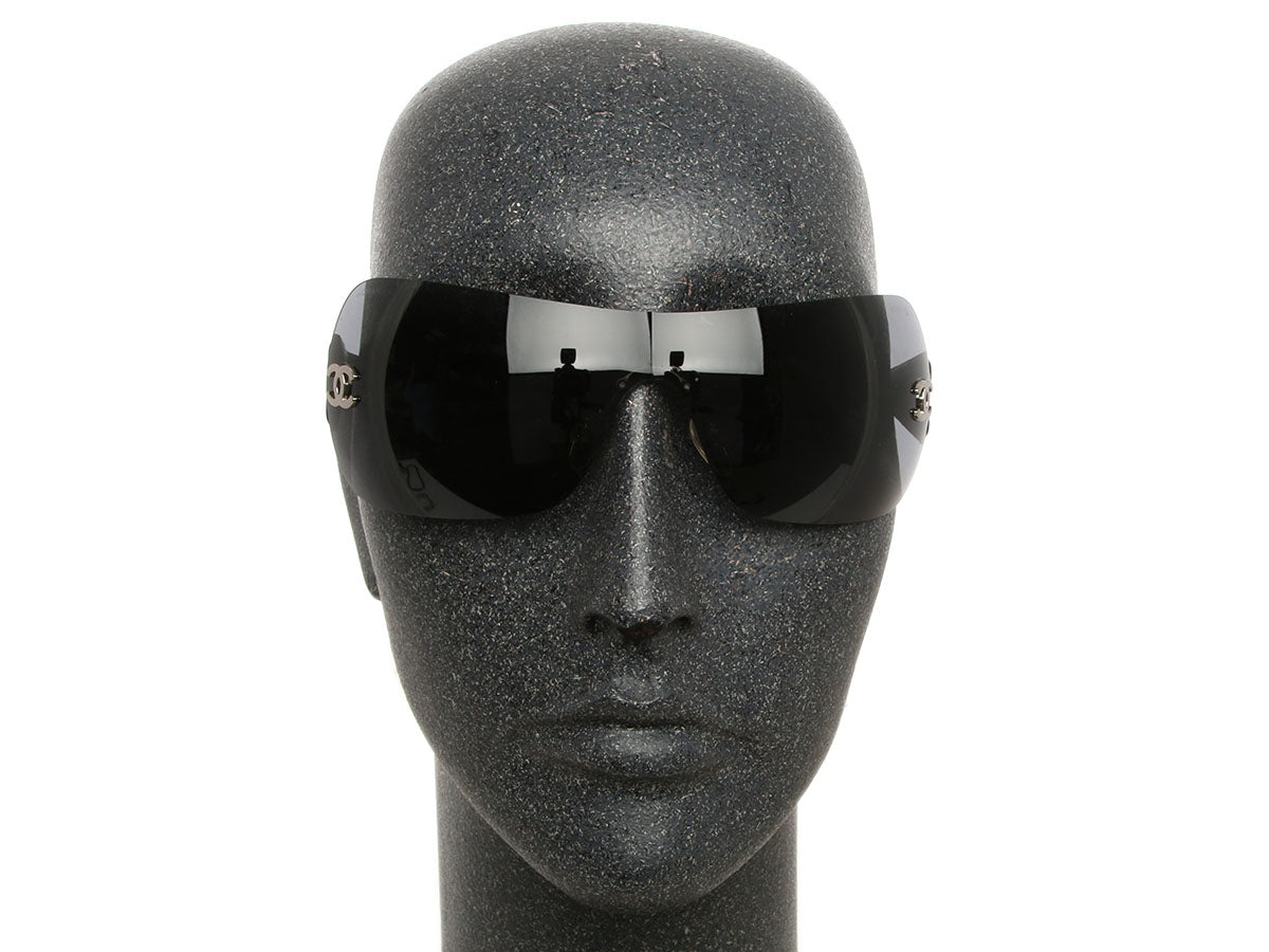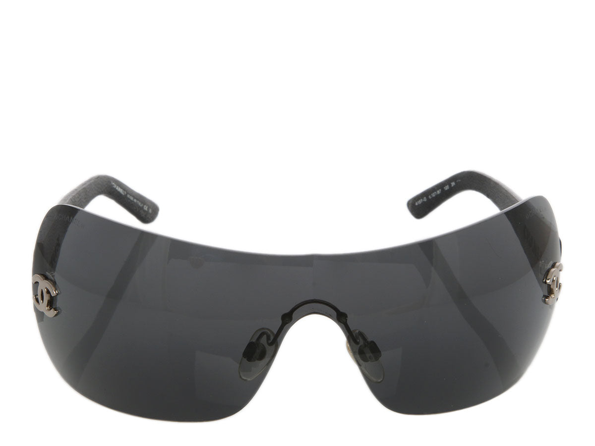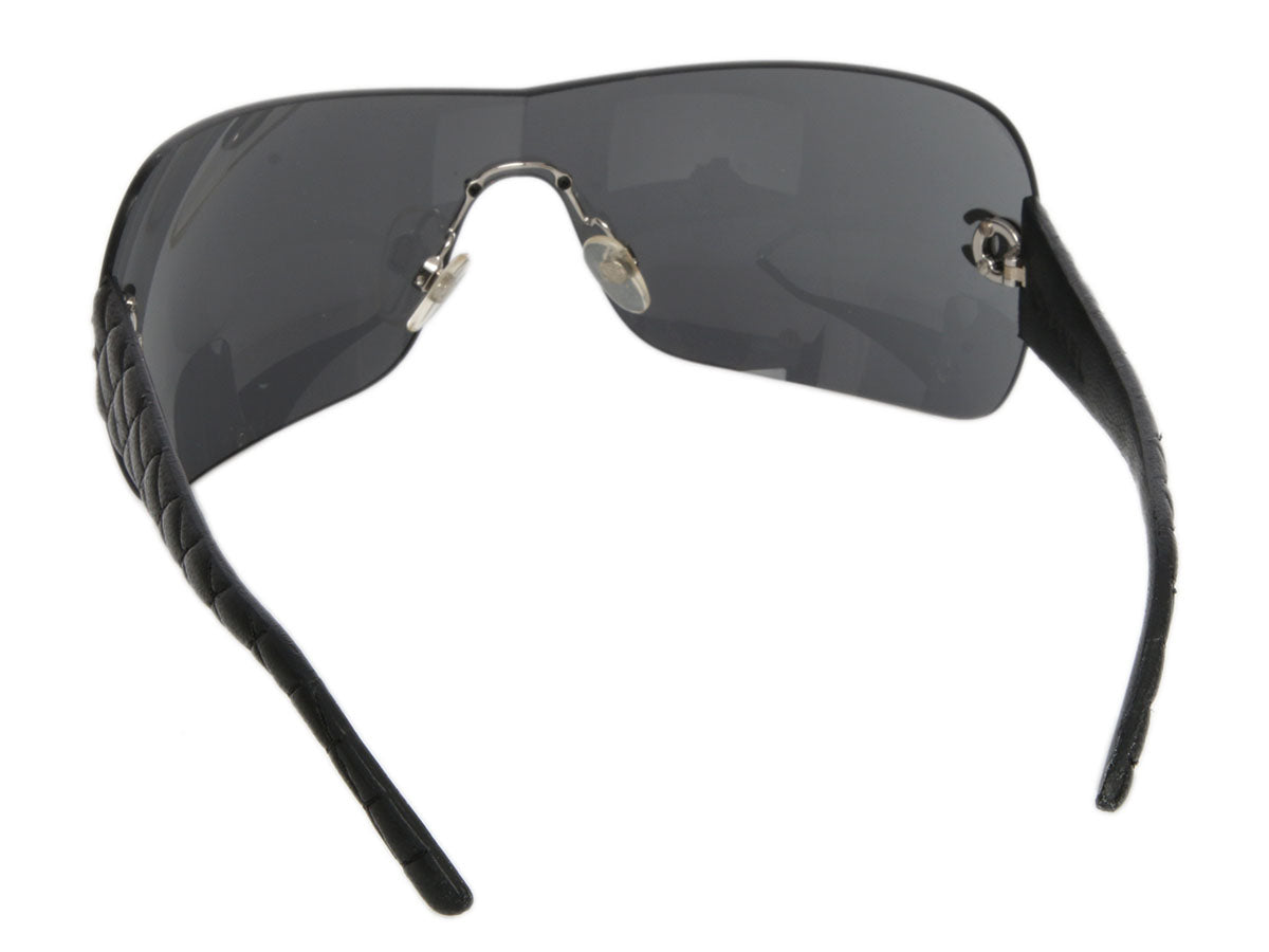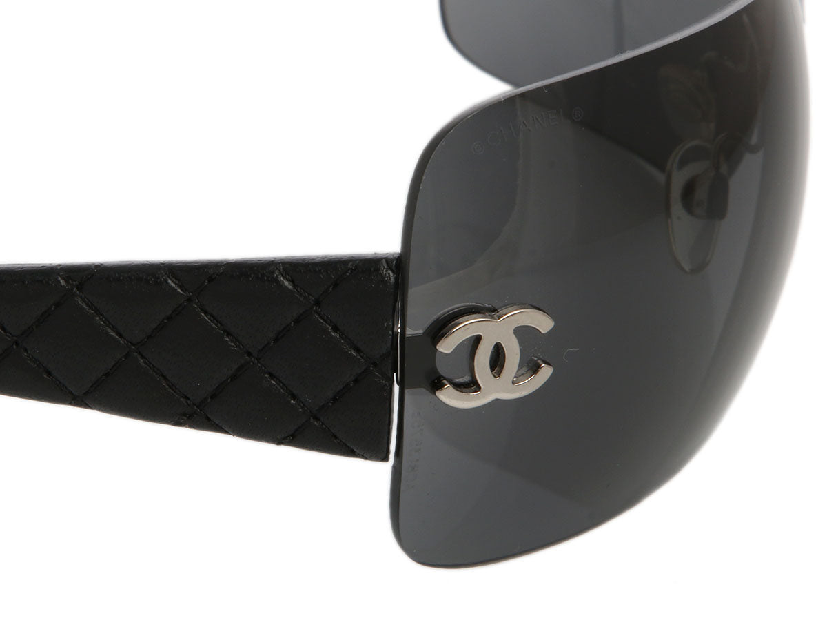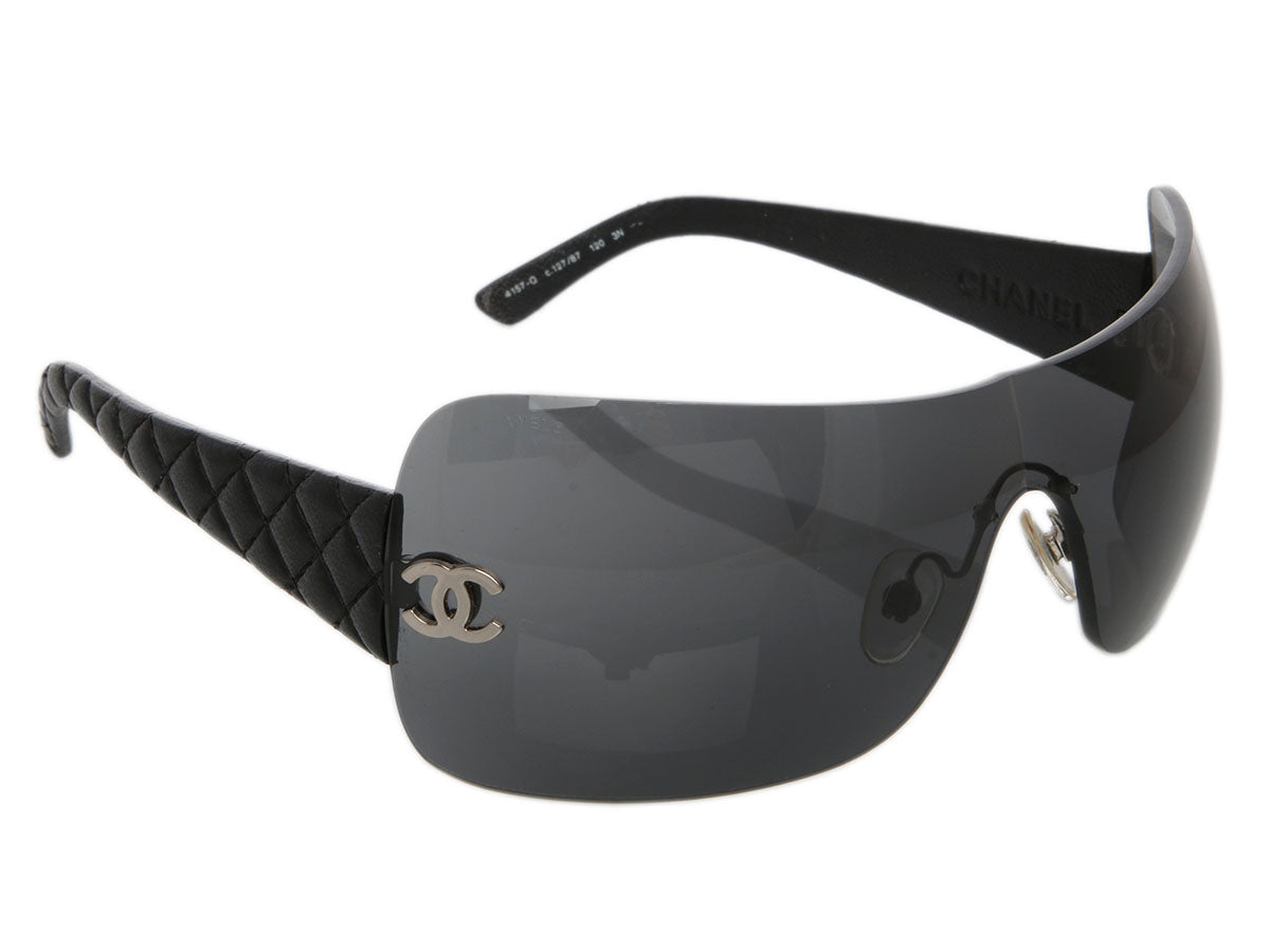 Block the sun like a true fashionista with Chanel’s Shield Sunglasses! With dark gray shield lenses, they have quilted black leather arms with silver CCs at the temples. In very good condition with a box, dustbag, and info booklet, there are a few faint scratches and marks on the lenses, and the leather on the arms is rubbed. Shield yourself from the rays in style!