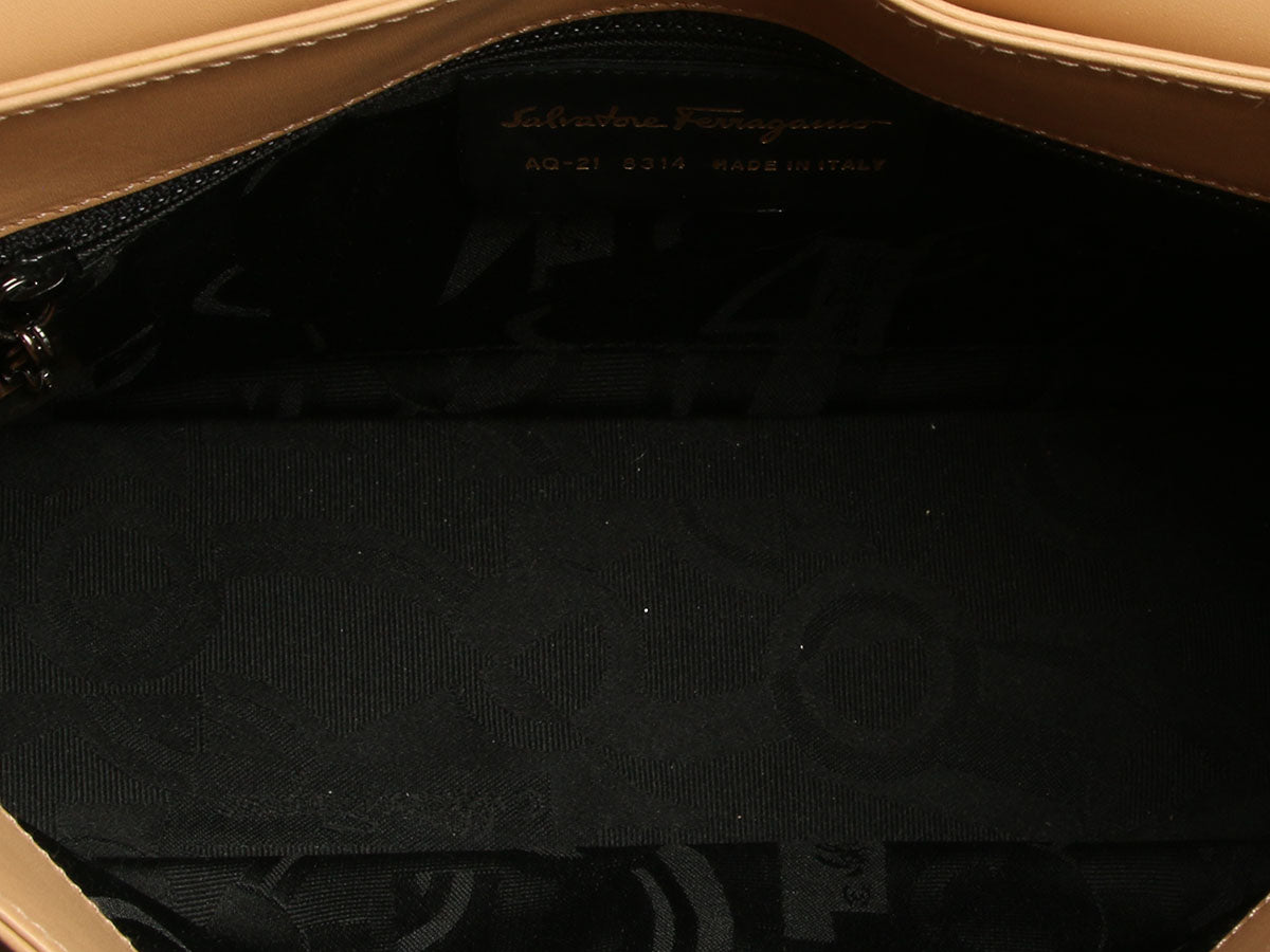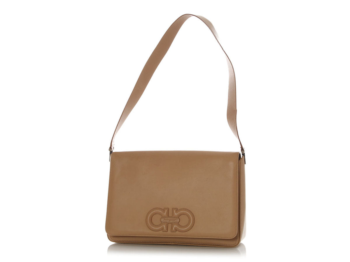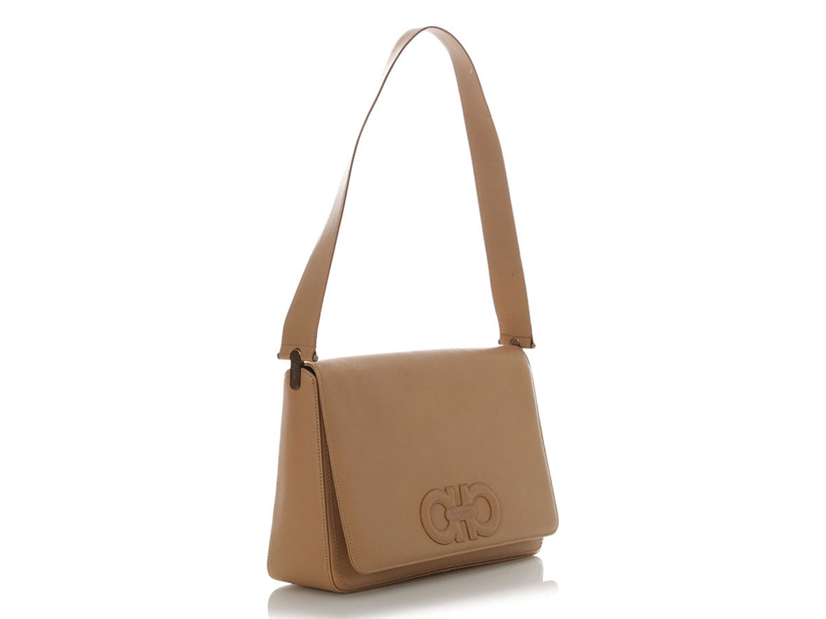 Ferragamo’s Vintage Beige Leather Flap Bag pairs neutral elegance with iconic house styling in a clean, structured shape! Made of beige leather with a horsebit motif stitched onto the front flap, it features gold logo hardware and a handle drop of 11.5 inches. The flap lifts to reveal a black fabric interior with one zip pocket. In good condition, it has wear on the corners, edges, and inside, scratches and small stains throughout, wear and loose threads on the strap, and scratches and tarnish on the hardware. It’s done some living but it still carries the effortless sophistication of classic Ferragamo!