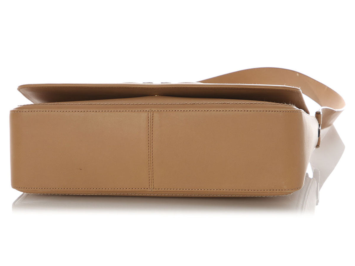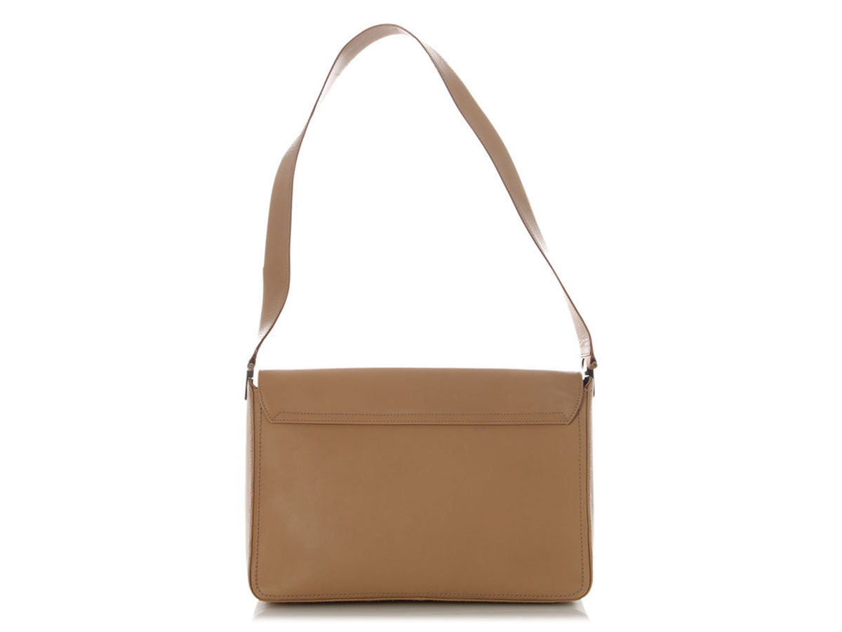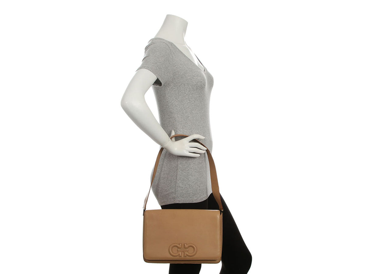 Ferragamo’s Vintage Beige Leather Flap Bag pairs neutral elegance with iconic house styling in a clean, structured shape! Made of beige leather with a horsebit motif stitched onto the front flap, it features gold logo hardware and a handle drop of 11.5 inches. The flap lifts to reveal a black fabric interior with one zip pocket. In good condition, it has wear on the corners, edges, and inside, scratches and small stains throughout, wear and loose threads on the strap, and scratches and tarnish on the hardware. It’s done some living but it still carries the effortless sophistication of classic Ferragamo!