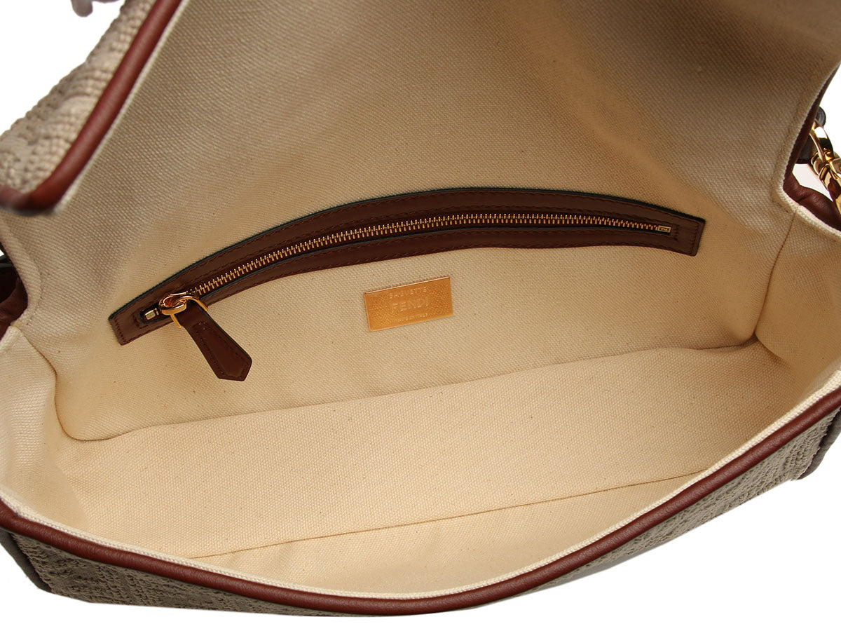 Fendi’s Beige Jacquard Sardo FF 1974 Baguette serves up timeless charm with modern versatility! Made of natural FF jacquard fabric with brown leather piping and trim that carries a rich red undertone, it secures with a magnetic flap and gleams with gold logo hardware. The detachable leather top handle offers a 3.75-inch drop, while the longer detachable jacquard strap in two shades of brown provides a 16.5-inch drop. Inside, you’ll find beige fabric lining and one zipped pocket. In great condition with a dustbag, it has faint, hairline scratches on the hardware and a glue mark on the back near the edge. It’s a handsome bag with two ways to carry it!