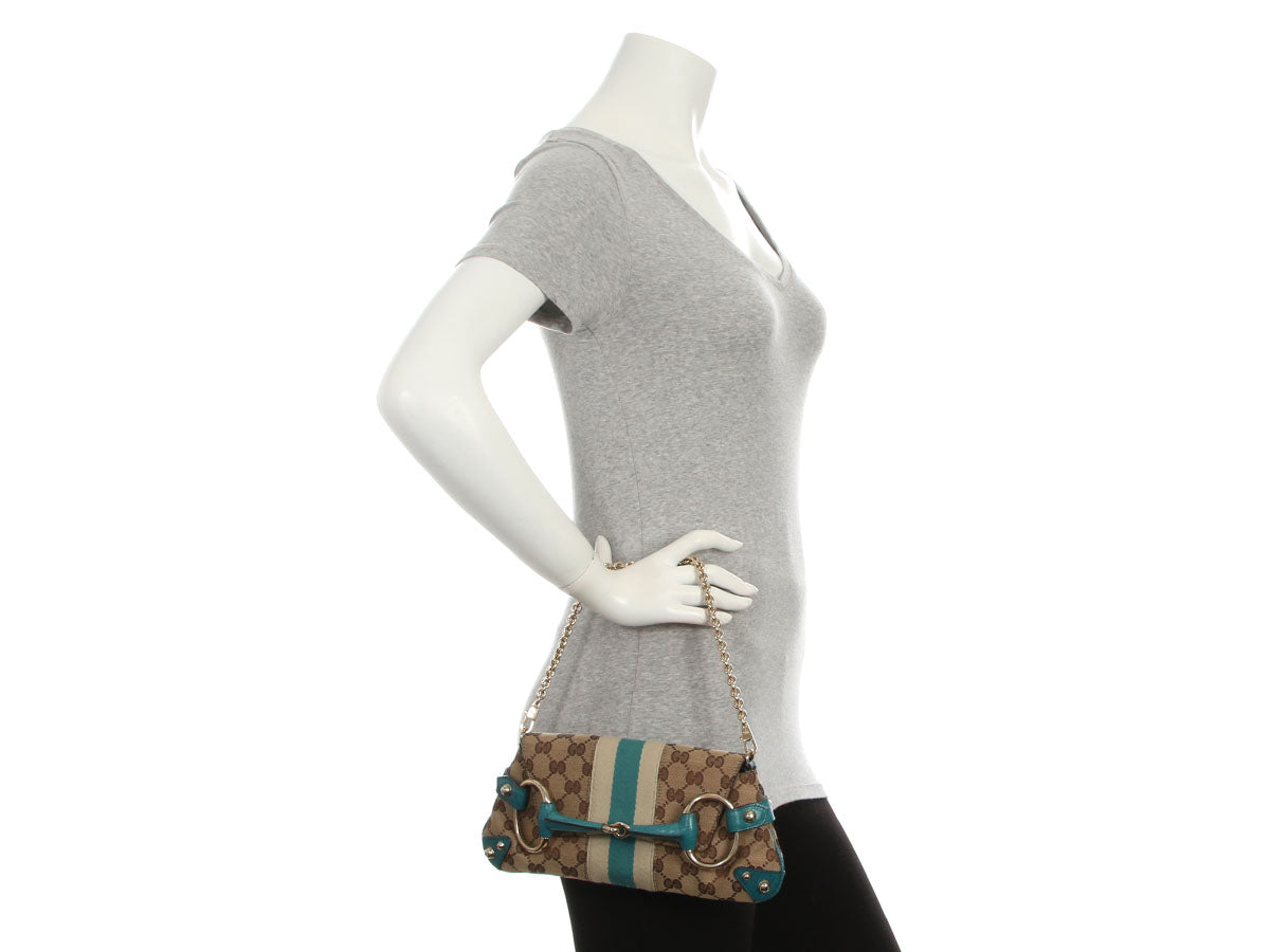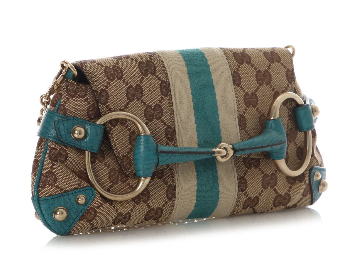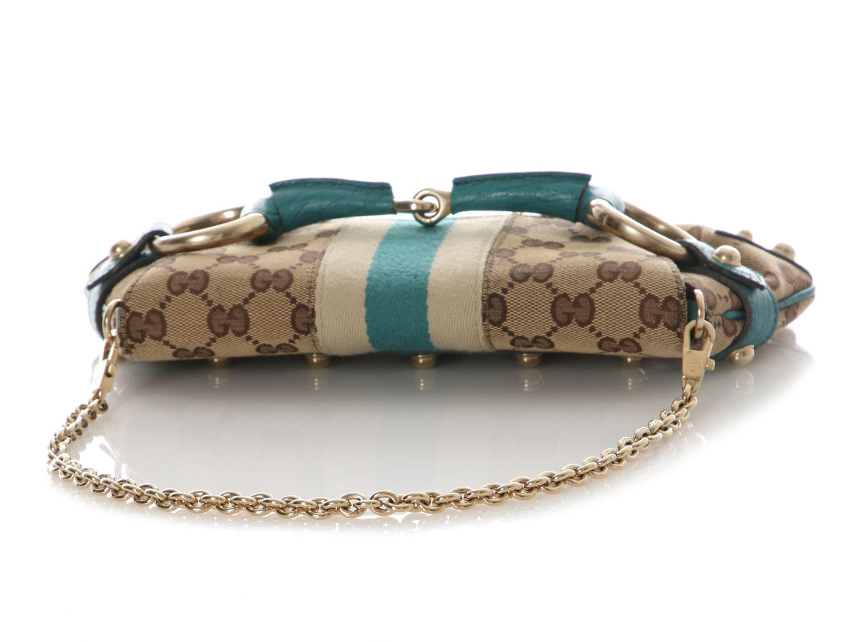 Gucci’s Small Teal and Monogram Horsebit Clutch is a petite piece that adds an eye-catching color combo to traditional Gucci style! Made of brown monogram canvas with teal leather piping and details, it has a beige-and-teal webbing stripe running down the center. The flap tucks under the gold horsebit hardware on the front, opening to textured teal leather, teal fabric, and one slide pocket inside. In very good condition, the hardware has some scratching, the leather has light scratching, the webbing has light pilling, the corners have light rubbing, there’s a small glue mark on the left side and a few faint marks inside. With a 7-inch drop on the detachable strap, it’s a cool color combo for a fun, feminine take on a classic Gucci look!