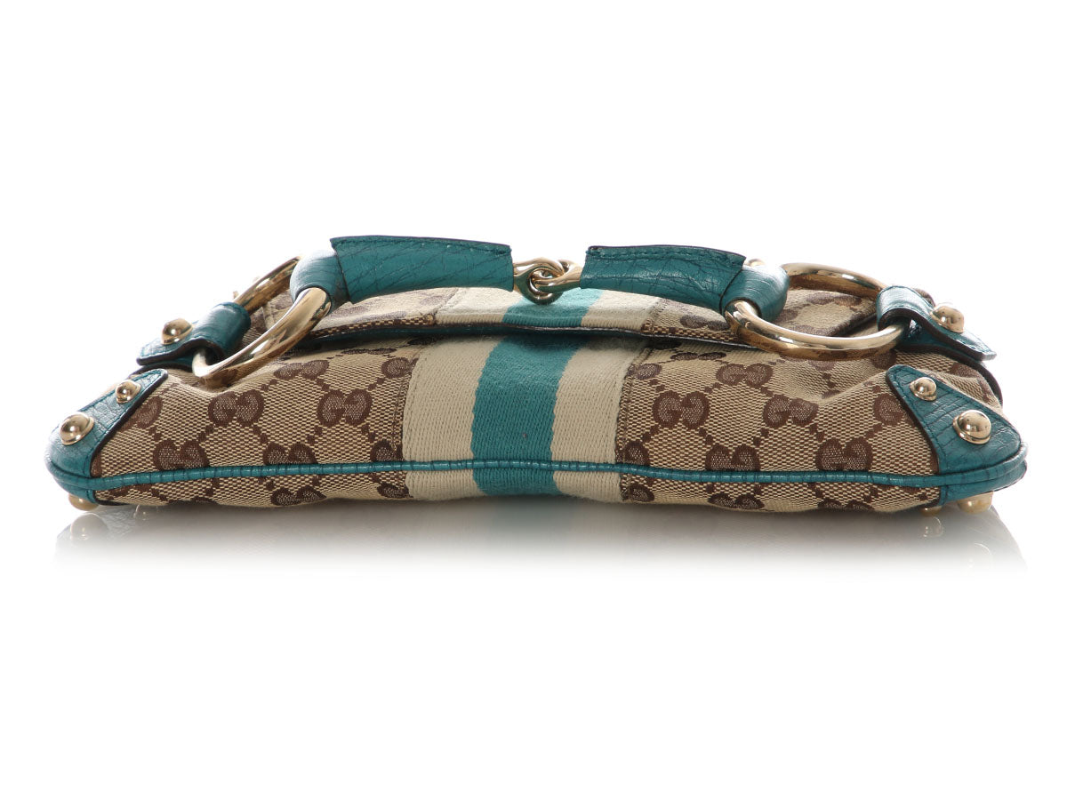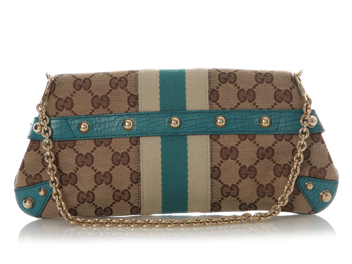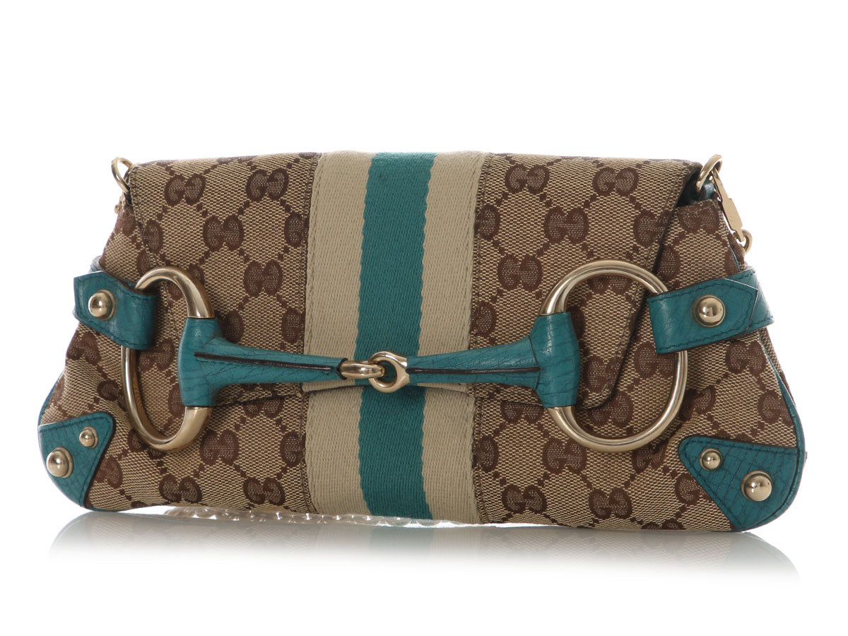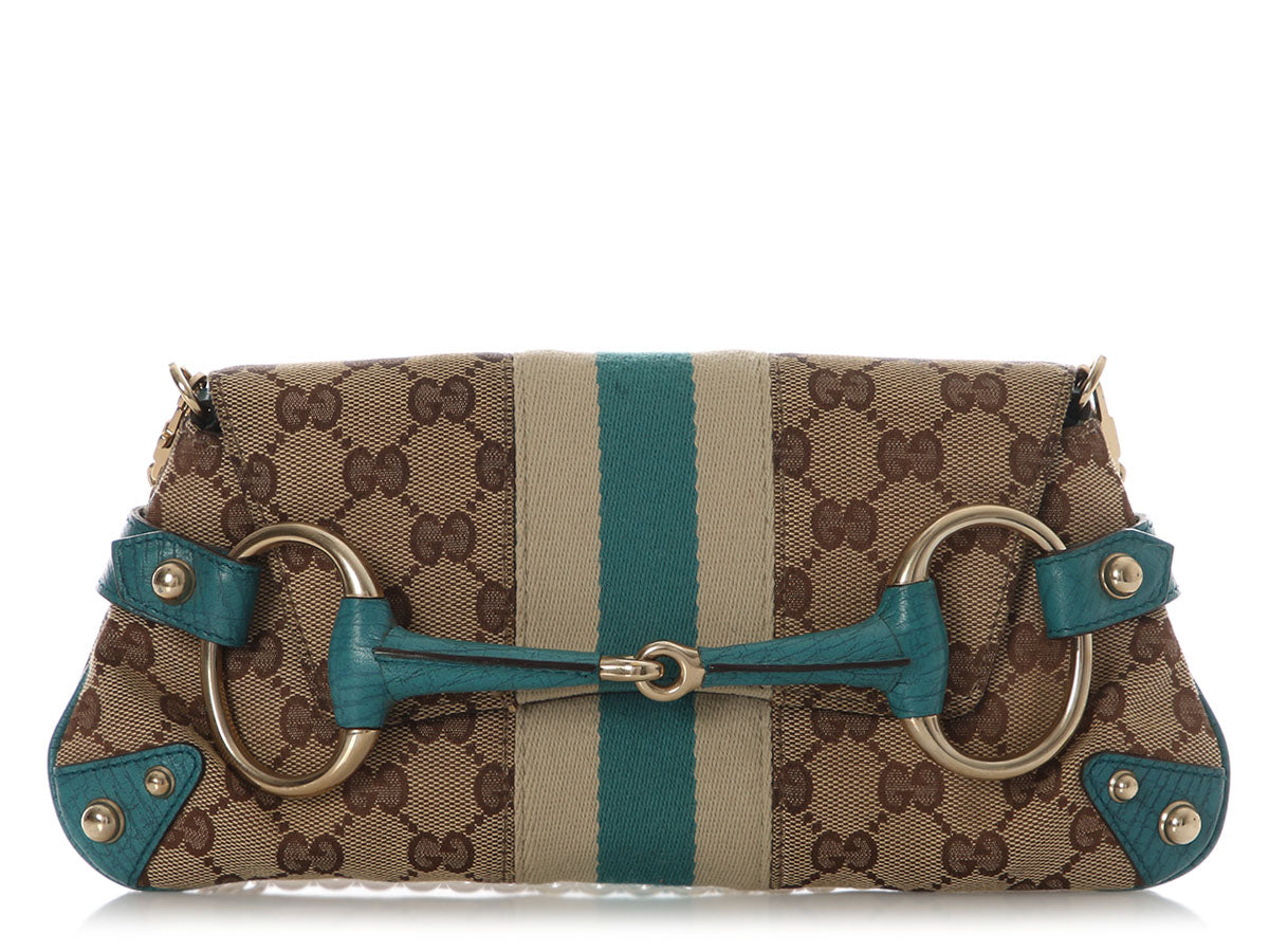Gucci’s Small Teal and Monogram Horsebit Clutch is a petite piece that adds an eye-catching color combo to traditional Gucci style! Made of brown monogram canvas with teal leather piping and details, it has a beige-and-teal webbing stripe running down the center. The flap tucks under the gold horsebit hardware on the front, opening to textured teal leather, teal fabric, and one slide pocket inside. In very good condition, the hardware has some scratching, the leather has light scratching, the webbing has light pilling, the corners have light rubbing, there’s a small glue mark on the left side and a few faint marks inside. With a 7-inch drop on the detachable strap, it’s a cool color combo for a fun, feminine take on a classic Gucci look!