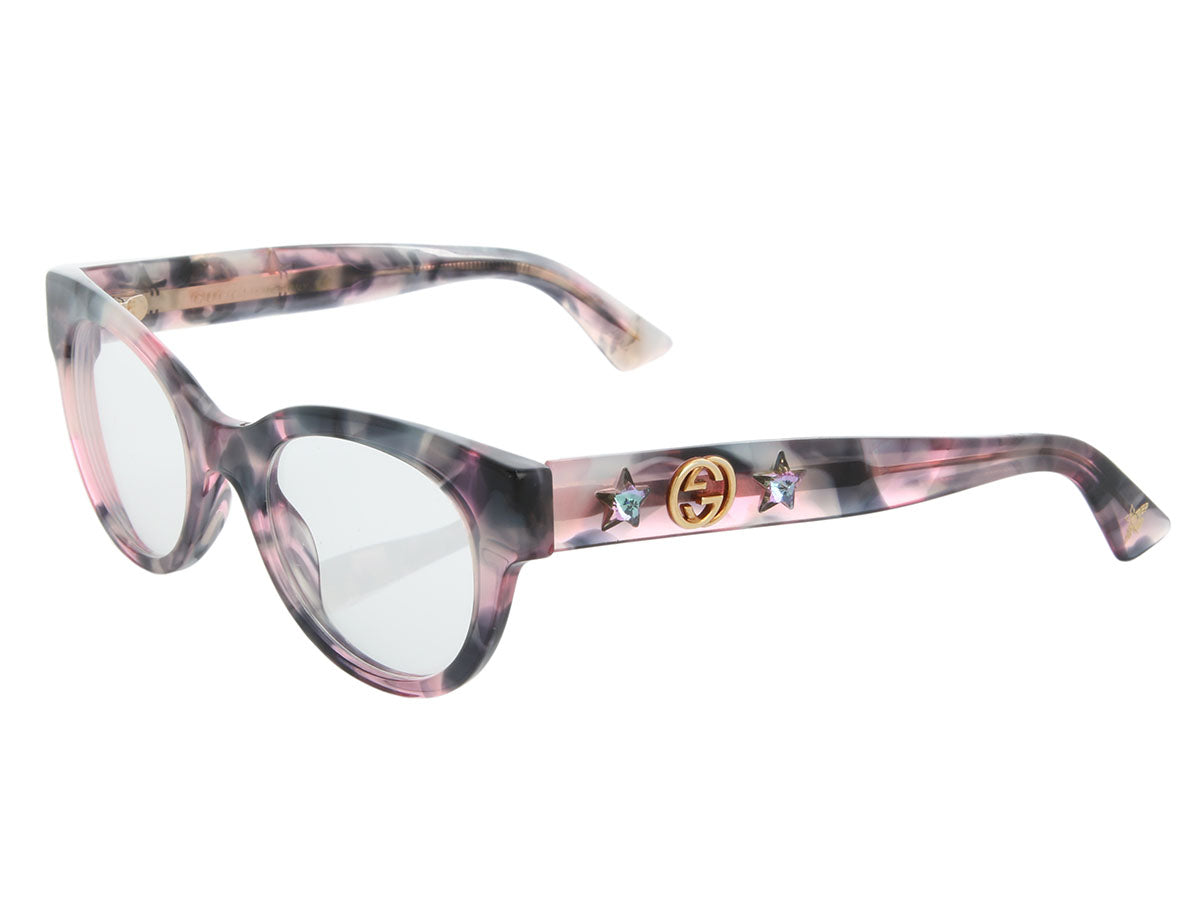 Gucci’s Purple Marbled Crystal Star Glasses shimmer with playful color and celestial charm! Made of semi-transparent acetate swirling with purples and pinks, they feature gold GG logos at the temples, crystal star accents on each side, and tiny bees at the arm ends for an extra whimsical touch. In great condition with a case, pouch, and prescription lenses, they have light scratches throughout. Vibrant and beautifully detailed, these specs add instant personality to any look!
