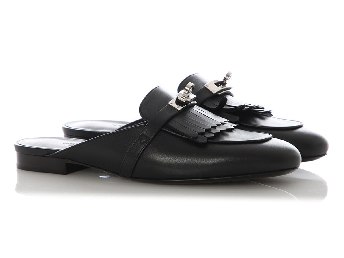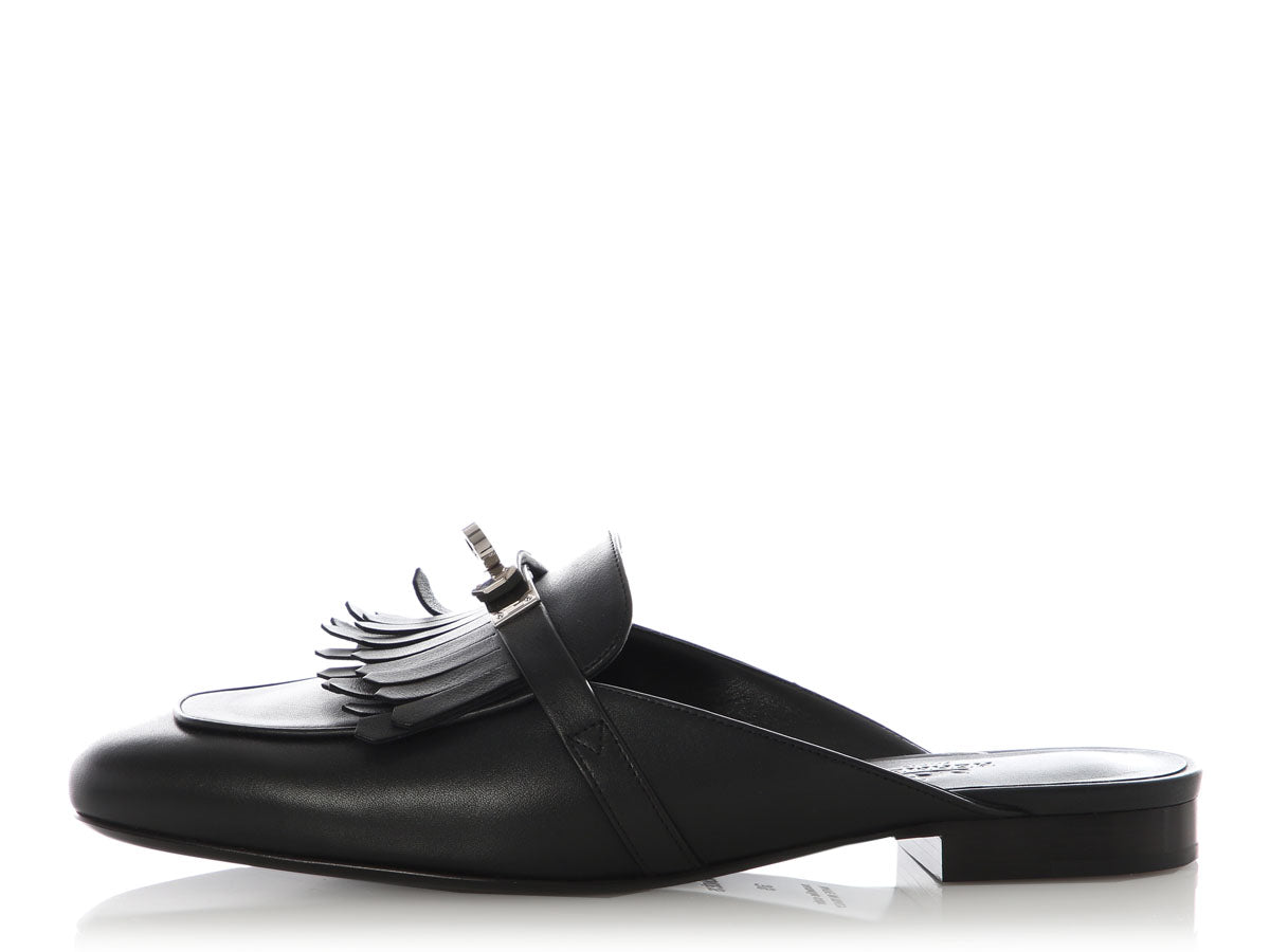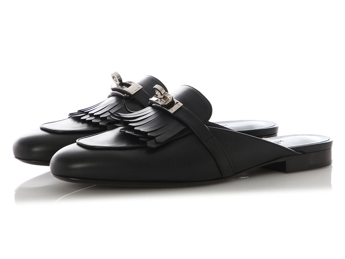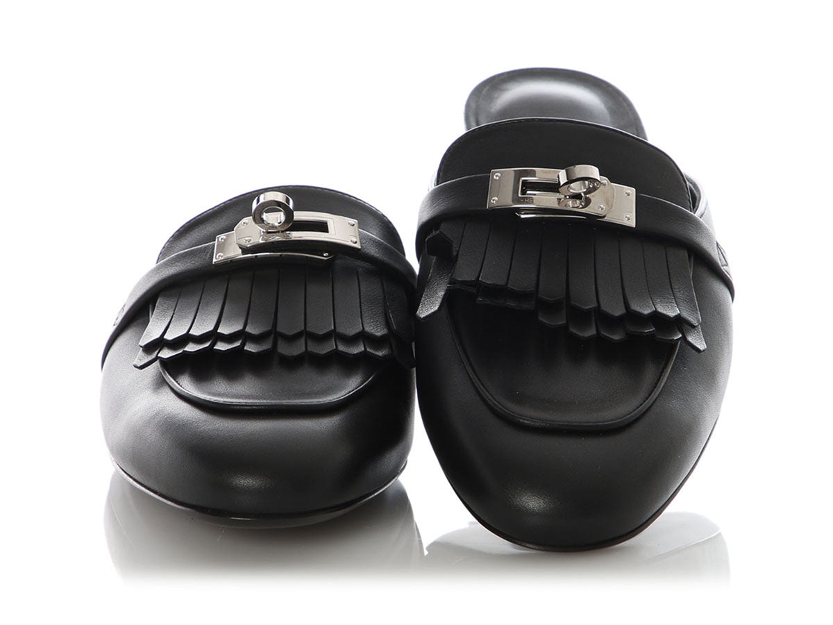 Hermès’ Black Loafer Slides are effortless and elevated, blending smooth black leather with fringe detailing and petite Kelly lock hardware for a refined nod to the house’s heritage! Easy to slip on with a comfortable 0.5-inch heel, they feature leather inners and soles that give them a timeless, everyday versatility. In excellent condition with box and two dustbags, they have a scratch on the left shoe, although I don’t believe they’ve been worn. Understated yet unmistakably Hermès, these slides bring polished style to any ensemble!