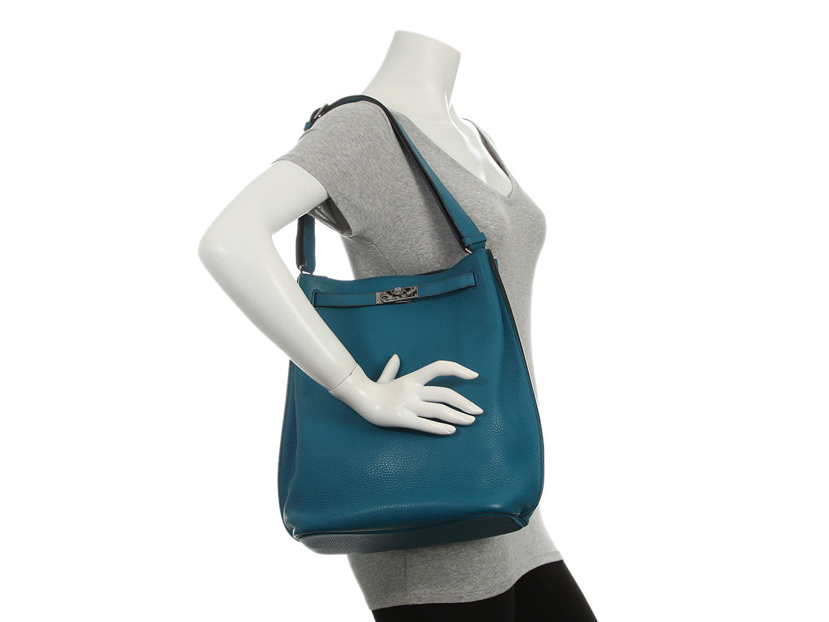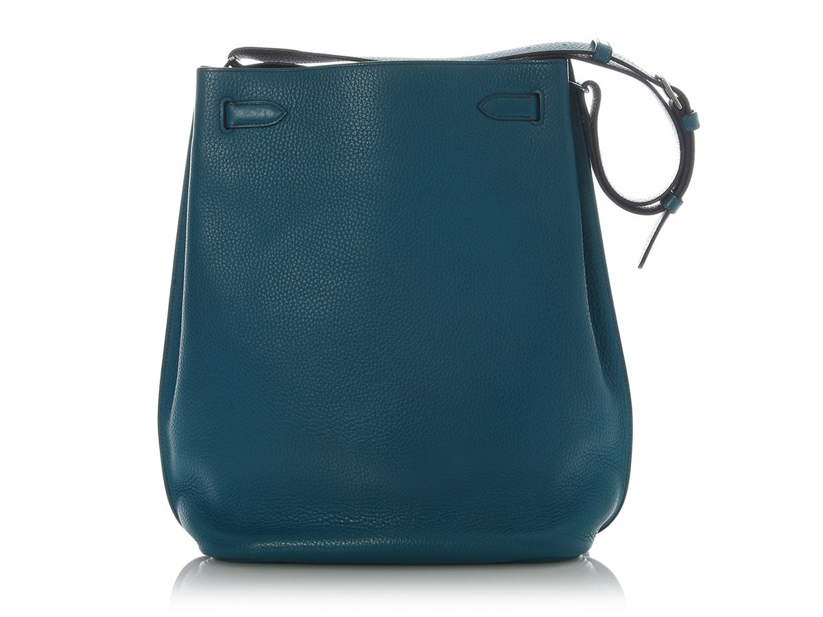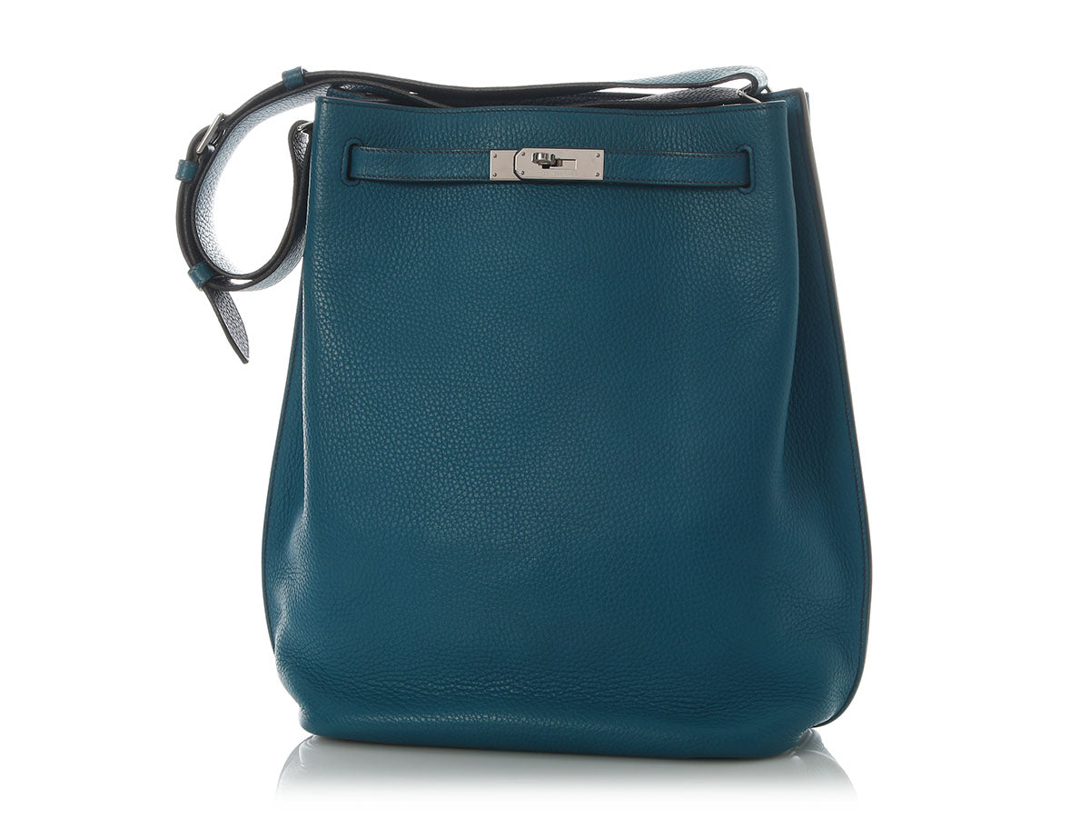 Hermès’ Bleu Izmir and Bleu Saphir Clémence Verso So Kelly 26 is one long, cool drink of style! The flat single strap, shown here with a drop of 9 inches, has buckle hardware that allows it to be lengthened for crossbody wear. The open top cinches closed with an Hermès turnlock and the interior, in sapphire-blue leather lining, has one zipped and one slide pocket. In very good condition and stamped with a Q in a square, it has wear on the corners, edges, hardware, strap, and inside. The flat bottom of this sturdy So Kelly can stand up to anything you dish out and no matter how much you cram in, it’s a mere drop in the bucket bag!