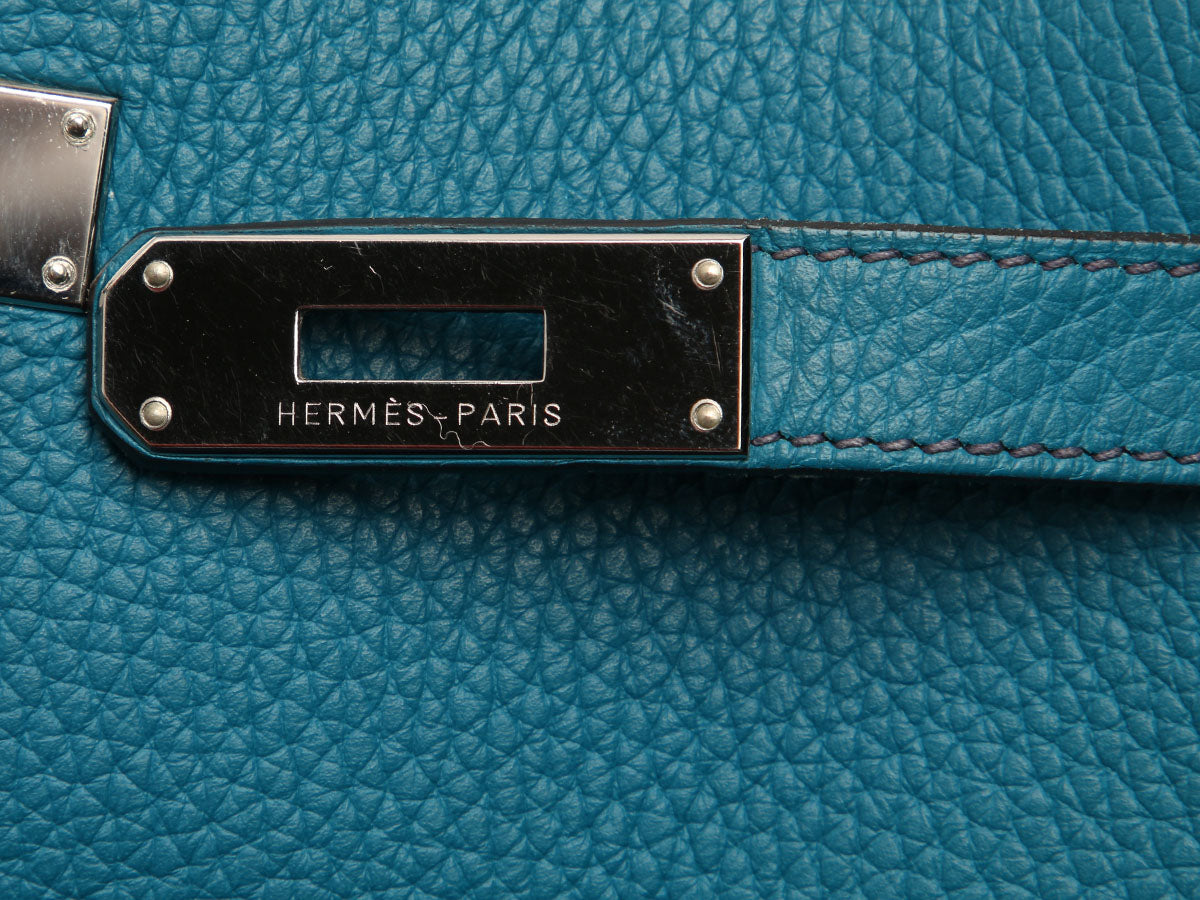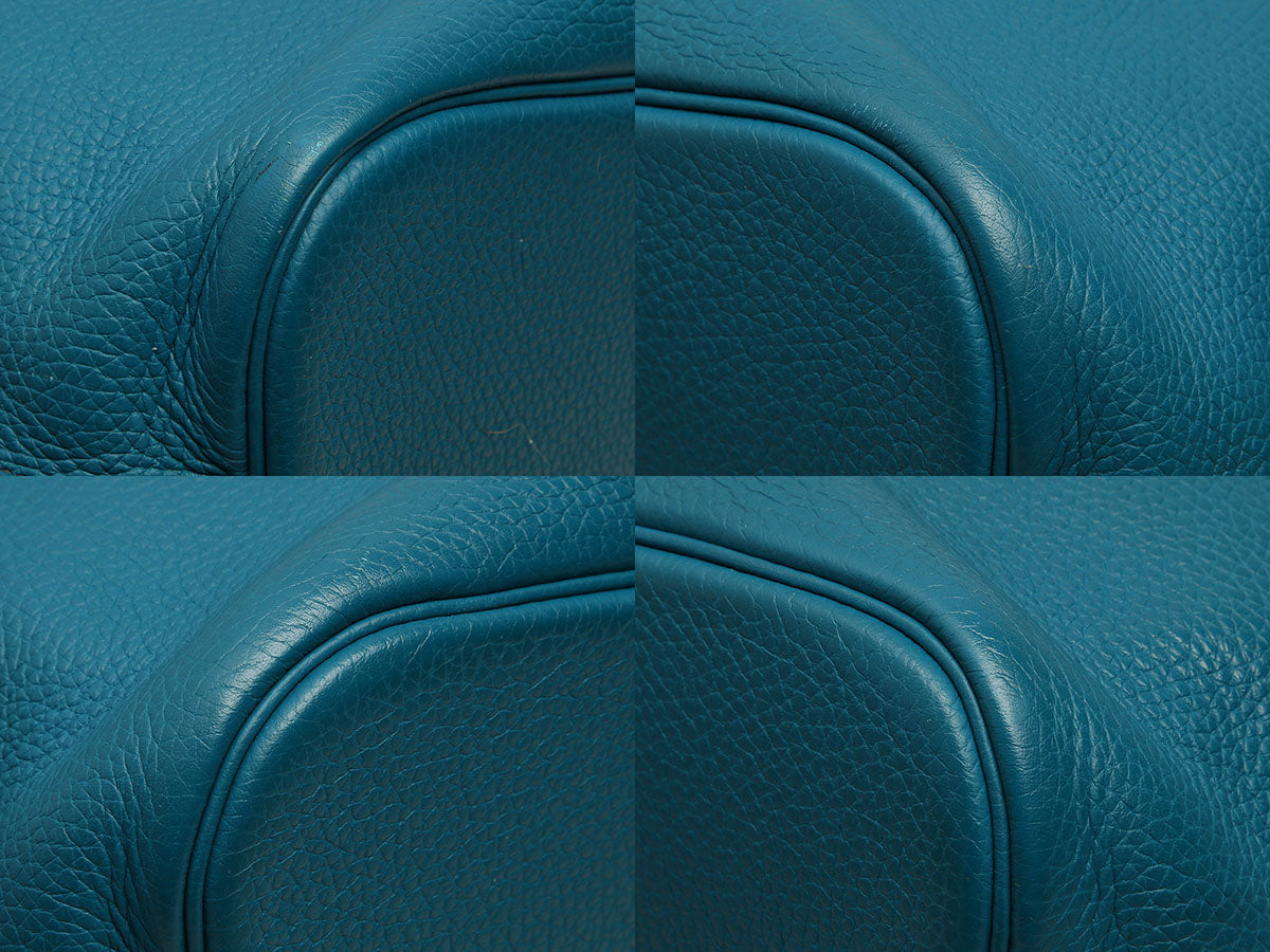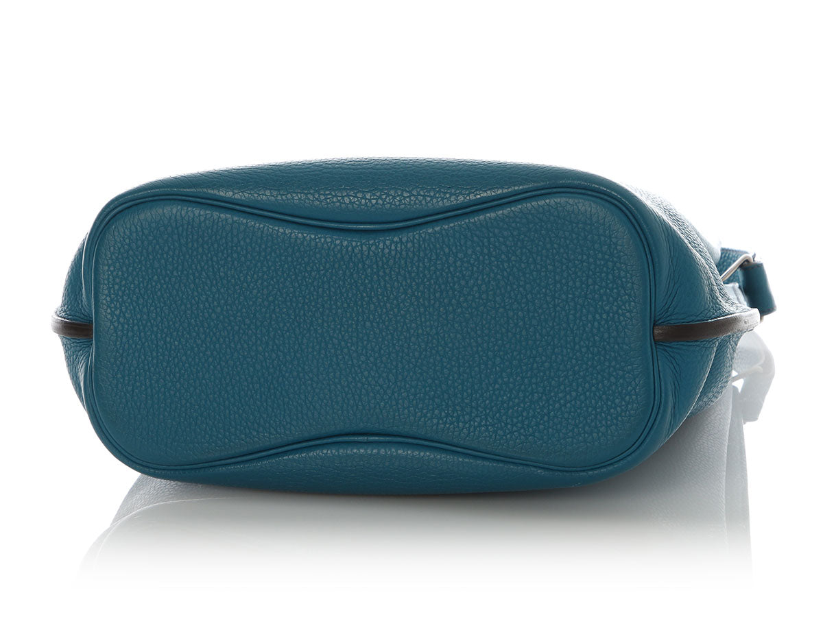 Hermès’ Bleu Izmir and Bleu Saphir Clémence Verso So Kelly 26 is one long, cool drink of style! The flat single strap, shown here with a drop of 9 inches, has buckle hardware that allows it to be lengthened for crossbody wear. The open top cinches closed with an Hermès turnlock and the interior, in sapphire-blue leather lining, has one zipped and one slide pocket. In very good condition and stamped with a Q in a square, it has wear on the corners, edges, hardware, strap, and inside. The flat bottom of this sturdy So Kelly can stand up to anything you dish out and no matter how much you cram in, it’s a mere drop in the bucket bag!