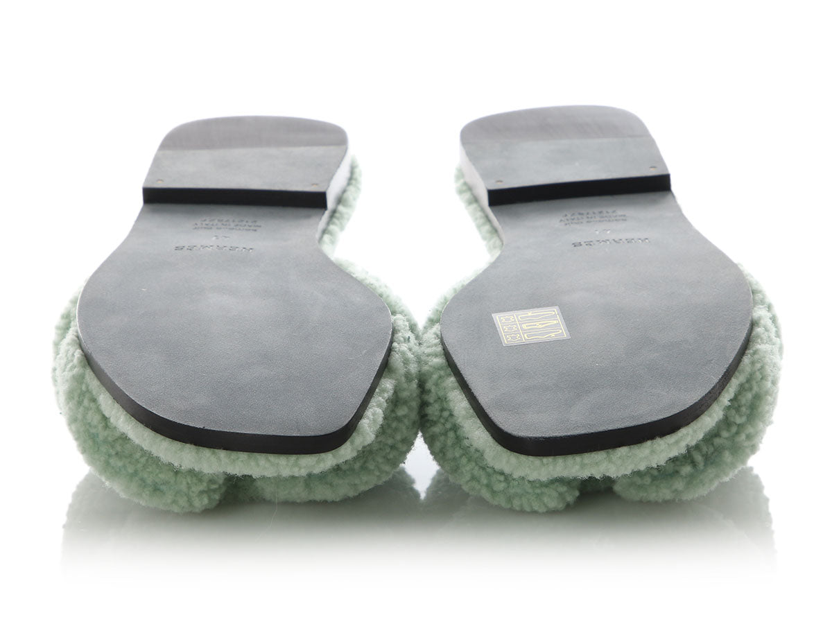 Hermès’ Vert d’Eau Woolskin Oran Sandals turn cozy comfort into pure luxury! These ultra-soft slides are crafted from plush green woolskin in the house’s iconic H-cut silhouette and feature shearling inners with smooth leather soles for effortless wear. Brand new with a box and two dustbags, they’re perfect for lounging in style or adding a touch of Hermès chic to your casual days!