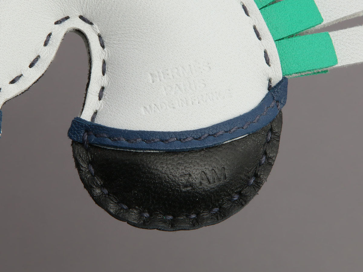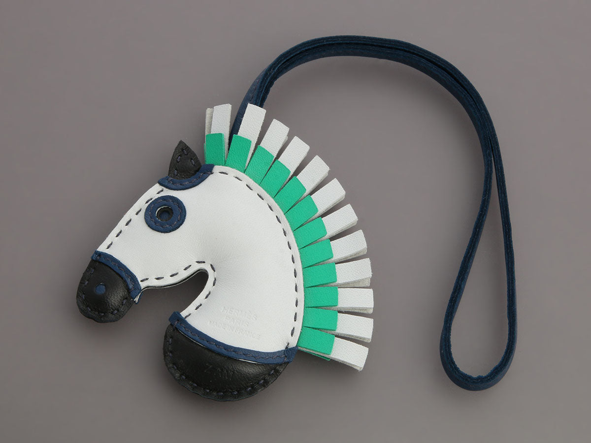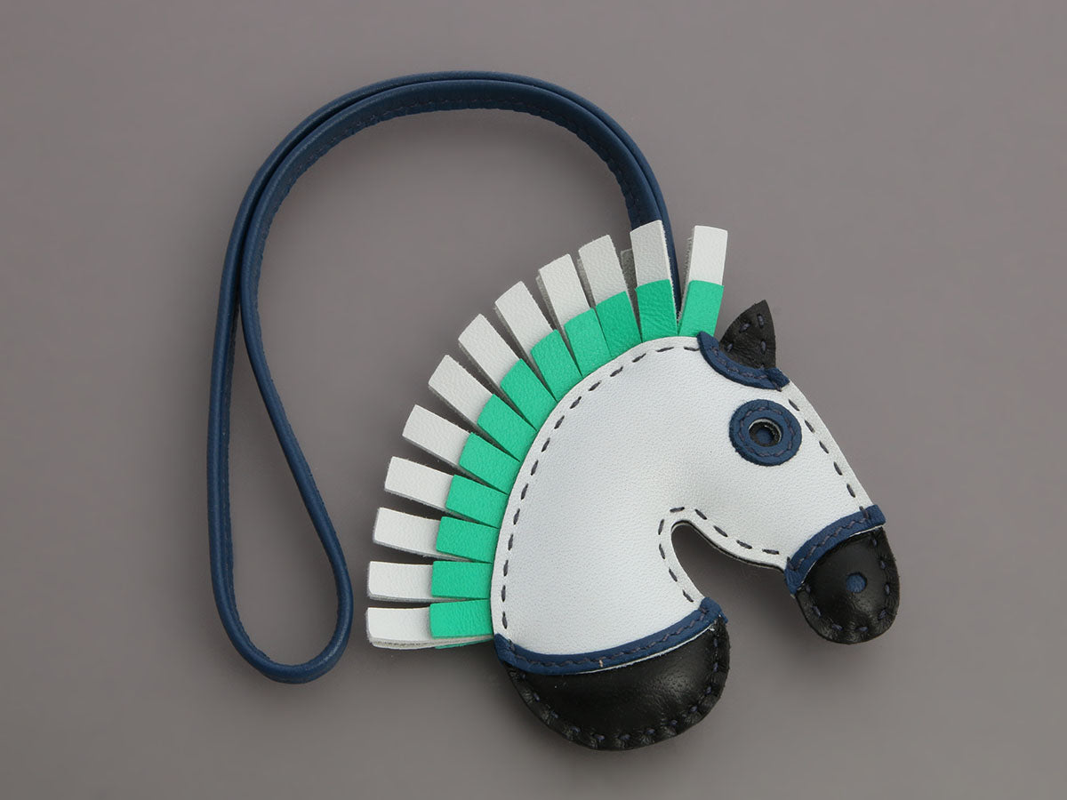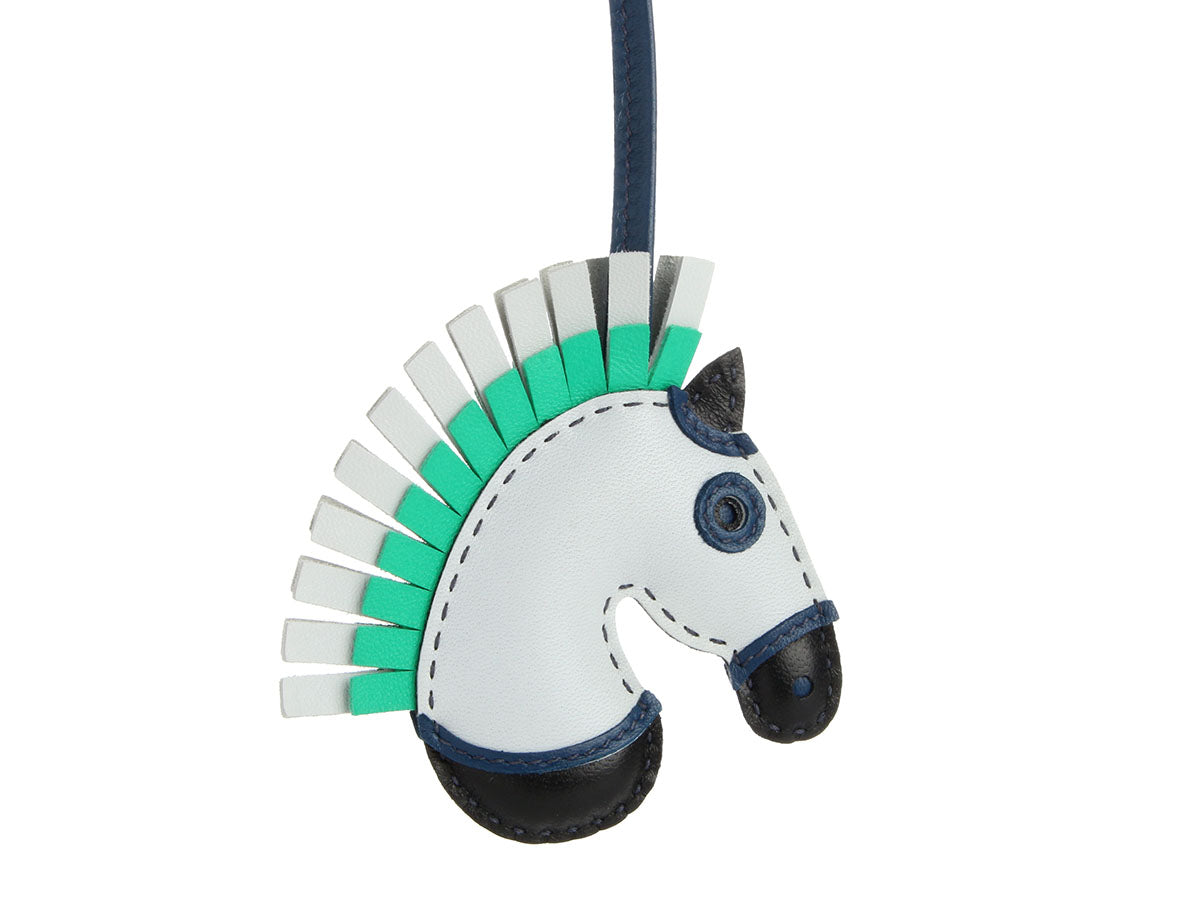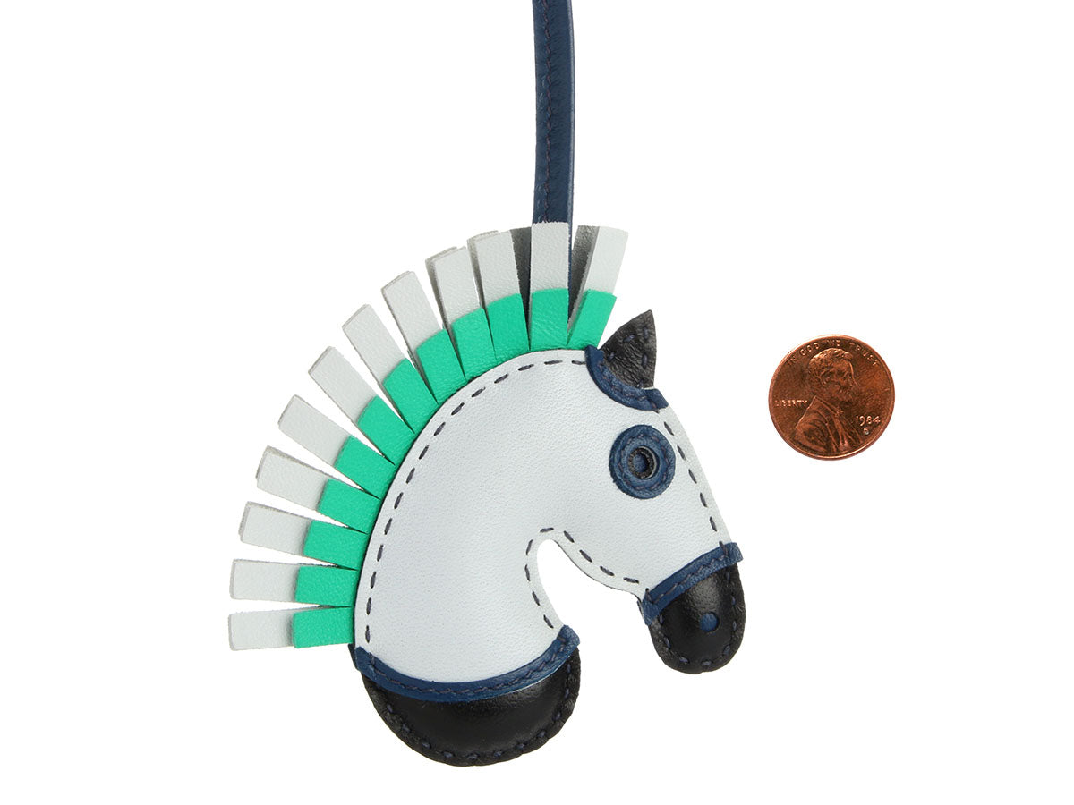 Hermès’ Lambskin Geegee Camail Bag Charm PM in Light Blue, Black, and Green brings a playful pop of color to your favorite bag! Crafted from Milo lambskin with no hardware, this charming hooded horse ties to your Hermès handle with a leather leash with a 6.5-inch drop. New and never worn from 2021 (Z stamp), it comes with a box. This incognito beauty is ready to trot straight into your heart!