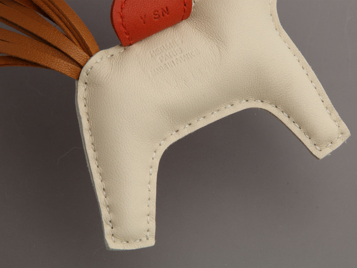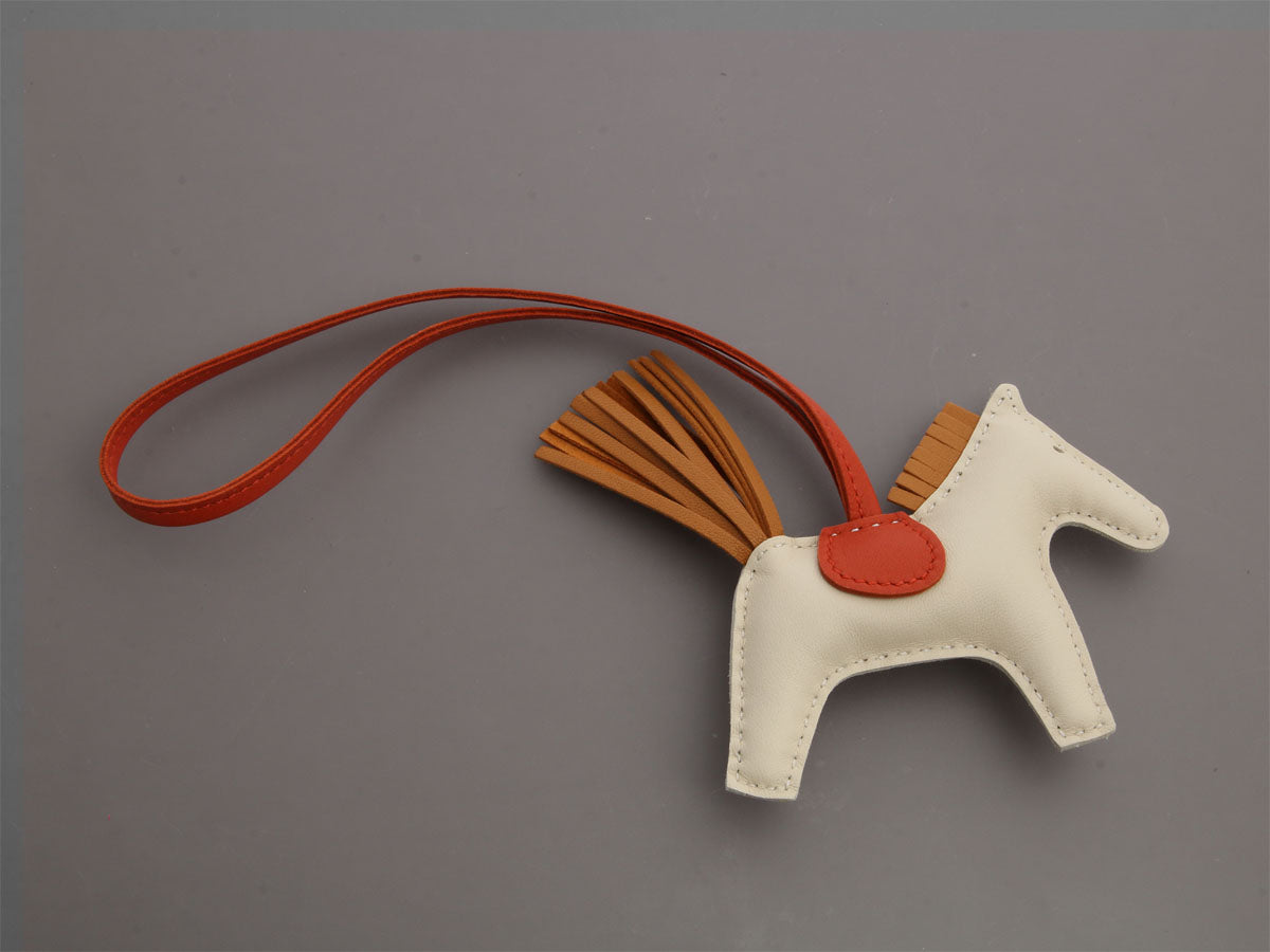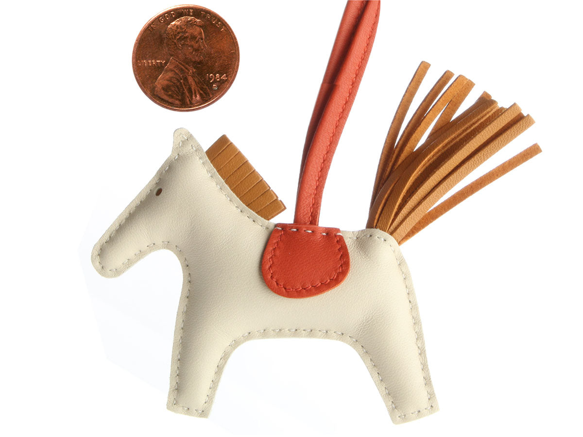 Hermès’ Craie Lambskin Rodeo Grigri Bag Charm PM is ready to go for a ride on your bag, zipper pull, belt, or even your wrist! It’s crafted of cream Milo lambskin (the kind reserved for fine glove making) with a Sesame mane and tail and Coraline saddle (lift it up to see the Hermès logo) and leash with a 7-inch drop. Brand new from 2020 (Y stamp), it comes with a box. This adorable little pony is ready to have its legs stretched!