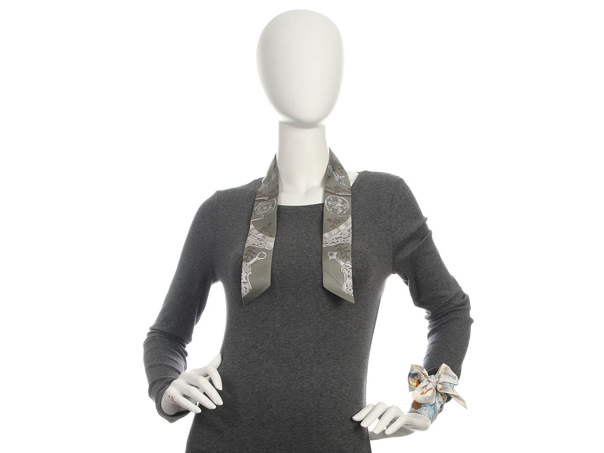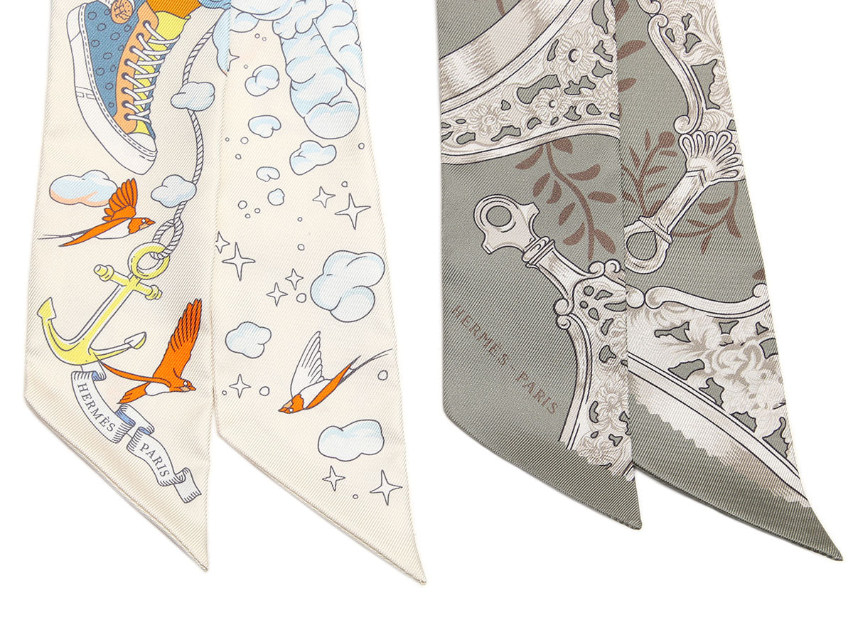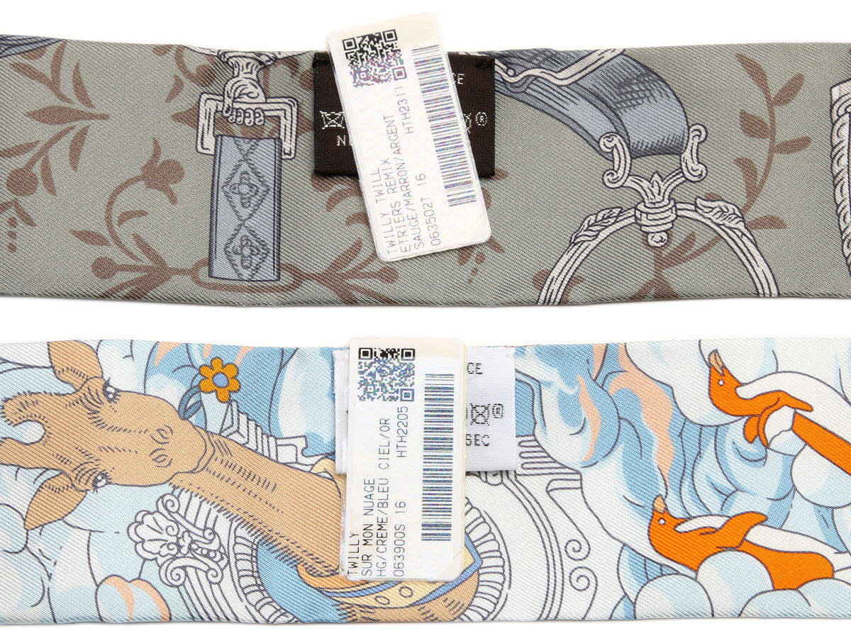 Hermès’ Etriers Remix and Sur Mon Nuage Twilly Pair are a colorful combo to dress up your life! Made of 100% silk, the Sur Mon Nuage design is in cream, bleu ciel, and or, while the Etriers Remix is in sauger, marron and argent. New and never worn with a box for each and the tags attached, the Sur Mon Nuage is a Dimitri Rybaltchenko design and the Etriers is by Françoise de La Perrière. Accent your bag, hair, or outfit in luxurious style!