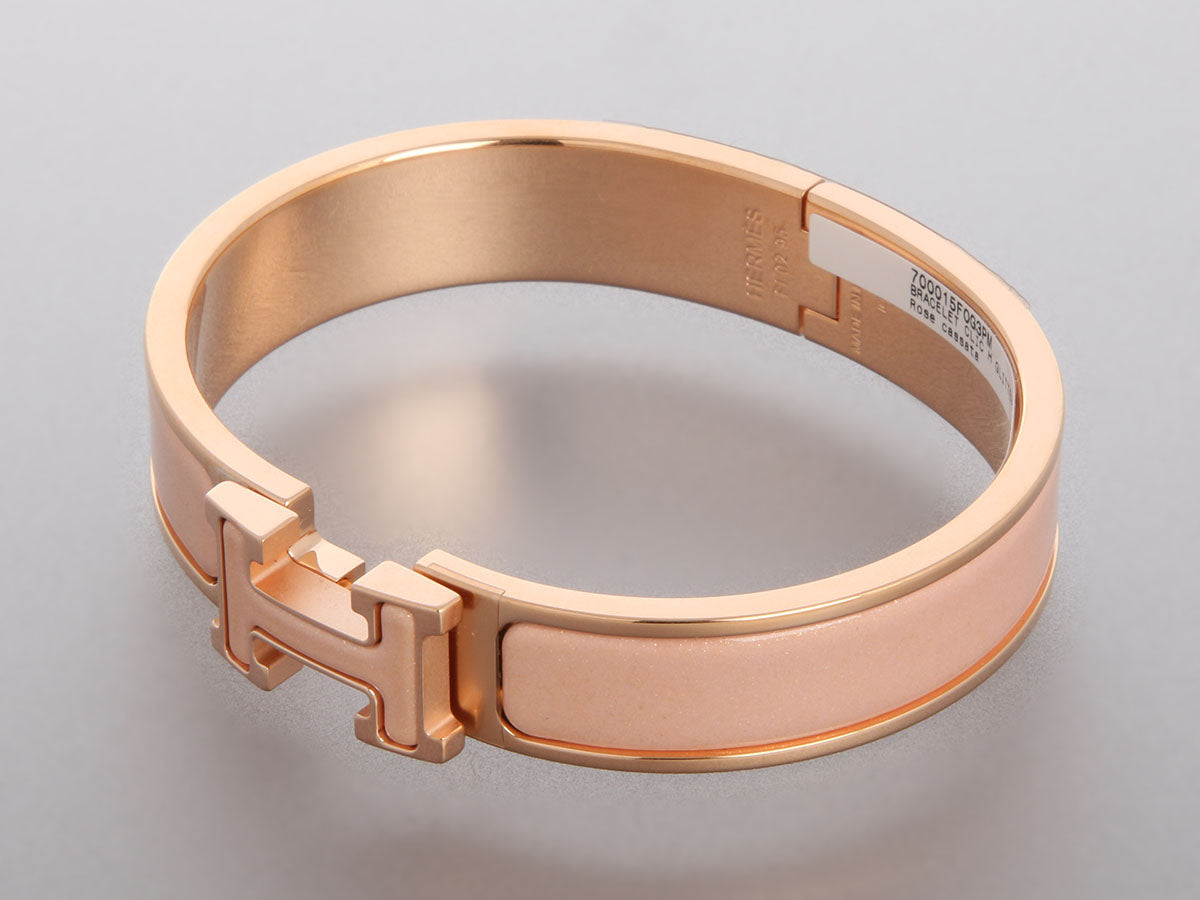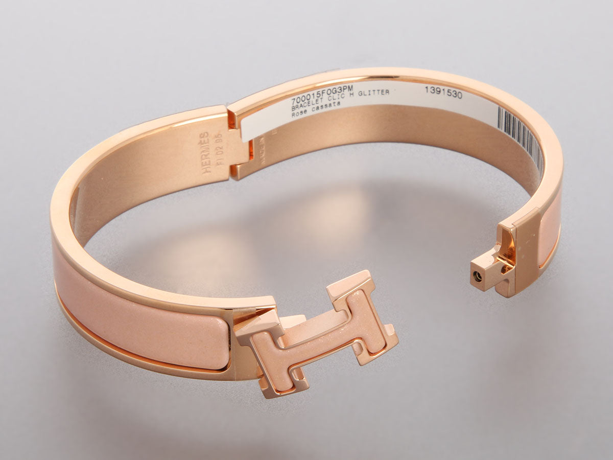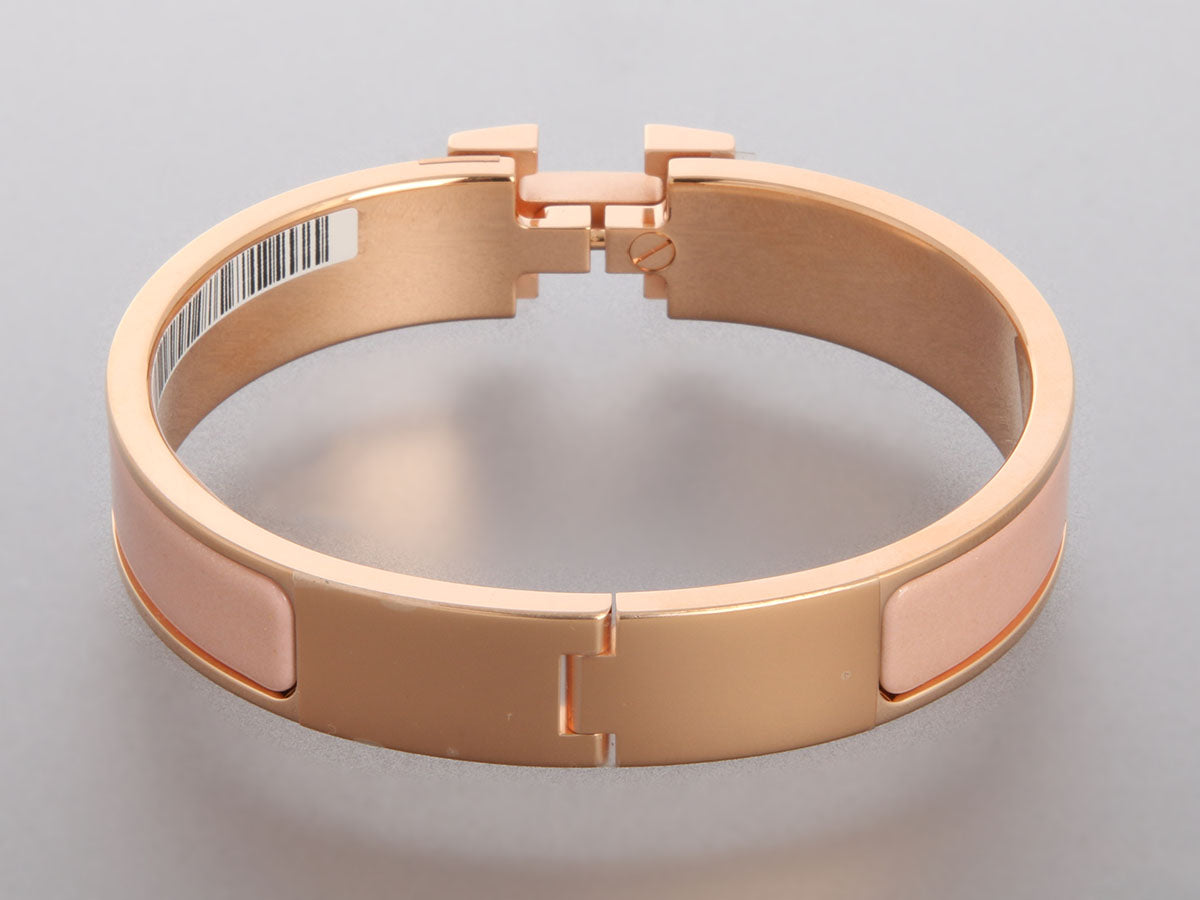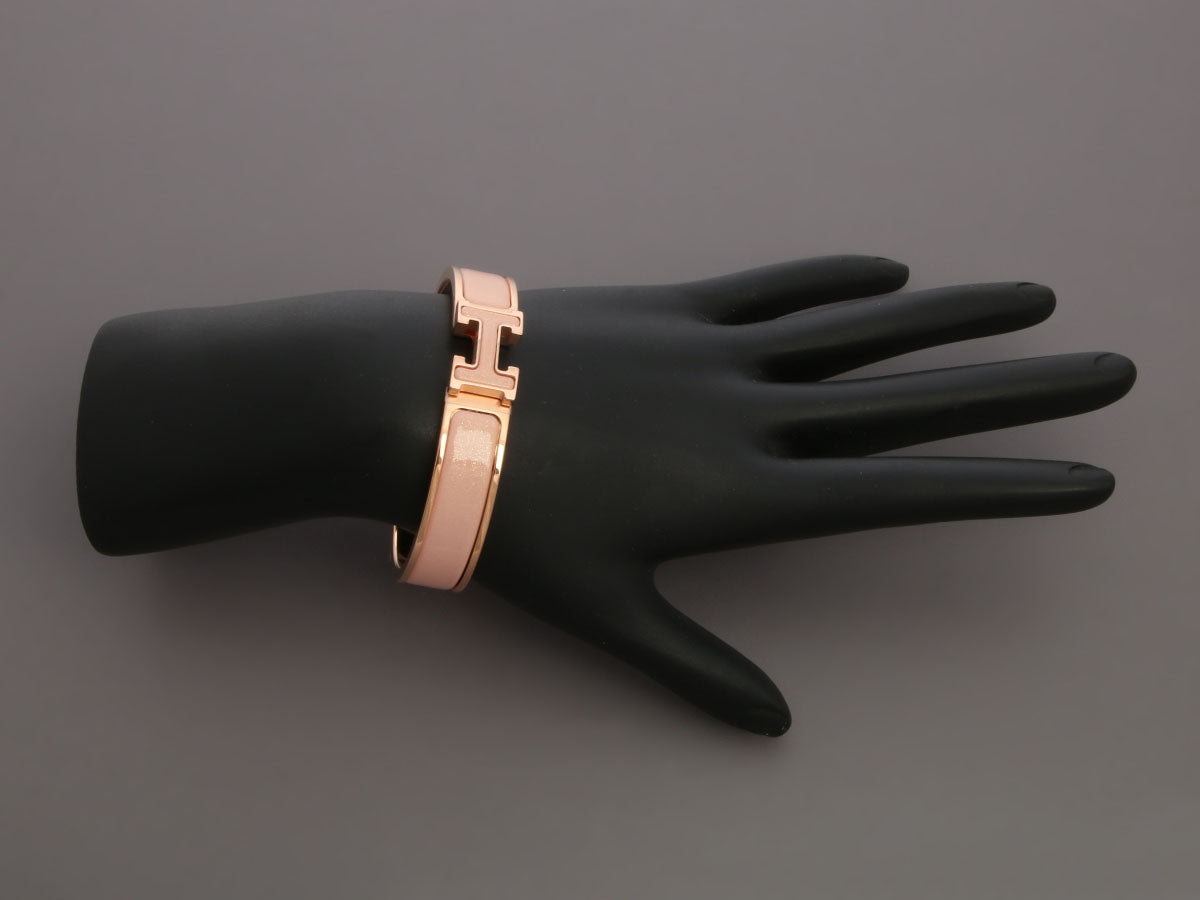 This Hermès Narrow Glittery Pink Clic-Clac Bracelet dazzles with a blushing shimmer that feels effortlessly chic! It comes brand new with a box, pouch, and plastic still on the rose gold hardware. With a swivel H closure and sparkling rose cassetta enamel, it measures 11 millimeters wide and is a pretty little pop of shine you can wear alone or stack for extra sparkle!