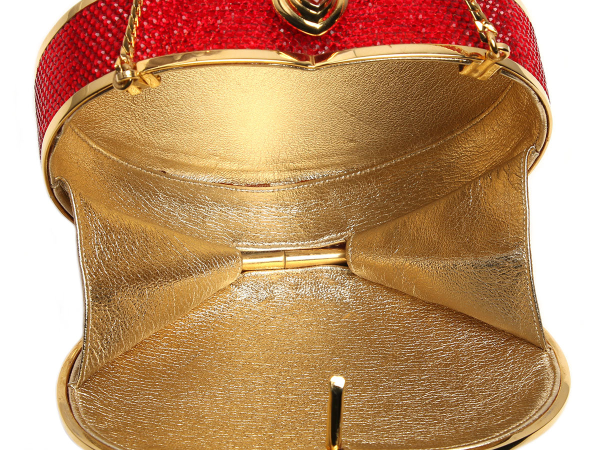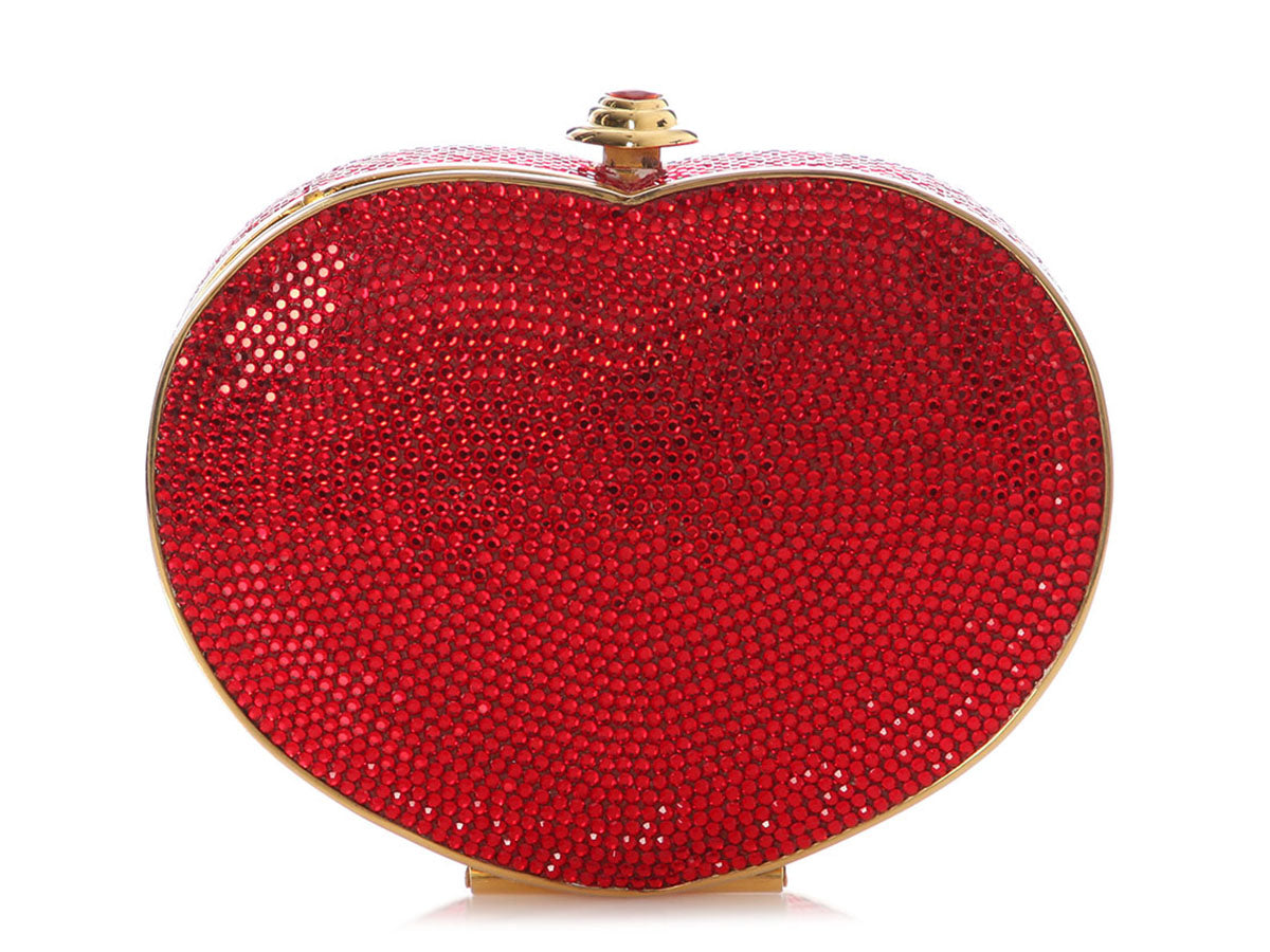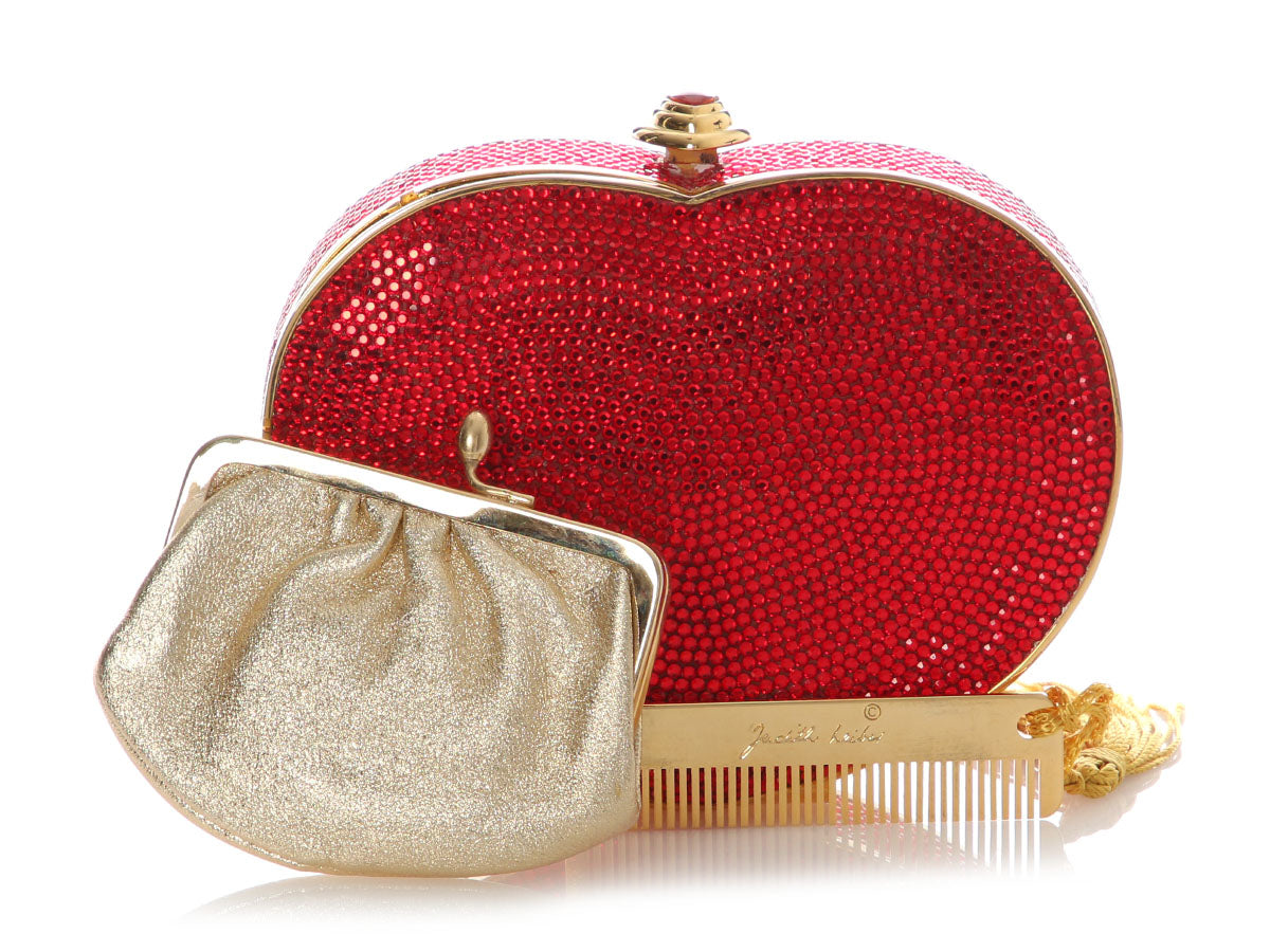 Accent a lovely look on an evening out with Judith Leiber’s Red Crystal Heart Minaudière! Made of metal that is covered in red crystals, the clasp is a red heart cabochon that opens to gold leather inside, while the gold chain strap has a 19.5-inch drop. In very good condition with a dustbag, comb, and pouch with a kiss lock, the gold hardware is scratched, the pouch is missing one clasp on the kiss lock, and the leather inside has some scratches. You’re going to heart the look of this heart!