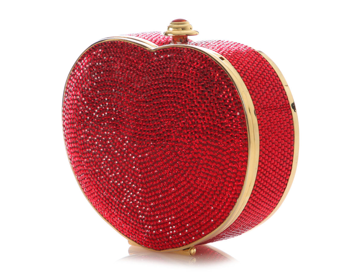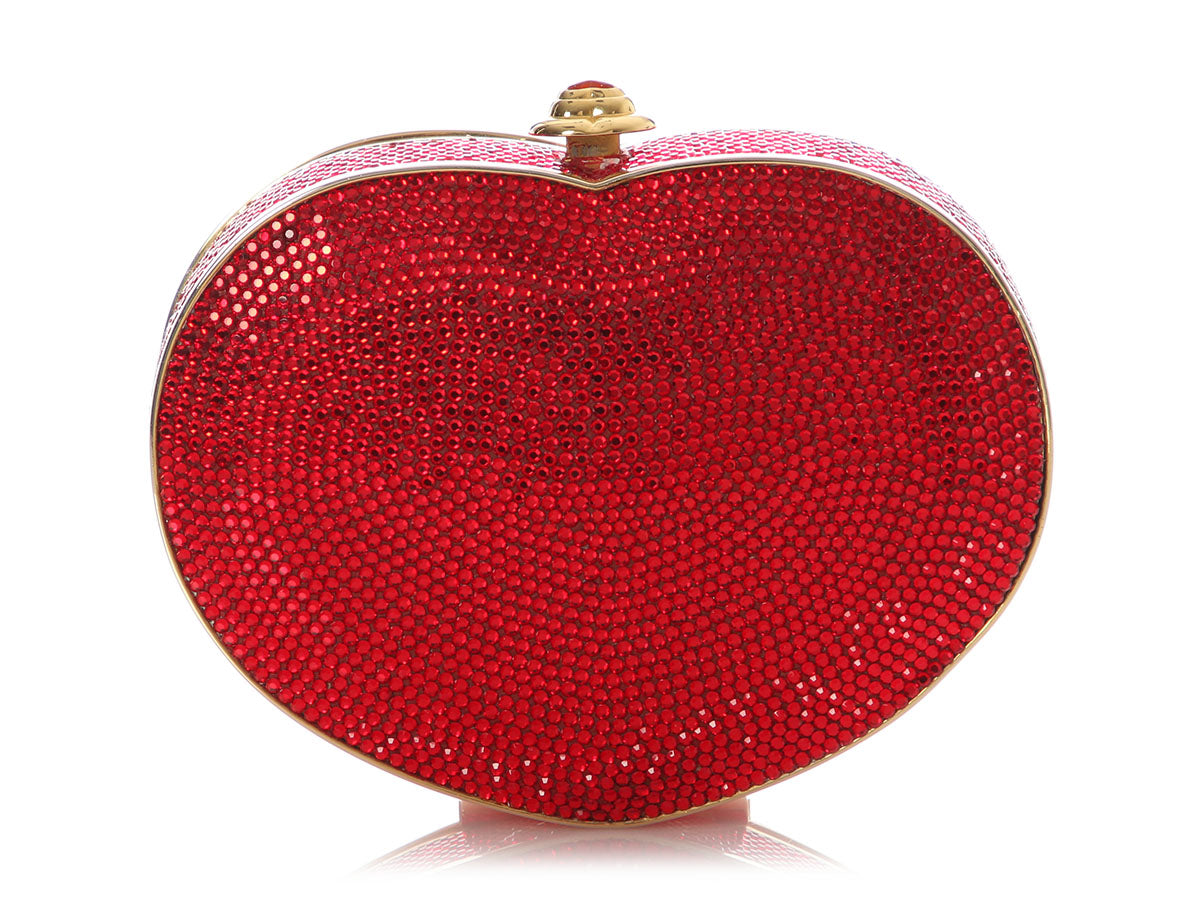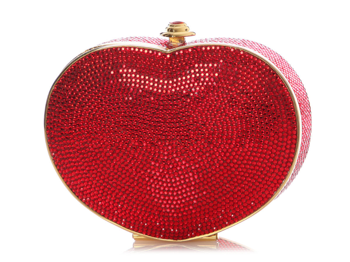 Accent a lovely look on an evening out with Judith Leiber’s Red Crystal Heart Minaudière! Made of metal that is covered in red crystals, the clasp is a red heart cabochon that opens to gold leather inside, while the gold chain strap has a 19.5-inch drop. In very good condition with a dustbag, comb, and pouch with a kiss lock, the gold hardware is scratched, the pouch is missing one clasp on the kiss lock, and the leather inside has some scratches. You’re going to heart the look of this heart!