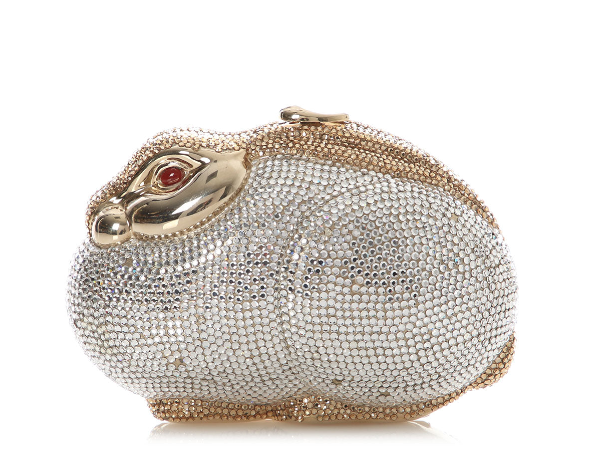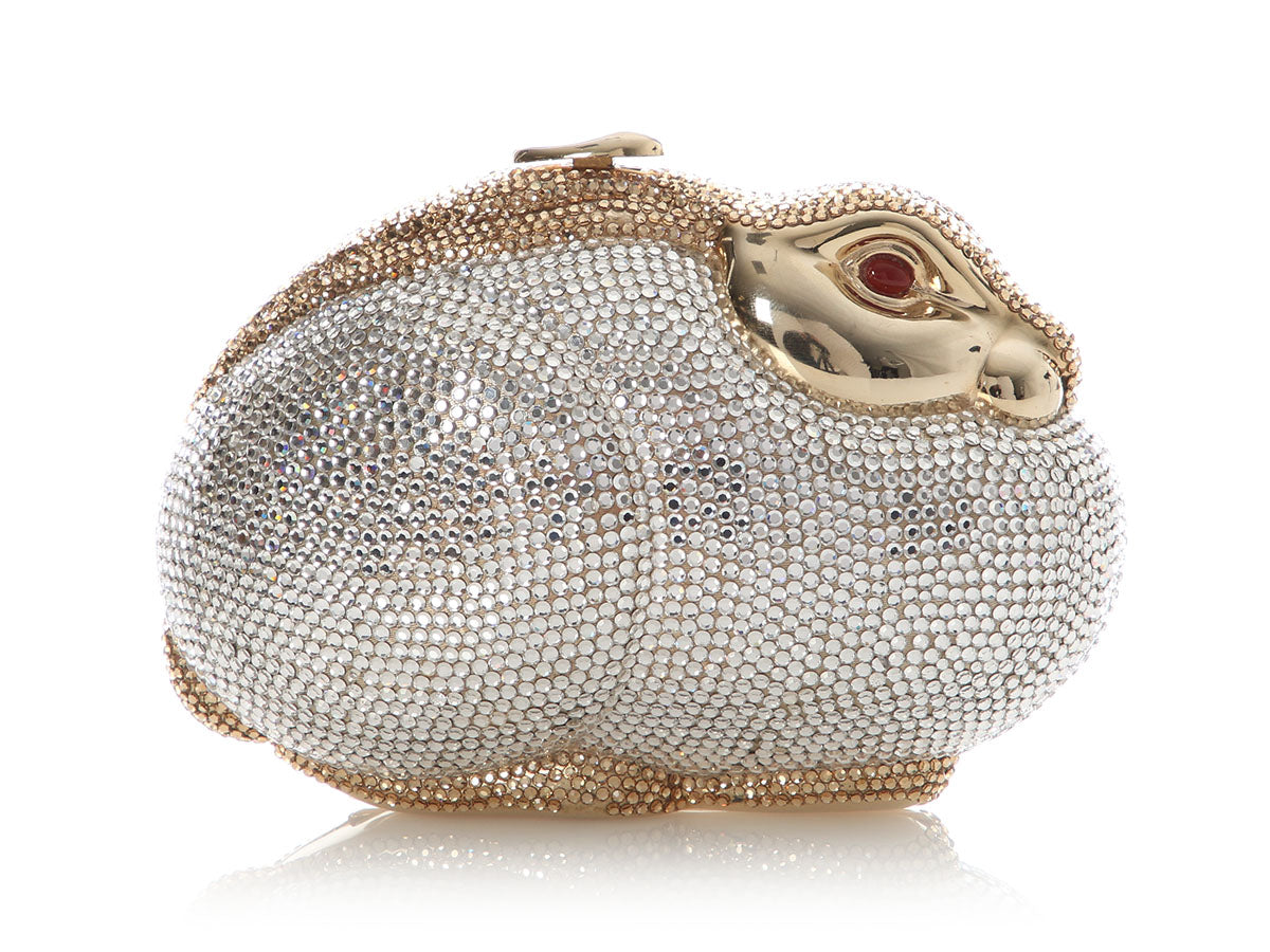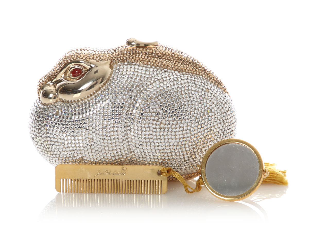 Judith Leiber’s Crystal Rabbit Minaudière is a dazzling little bunny that’s ready for a night out on the town! Made of metal covered in gold and silver crystals, the eyes are carnelian cabochons. A clasp secures the top, opening to gold leather inside. In good condition with a dustbag, mirror, and comb, there are some scratches on the metal areas, several missing crystals, and scratching and rubbing inside. The gold chain strap has a drop of 19.75 inches and can be tucked inside when you just want this to be your little snuggle bunny!