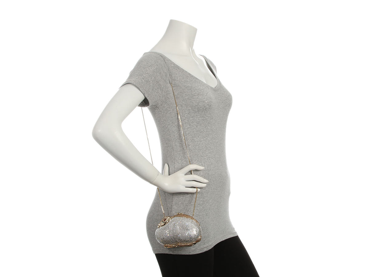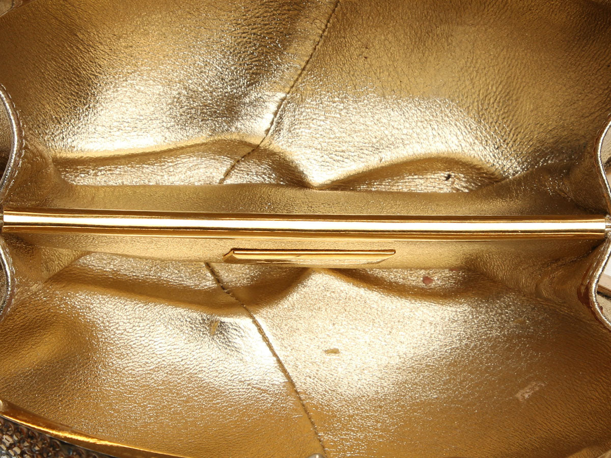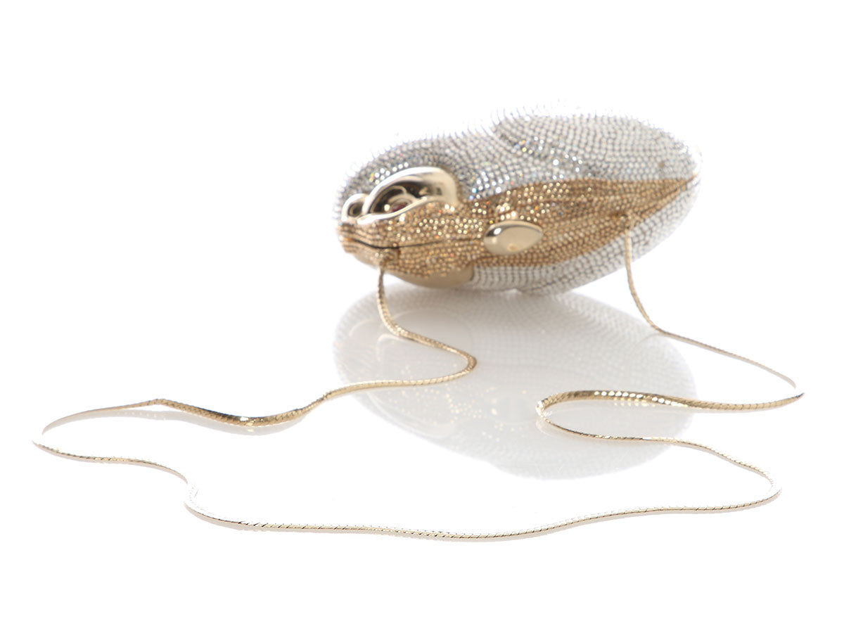 Judith Leiber’s Crystal Rabbit Minaudière is a dazzling little bunny that’s ready for a night out on the town! Made of metal covered in gold and silver crystals, the eyes are carnelian cabochons. A clasp secures the top, opening to gold leather inside. In good condition with a dustbag, mirror, and comb, there are some scratches on the metal areas, several missing crystals, and scratching and rubbing inside. The gold chain strap has a drop of 19.75 inches and can be tucked inside when you just want this to be your little snuggle bunny!