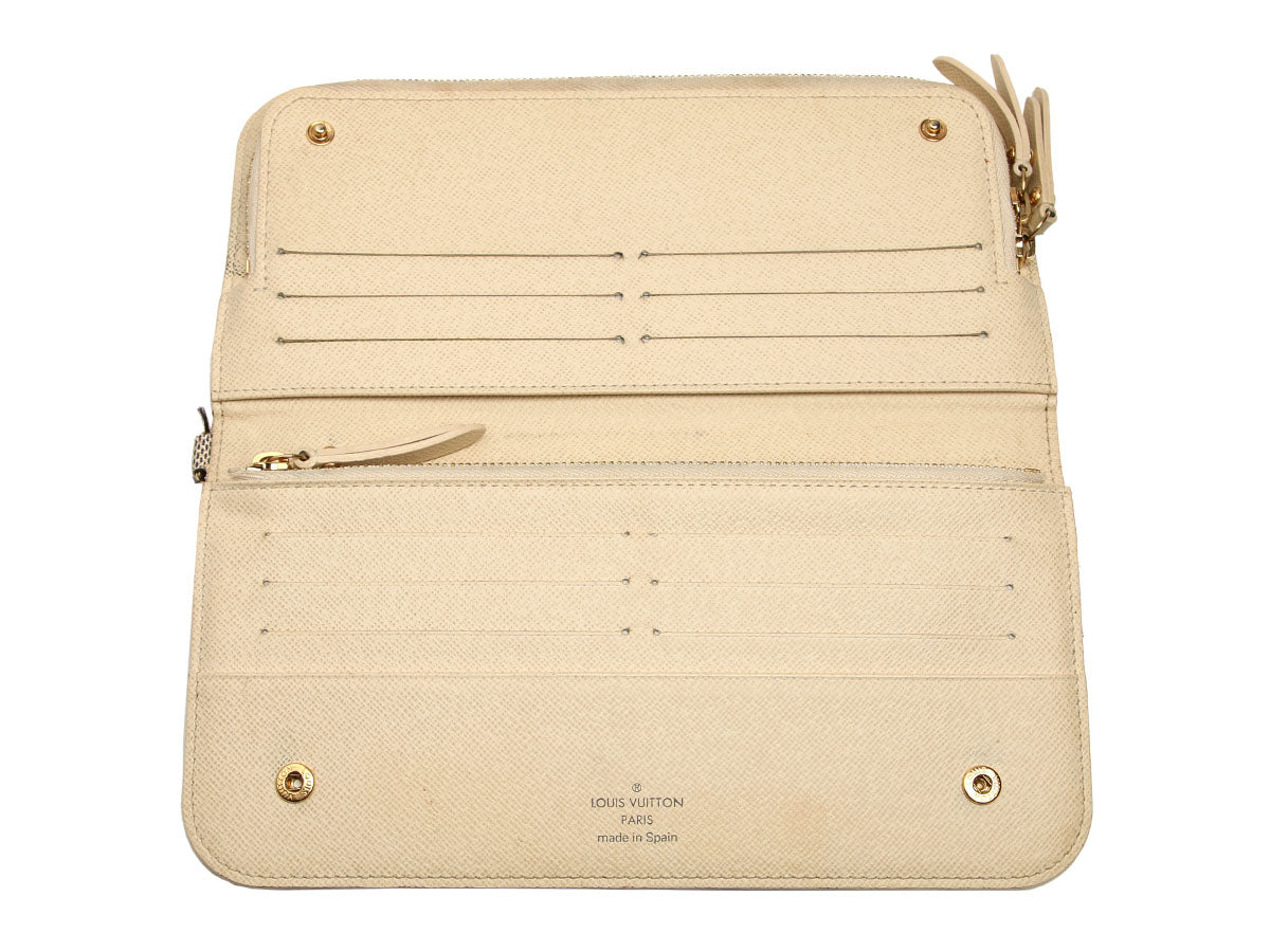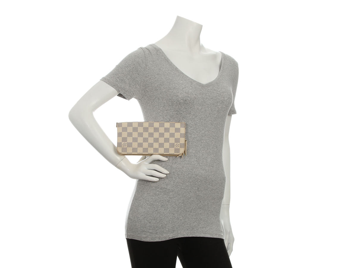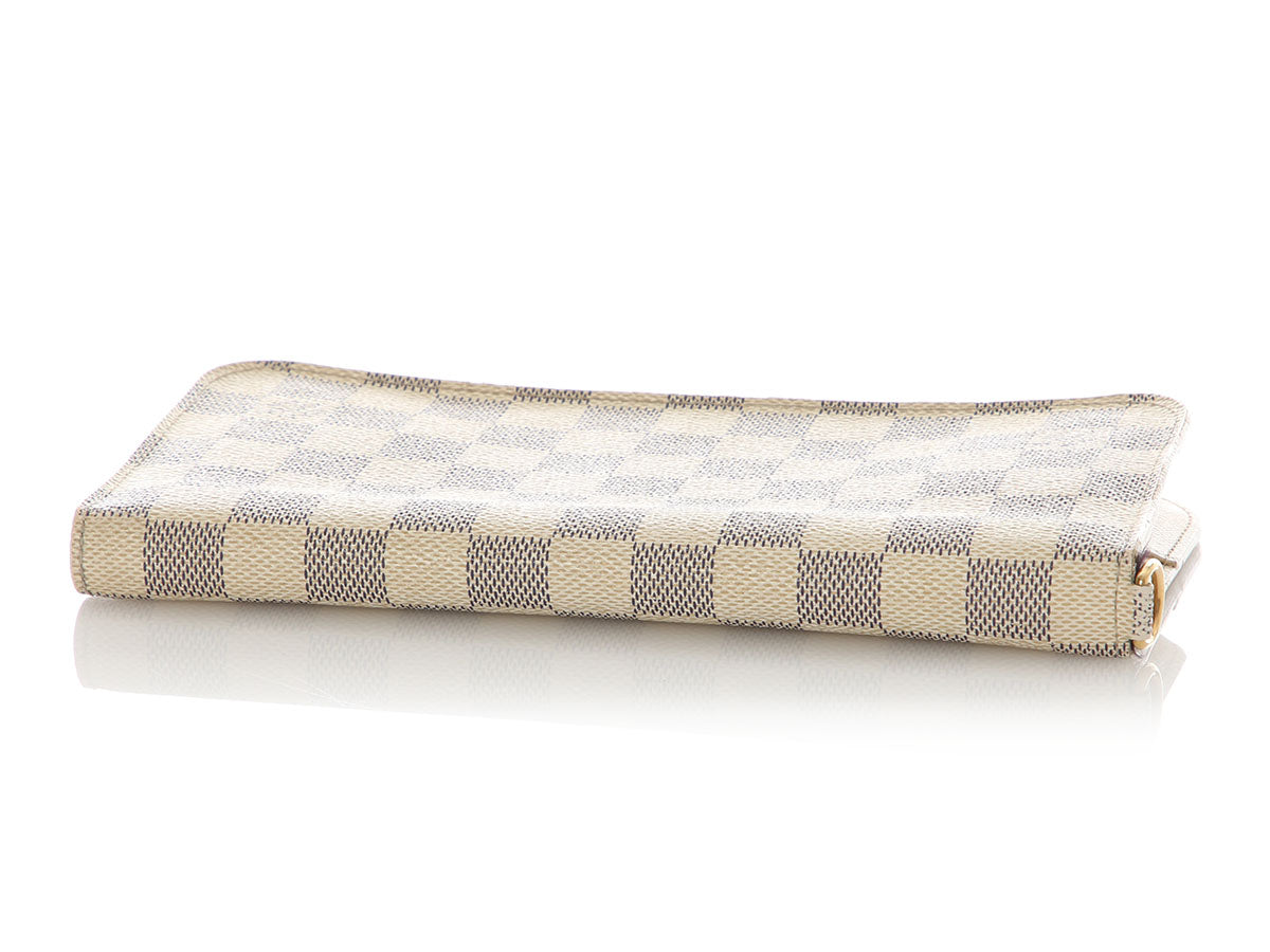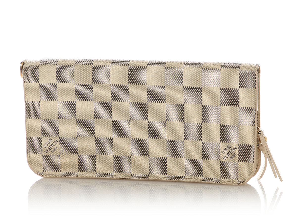 Louis Vuitton’s Damier Azur Insolite Wallet brings roomy, travel-ready function wrapped in checkered Damier charm! This ultra-roomy piece unzips to reveal an off-white leather interior with two zipped pockets, two slide pockets, and 12 card slots. Previously loved, it has wear on the corners, edges, zipper pulls, and inside, scratches on the gold hardware, peeling and cracking on the glazing, and a handful of marks and stains throughout. Its longer silhouette is designed to carry far more than the everyday basics with ease!