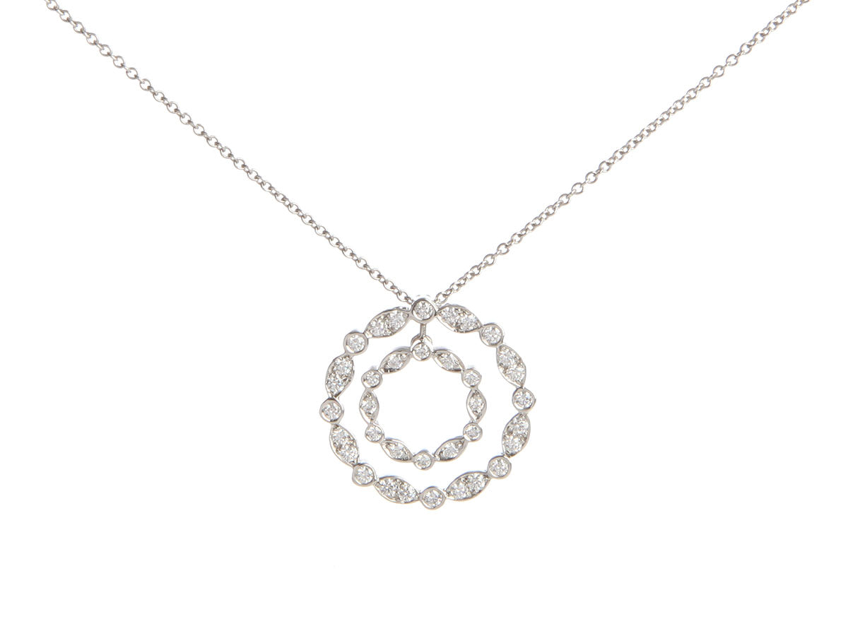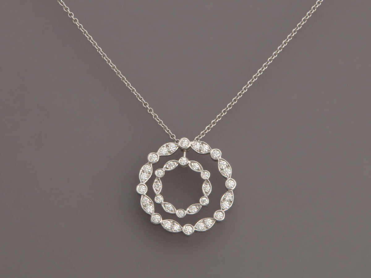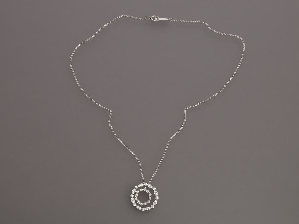 Tiffany & Co.’s Platinum Diamond Jazz Swing Circle Pendant Necklace brings a graceful sense of motion to your neckline with approximately 0.48 carats of sparkling diamonds that dance with every step! The center circle moves within the outer ring—which measures 0.75 inches by 0.75 inches—giving the piece a lively shimmer that feels endlessly wearable. In great condition with a box, it may have been worn and offers a polished, feminine look that layers beautifully or stands out on its own!