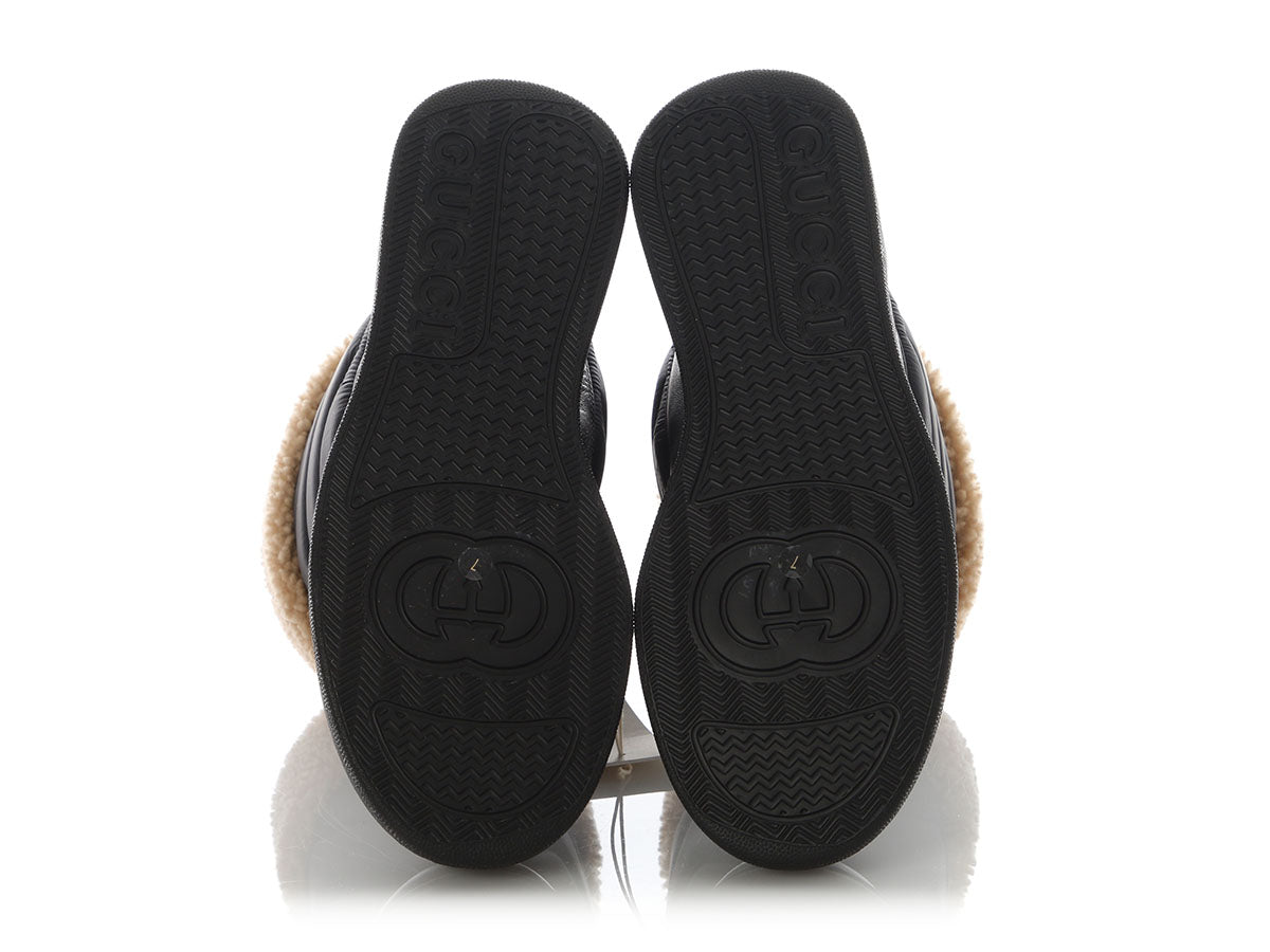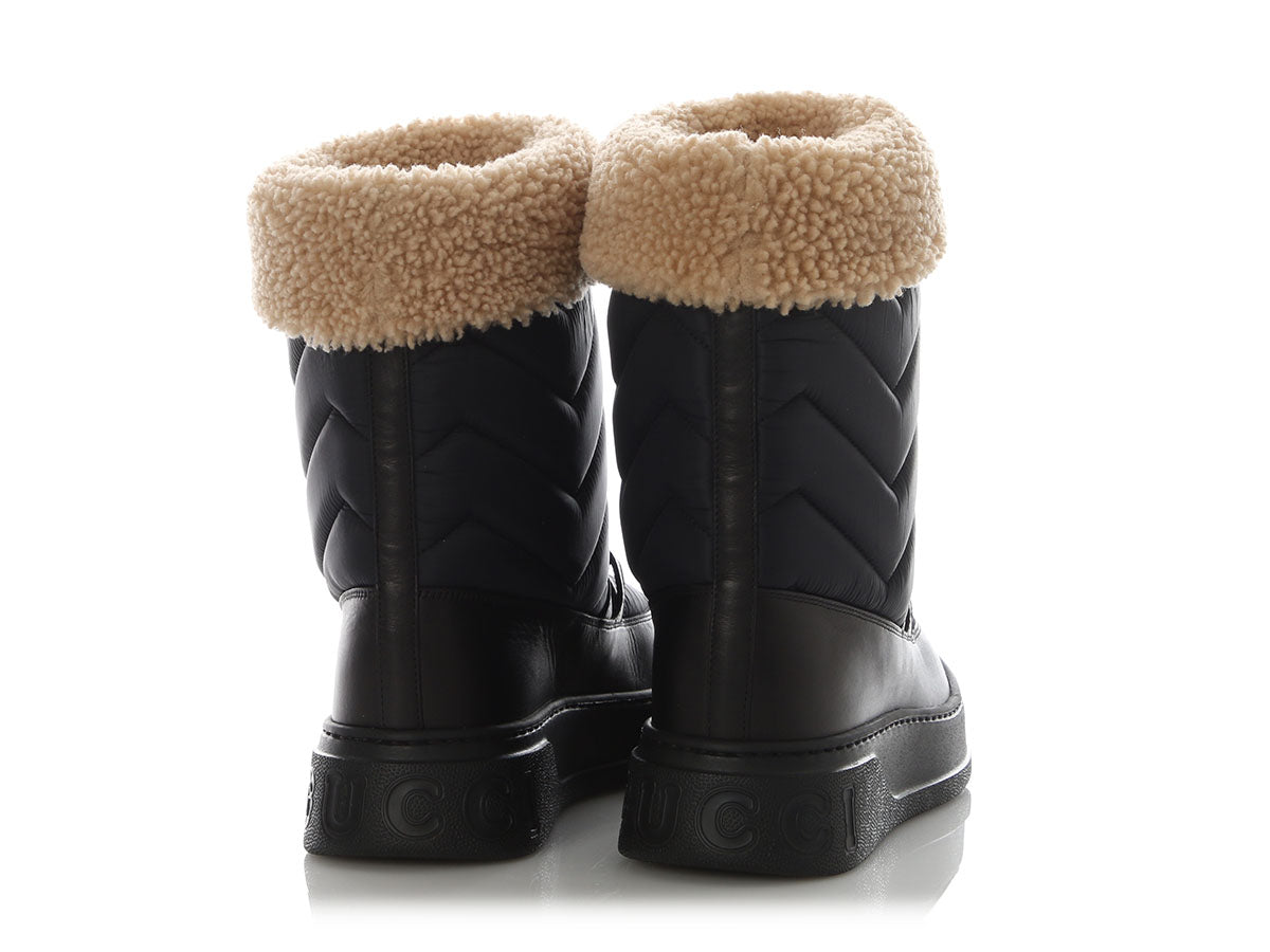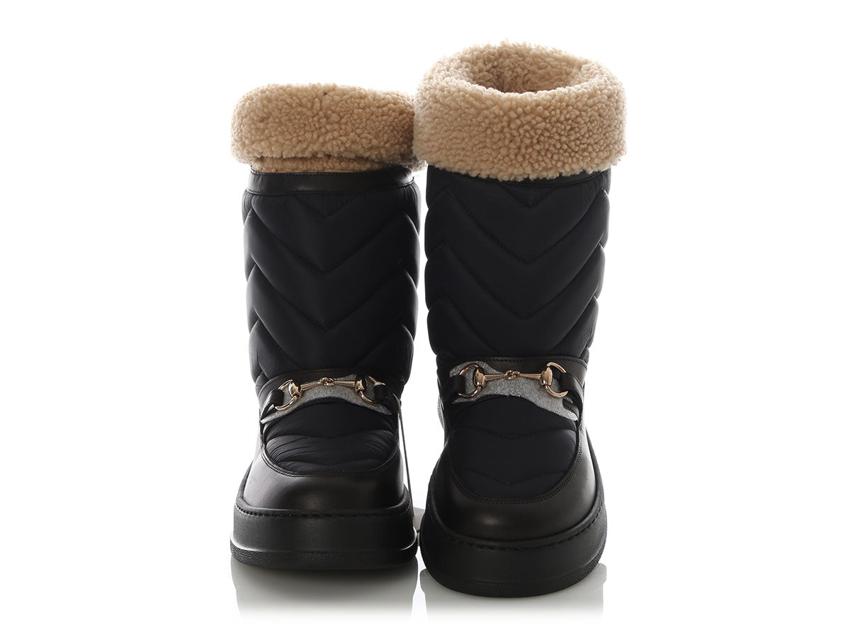 Gucci’s Black Nylon and Shearling Winter Boots are a cozy style with a fashionable look! Made of a combo of quilted black nylon, black leather, and shearling, they have gold horsebit hardware over the tops. New and never worn with two dustbags, they have shearling inners and manmade soles. While they’re technically a men’s boot, they have a unisex style for anyone who loves to keep their toes toasty!
