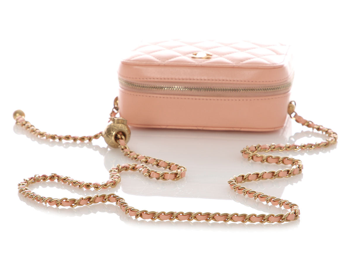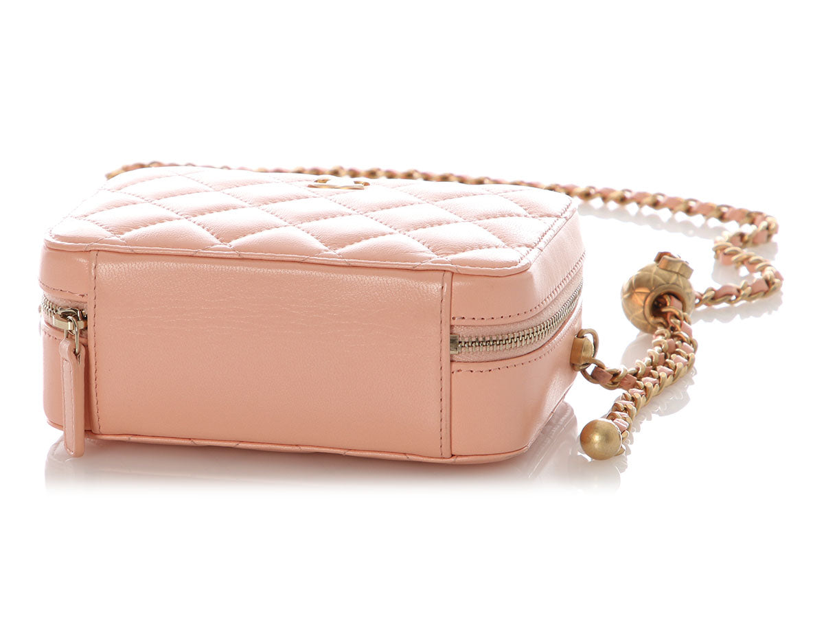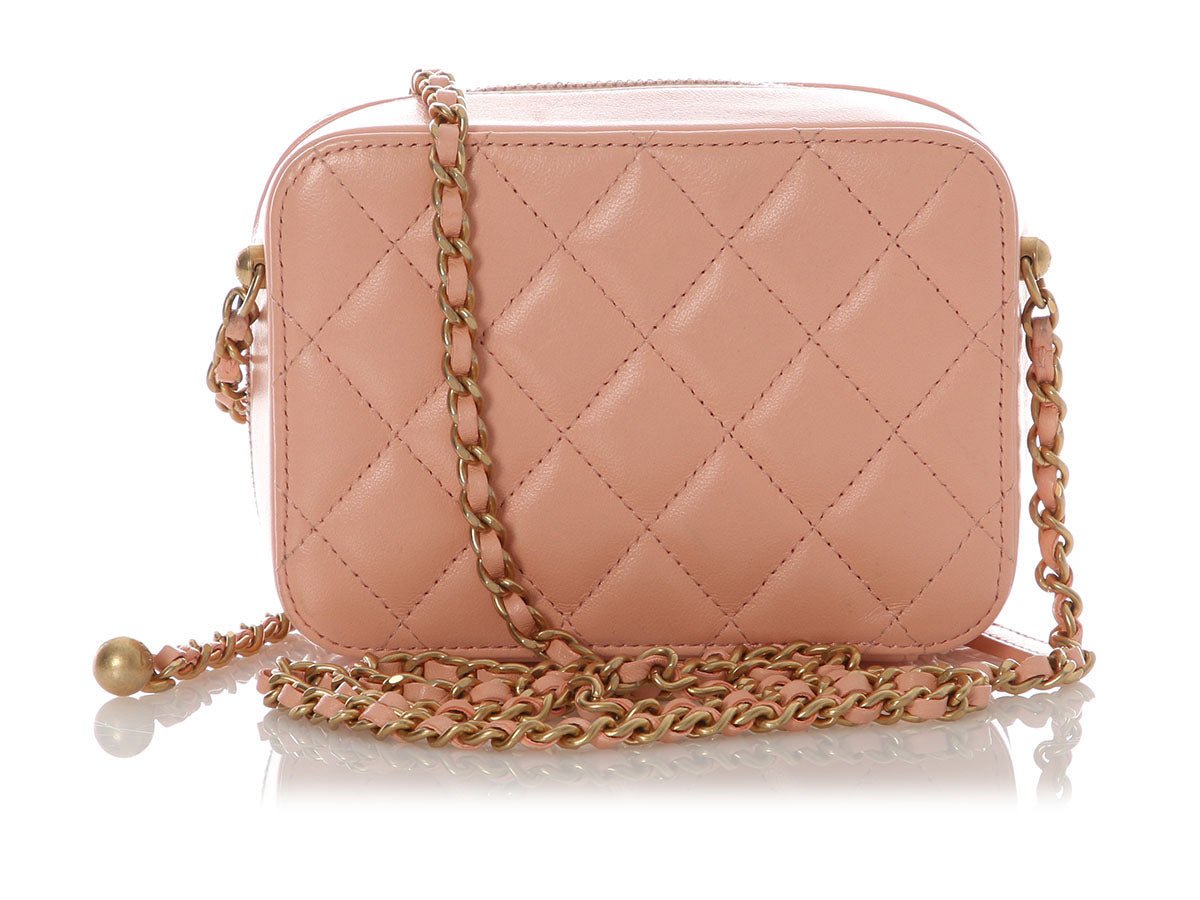 Chanel’s Mini Light Pink Quilted Lambskin Pearl Crush Camera Bag is a tiny treasure with a luxurious punch of pastel charm! Crafted from diamond-quilted lamb leather with antique gold hardware, it features an adjustable leather-through-chain crossbody strap with a round CC logo slider shown with a 21-inch drop. The top unzips to reveal two sections lined in tan fabric with three bronze leather credit card slots. In great condition from 2021 with a dustbag, box, and card, it has marks on the side base of the strap. Petite in size but unmistakably Chanel, this mini it totally crush-worthy!