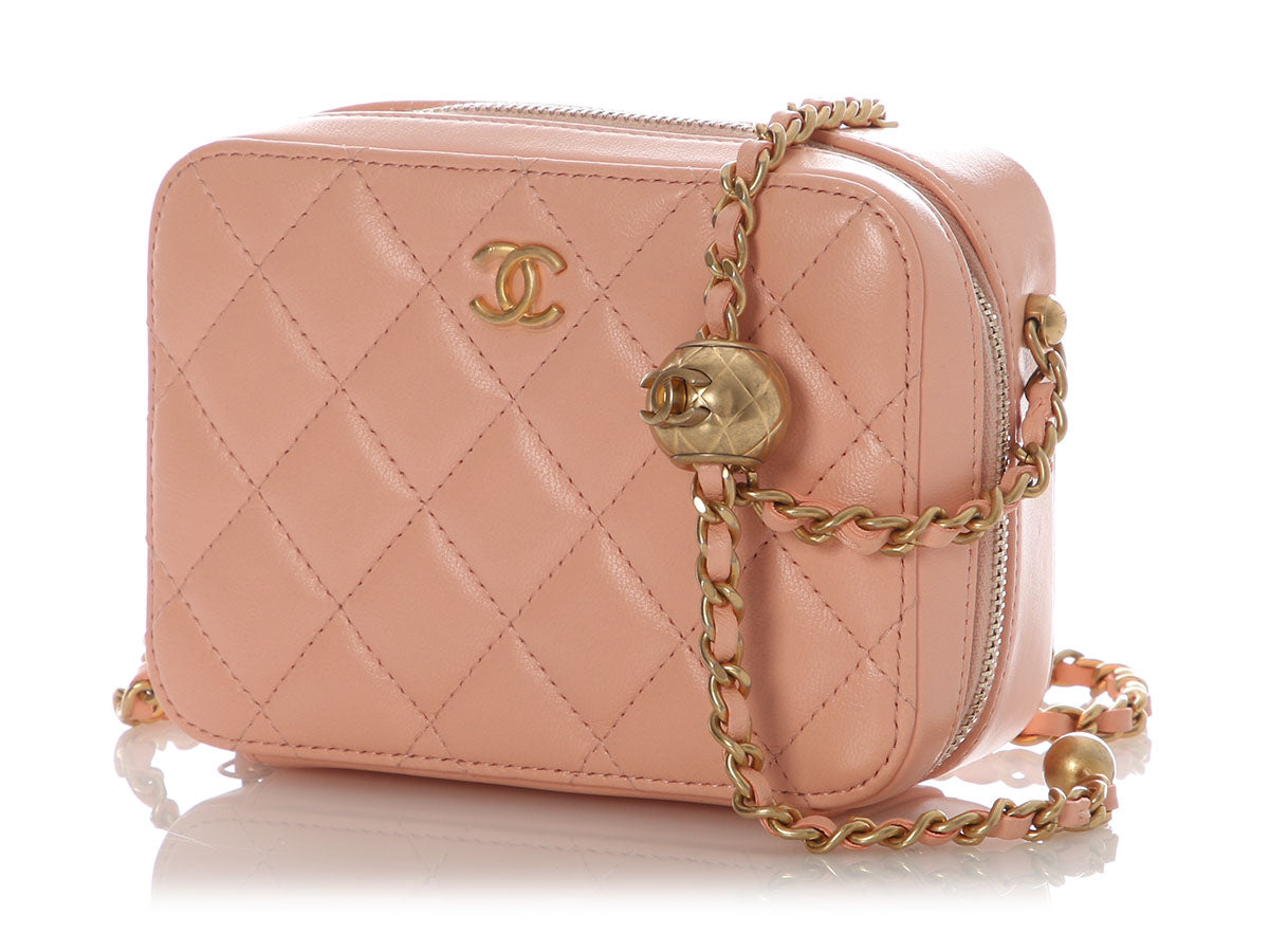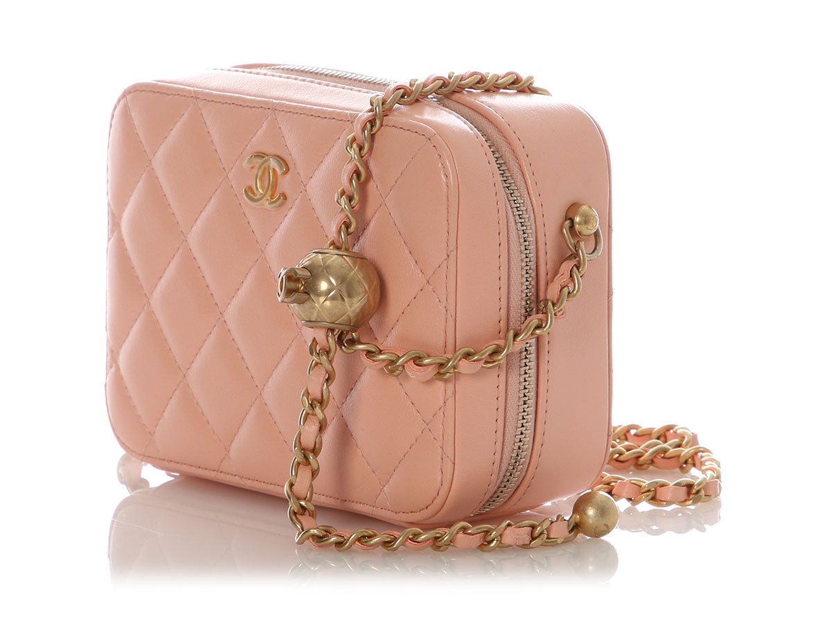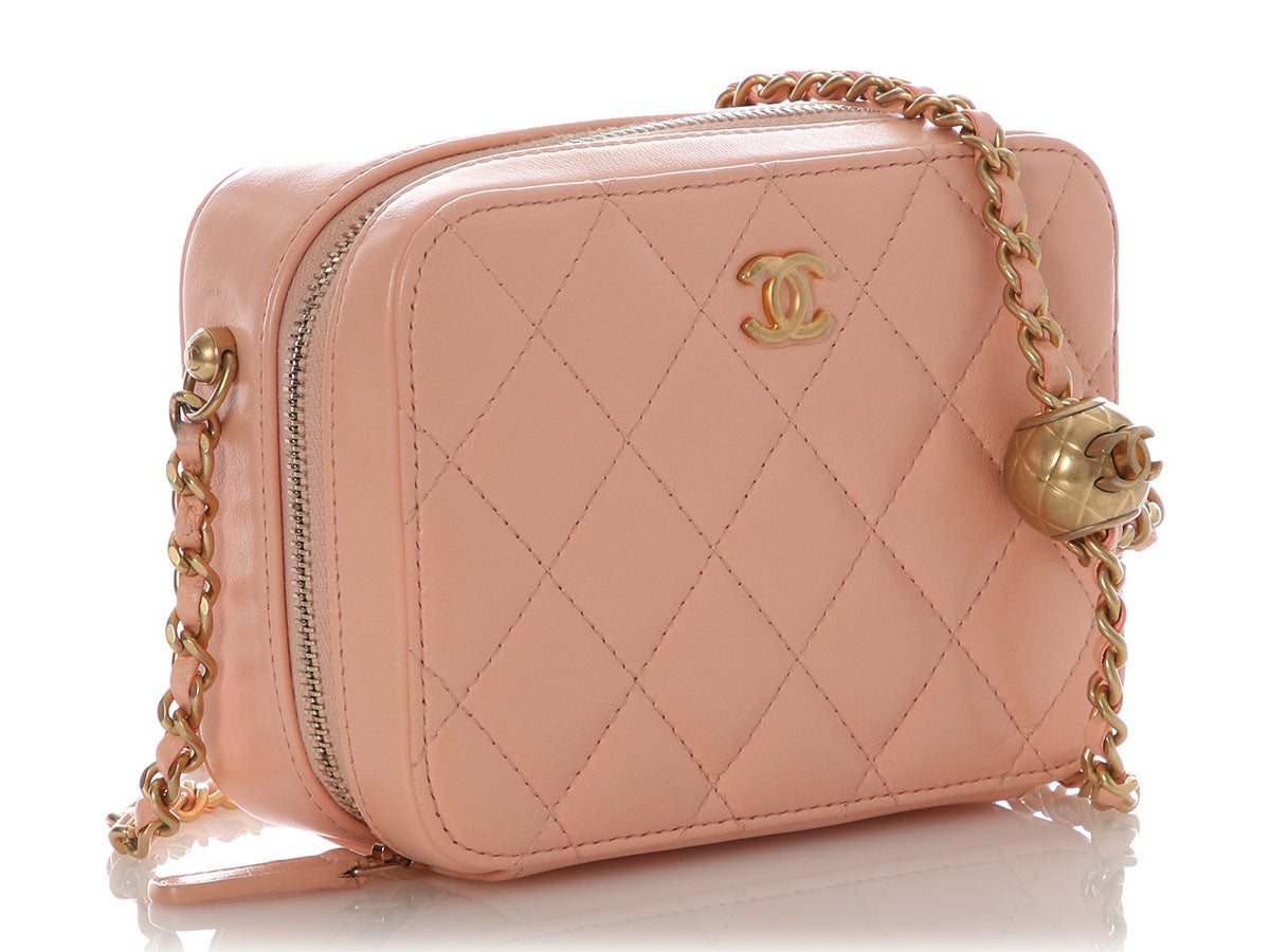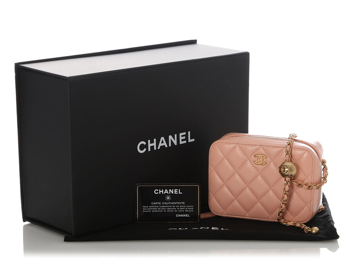 Chanel’s Mini Light Pink Quilted Lambskin Pearl Crush Camera Bag is a tiny treasure with a luxurious punch of pastel charm! Crafted from diamond-quilted lamb leather with antique gold hardware, it features an adjustable leather-through-chain crossbody strap with a round CC logo slider shown with a 21-inch drop. The top unzips to reveal two sections lined in tan fabric with three bronze leather credit card slots. In great condition from 2021 with a dustbag, box, and card, it has marks on the side base of the strap. Petite in size but unmistakably Chanel, this mini it totally crush-worthy!