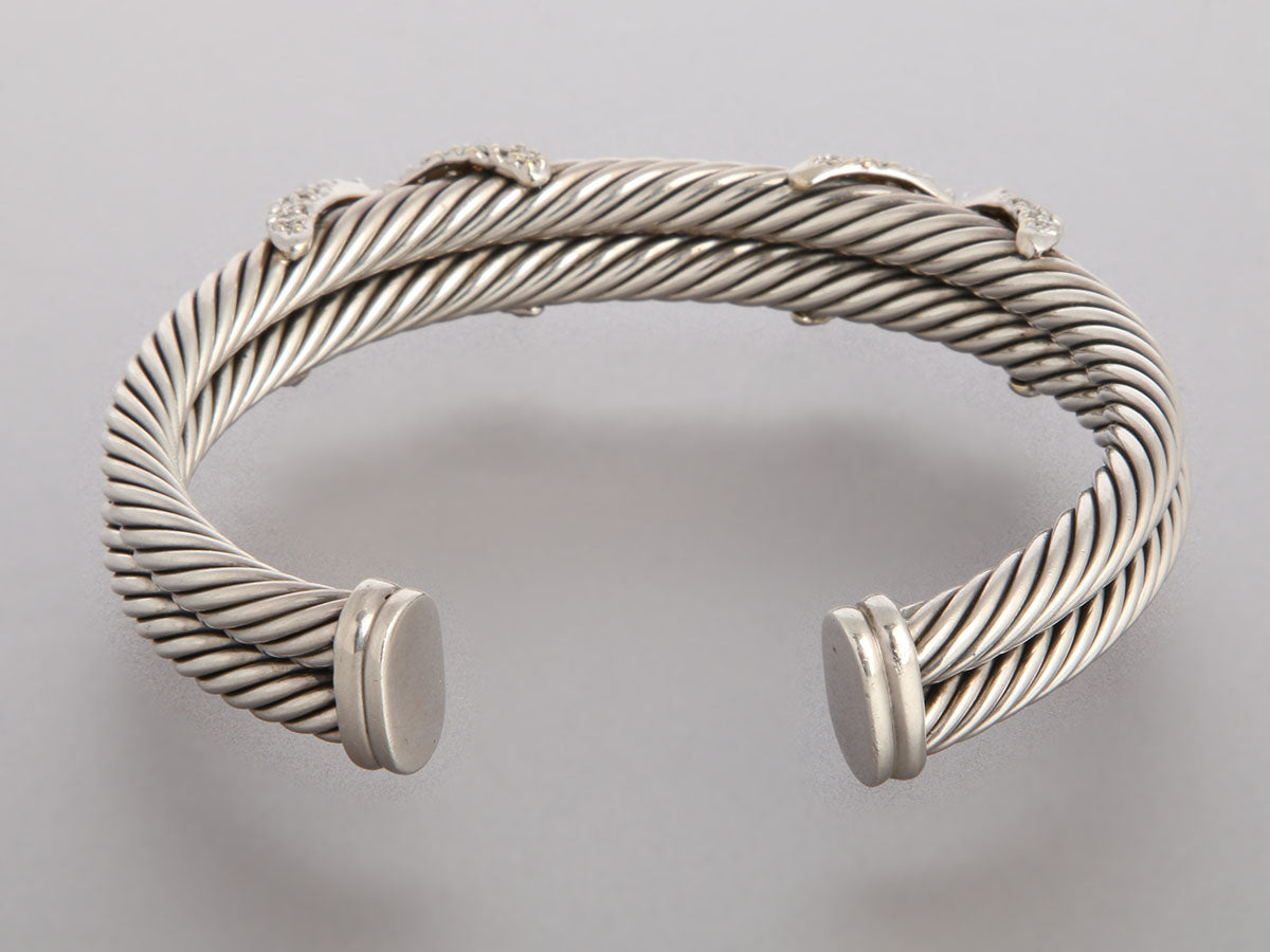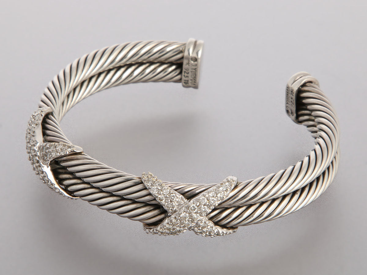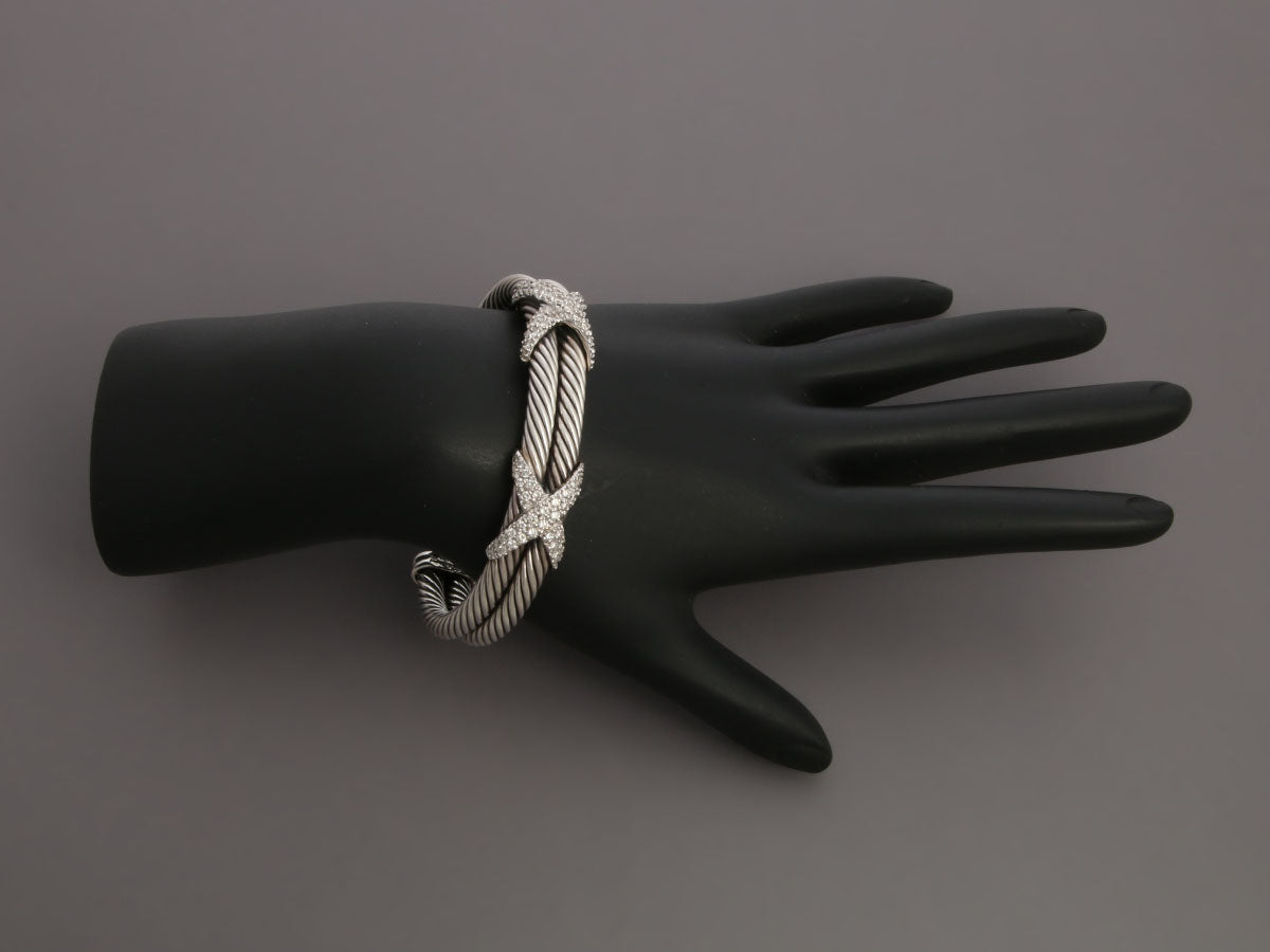 David Yurman’s Diamond X Double Cable Bracelet is a timeless sparkler with sculptural shine! Crafted from sterling silver in DY’s iconic double cable motif, it’s kissed with 18K white gold and approximately 1 carat of glittering diamonds arranged in a bold X across the center. At 10 millimeters wide, it can be worn solo for elegant simplicity or stacked for a luxe layered look. In very good condition with marks on the metal, it comes ready to elevate everything from denim to black tie!