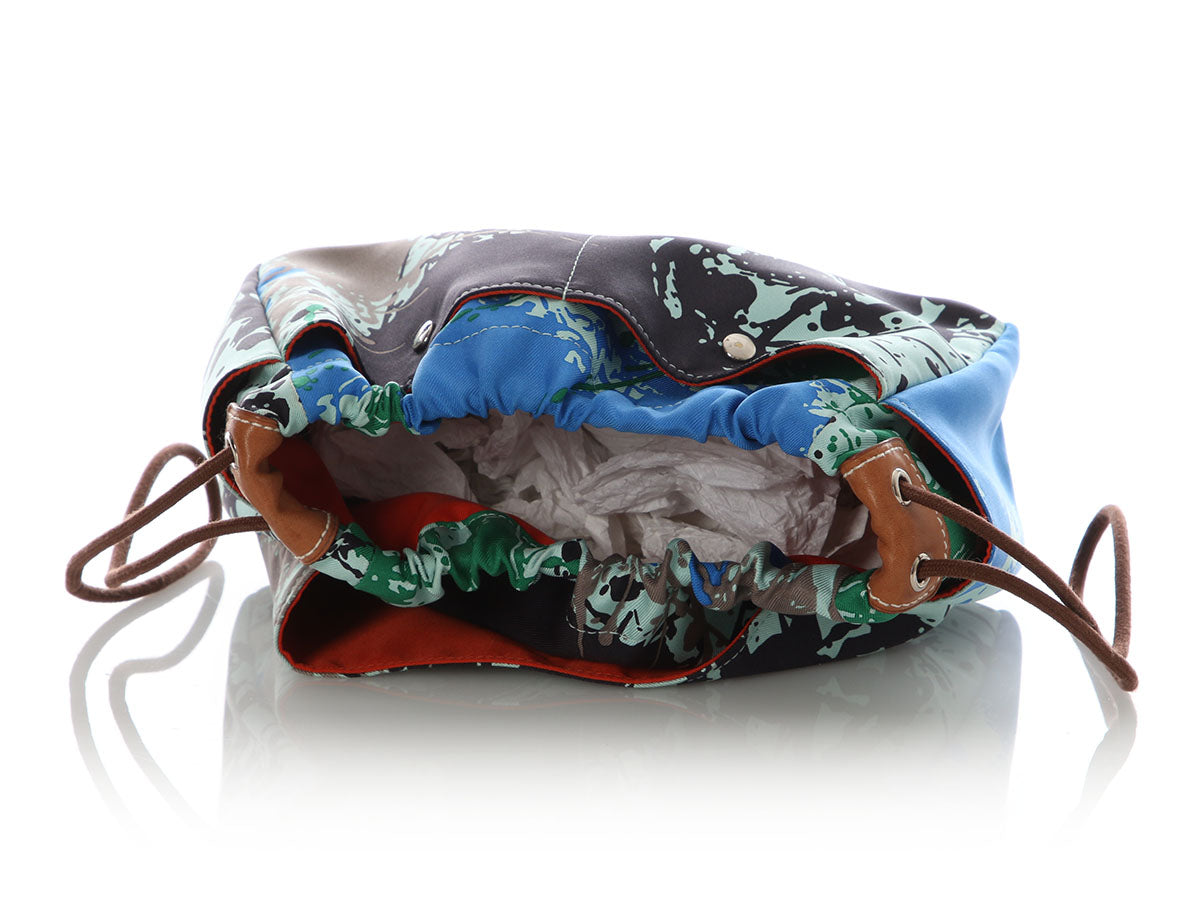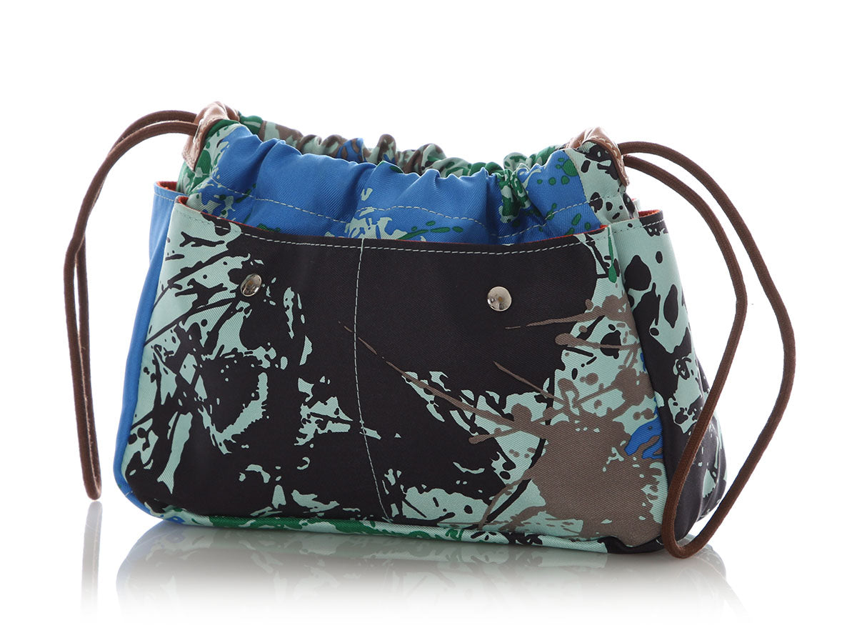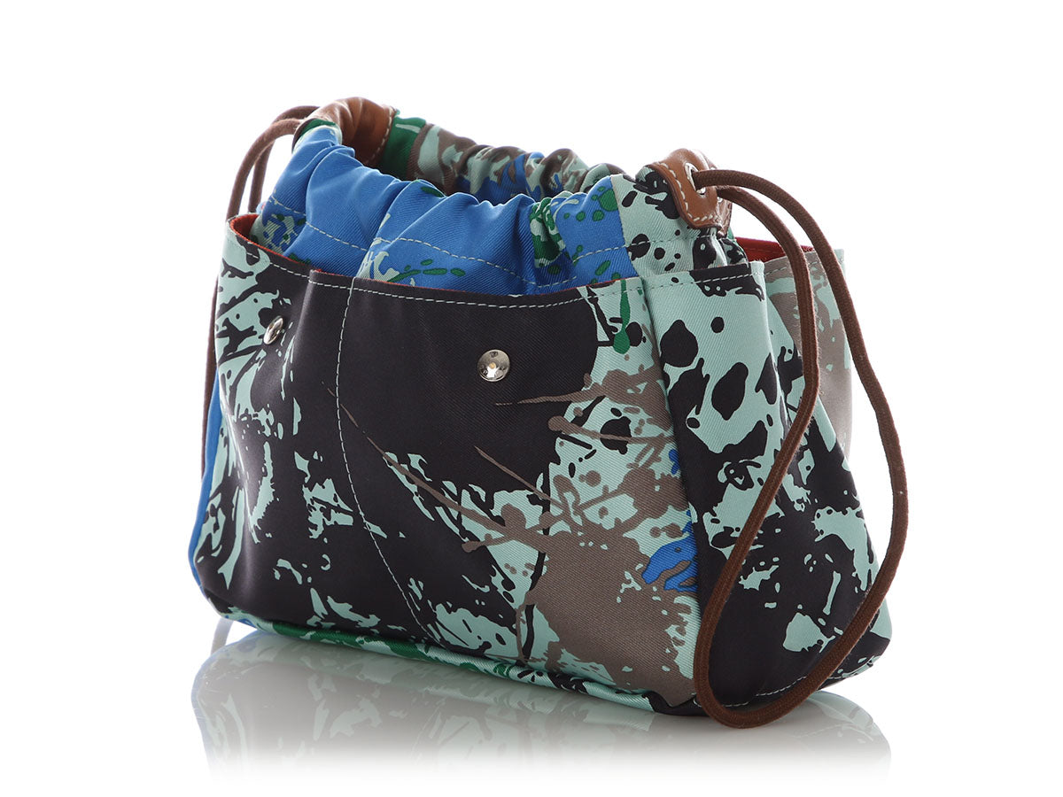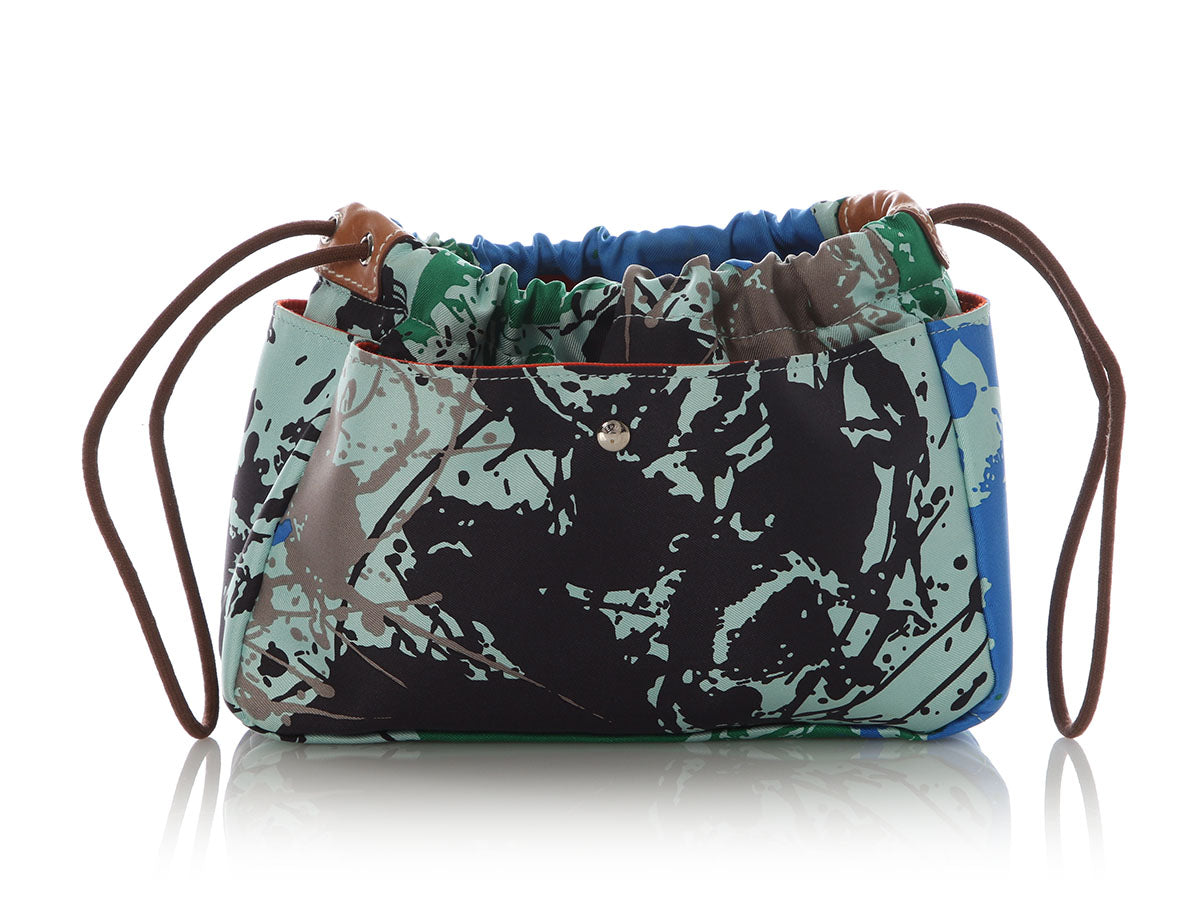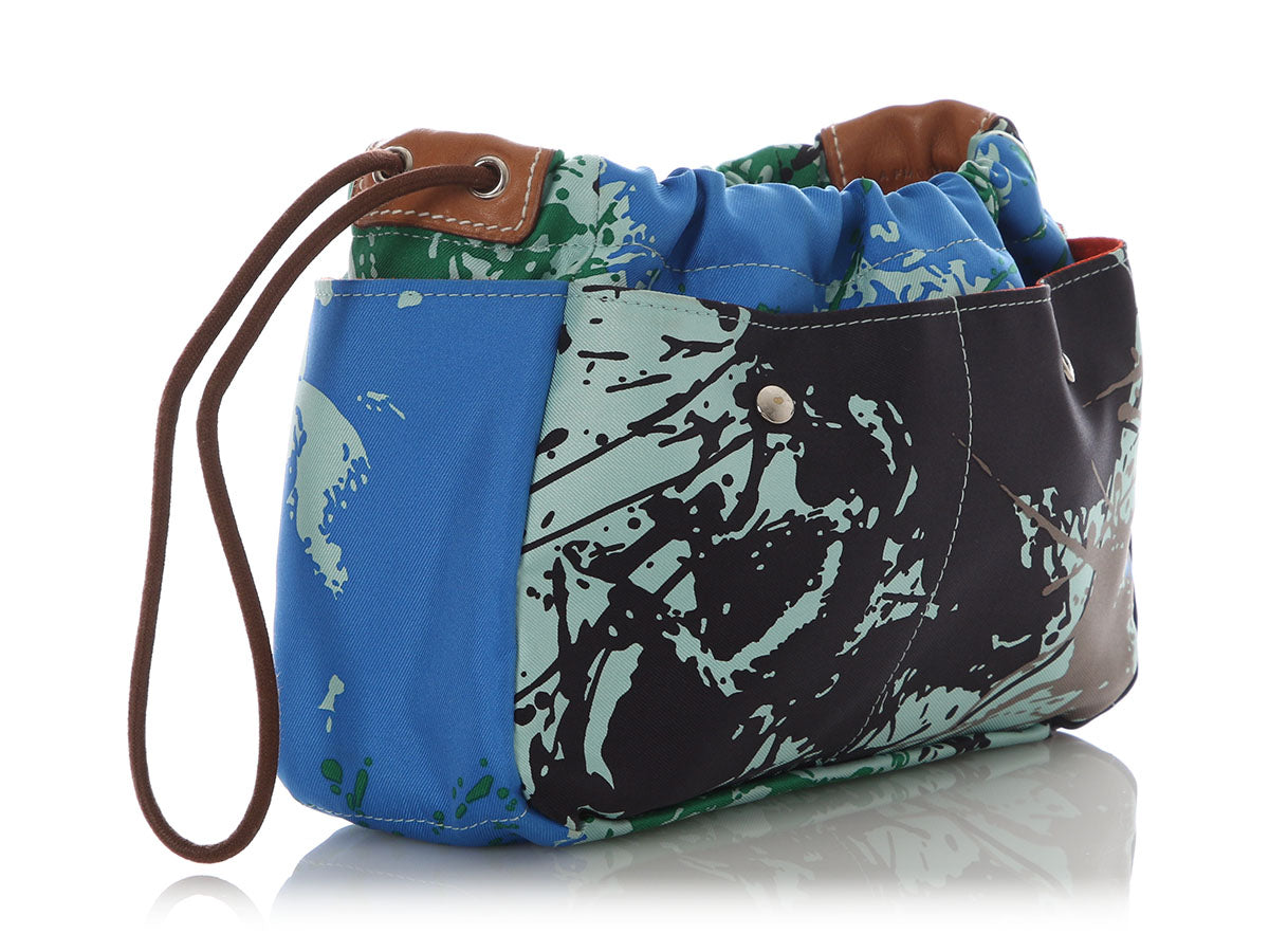 Hermès’ Silk Cheval Surprise Fourbi 20 Insert transforms everyday organization into an art form! Crafted from blue, green, and gray patterned silk with barenia leather details, this bag insert features palladium hardware and cinching sides for an adjustable shape. Five exterior slide pockets keep essentials close at hand, while the orange fabric-lined interior adds a touch of signature Hermès vibrancy. In very good condition with a dustbag, it has light wear on the hardware and leather. Boldly designed and brilliantly practical, it will keep your favorite satchel neat and tidy!
