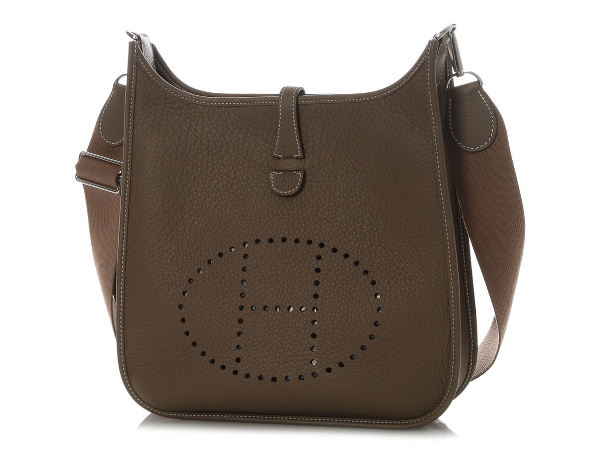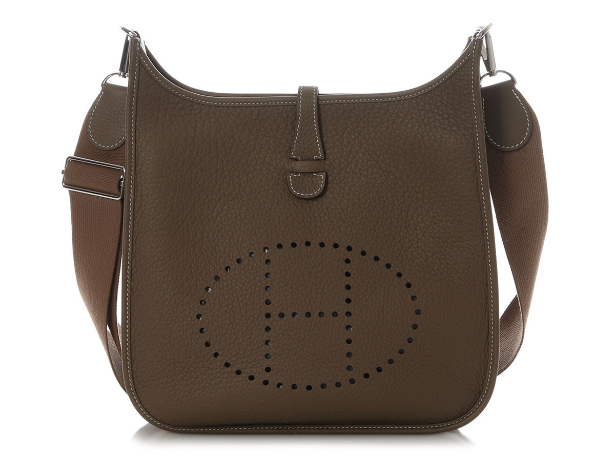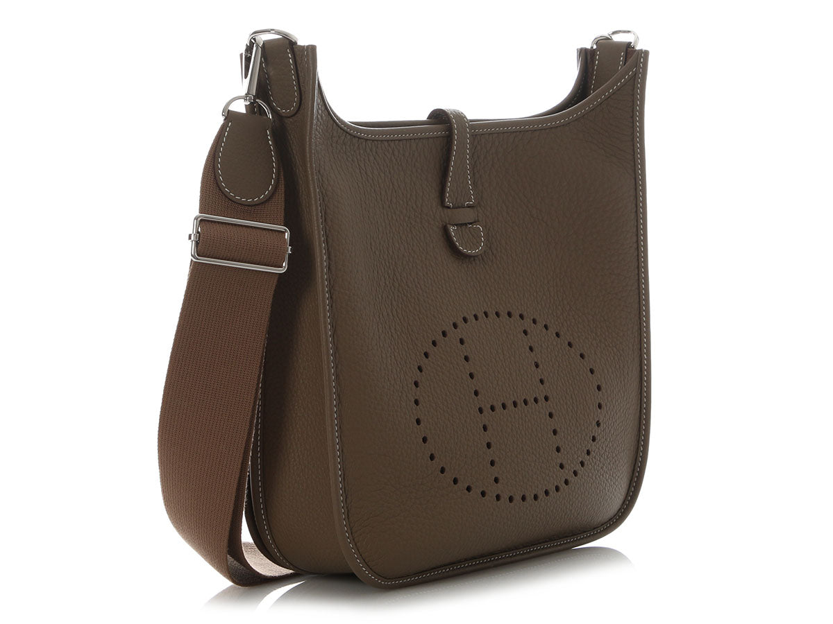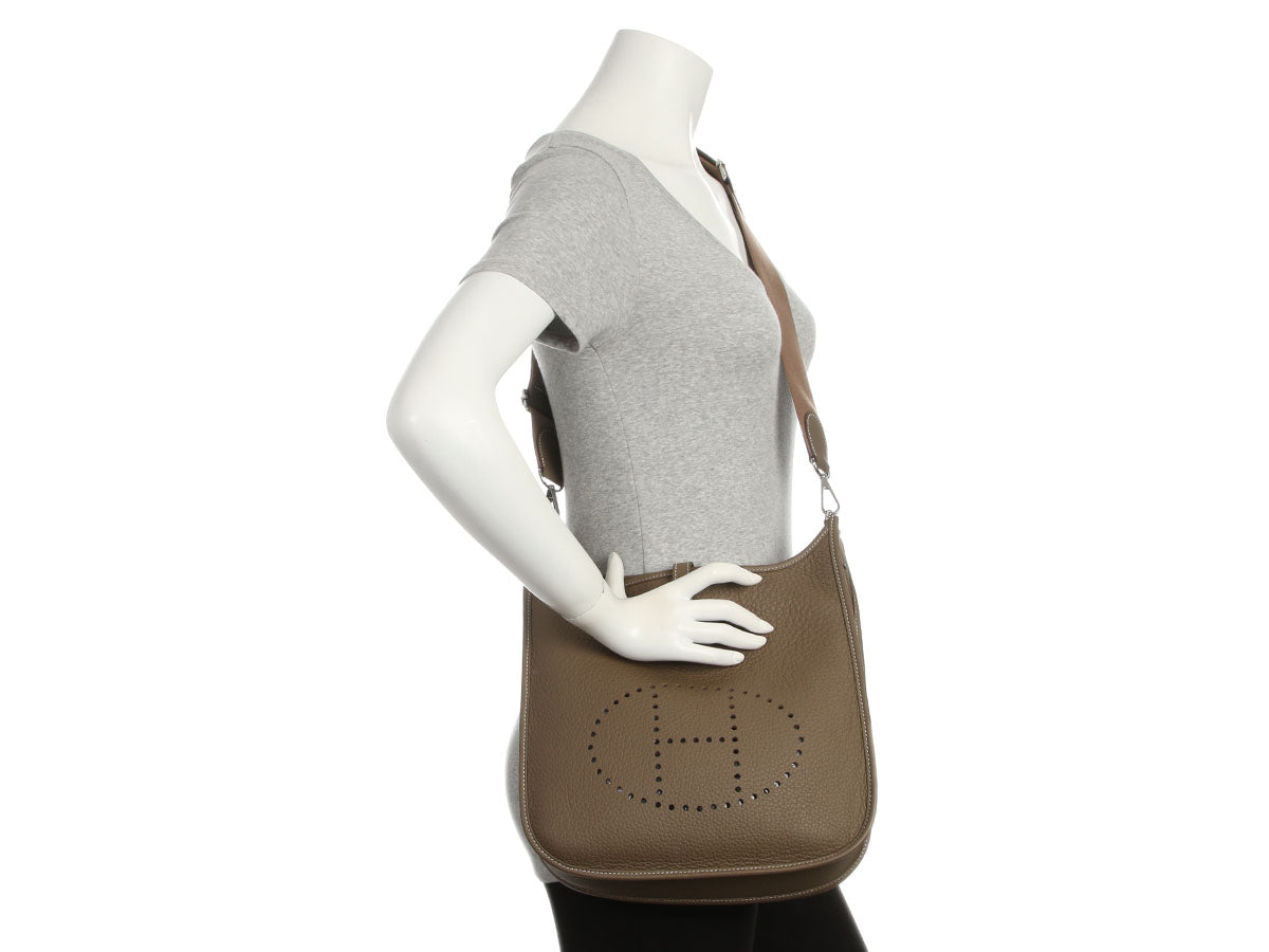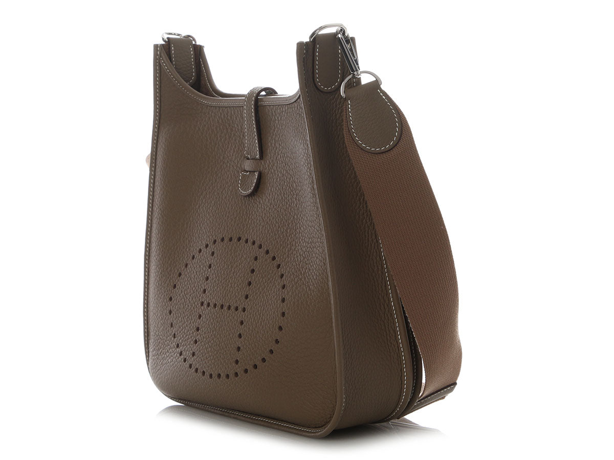 This third-generation Hermès Evelyne PM comes to you in a neutral, year-round color! Made of white-stitched Etoupe Clémence leather with palladium hardware, it has an adjustable, detachable webbing strap shown with a crossbody-worthy drop of 17 inches. The front face has the iconic perforated H, and the open top secures with a small flap with a leather-covered snap that secures on the back over a slide pocket. There are no pockets within the unlined interior, but there’s plenty of room for your essentials. In great condition from 2024 (W stamp), it comes with a dustbag and box and has a bit of wear on the strap and hardware. If you’re the type who likes to hold a bag by its bottom and carry it under the arm, just remove the strap and go au naturel!