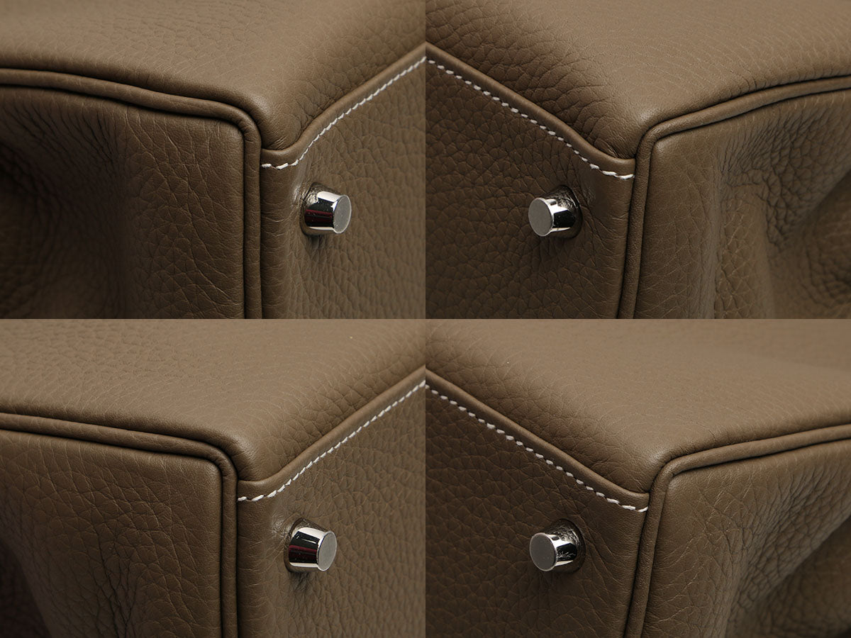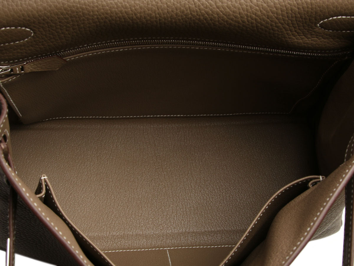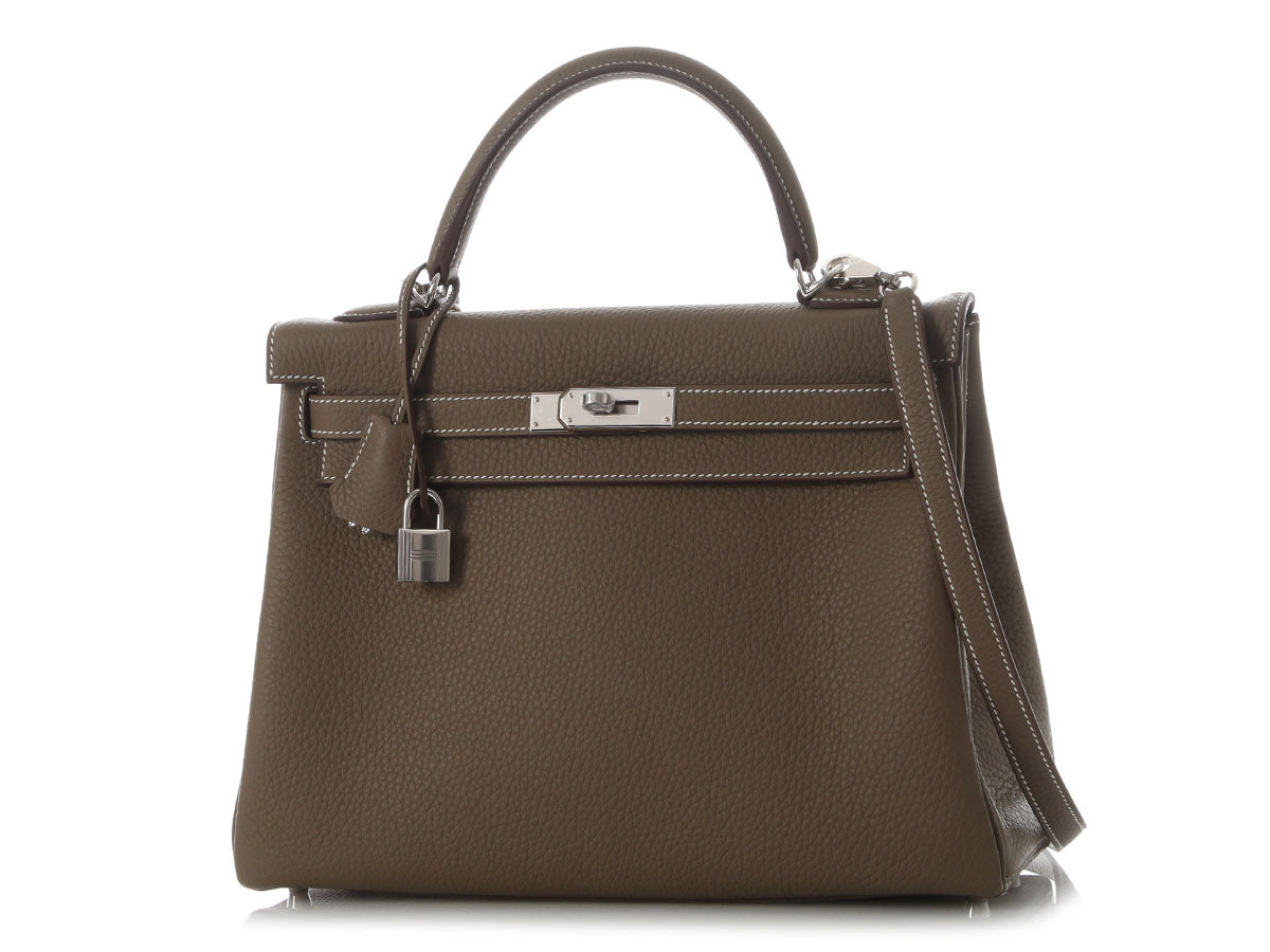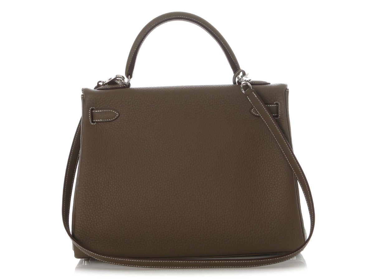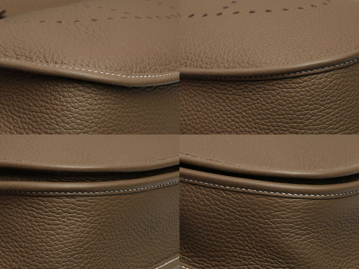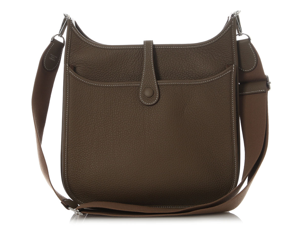 This third-generation Hermès Evelyne PM comes to you in a neutral, year-round color! Made of white-stitched Etoupe Clémence leather with palladium hardware, it has an adjustable, detachable webbing strap shown with a crossbody-worthy drop of 17 inches. The front face has the iconic perforated H, and the open top secures with a small flap with a leather-covered snap that secures on the back over a slide pocket. There are no pockets within the unlined interior, but there’s plenty of room for your essentials. In great condition from 2024 (W stamp), it comes with a dustbag and box and has a bit of wear on the strap and hardware. If you’re the type who likes to hold a bag by its bottom and carry it under the arm, just remove the strap and go au naturel!