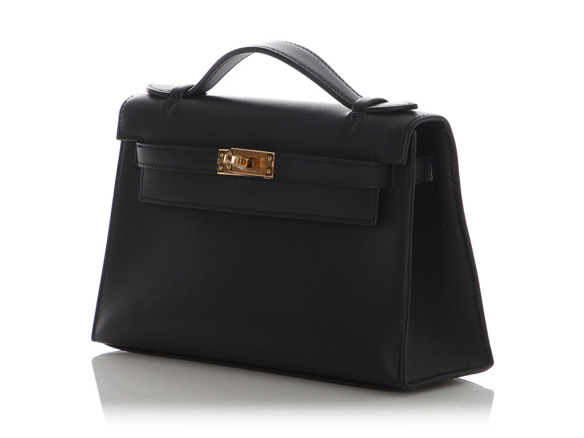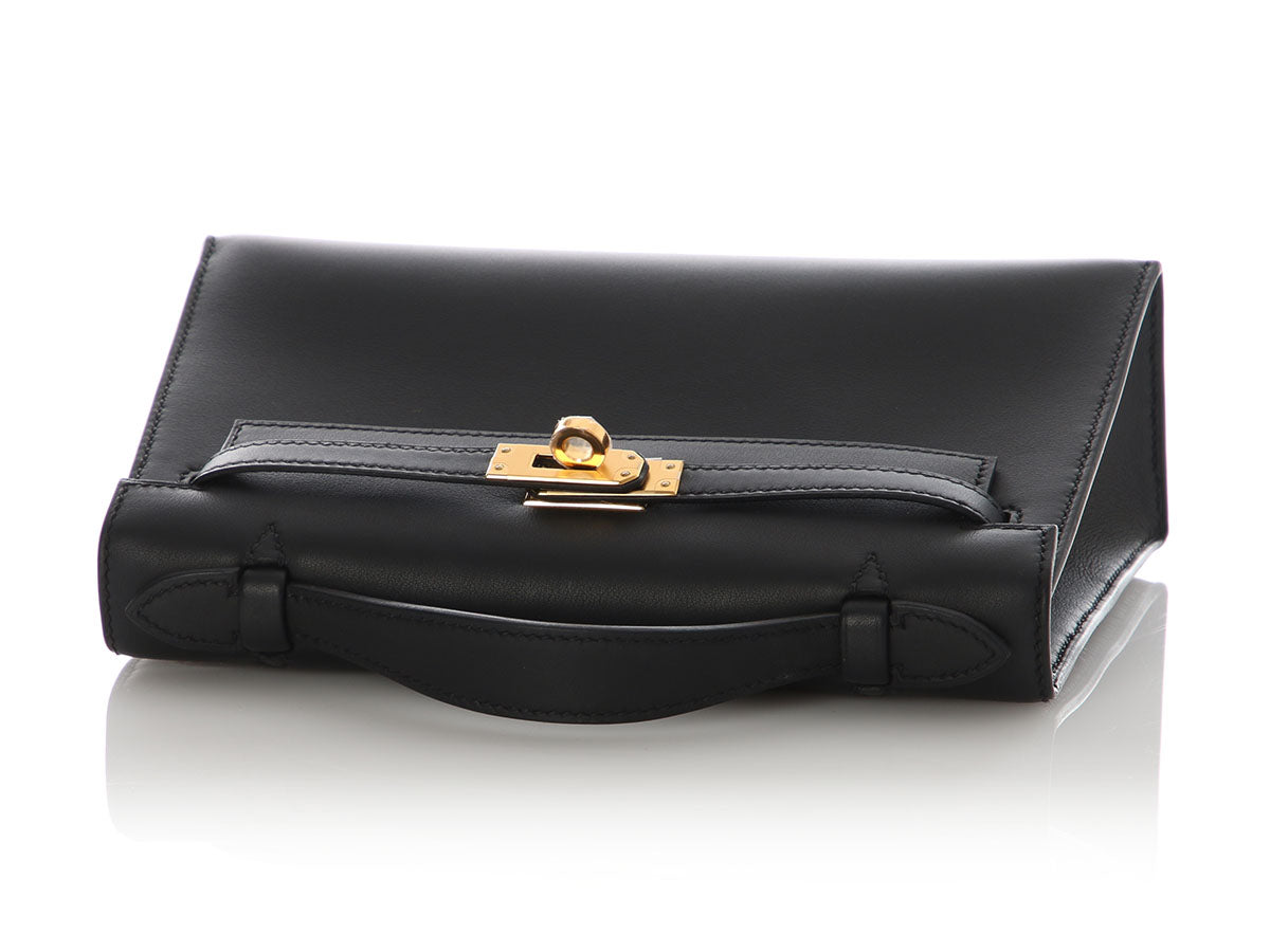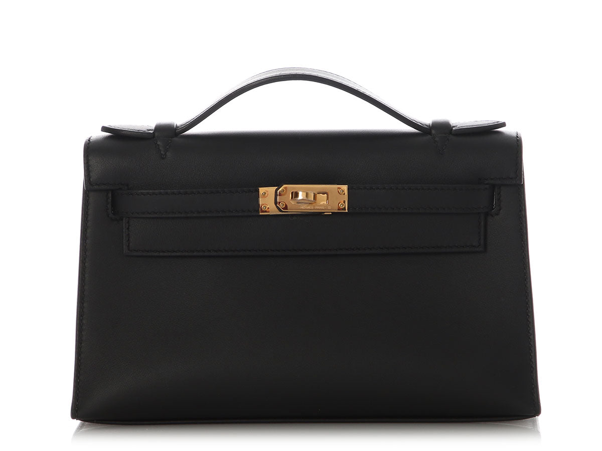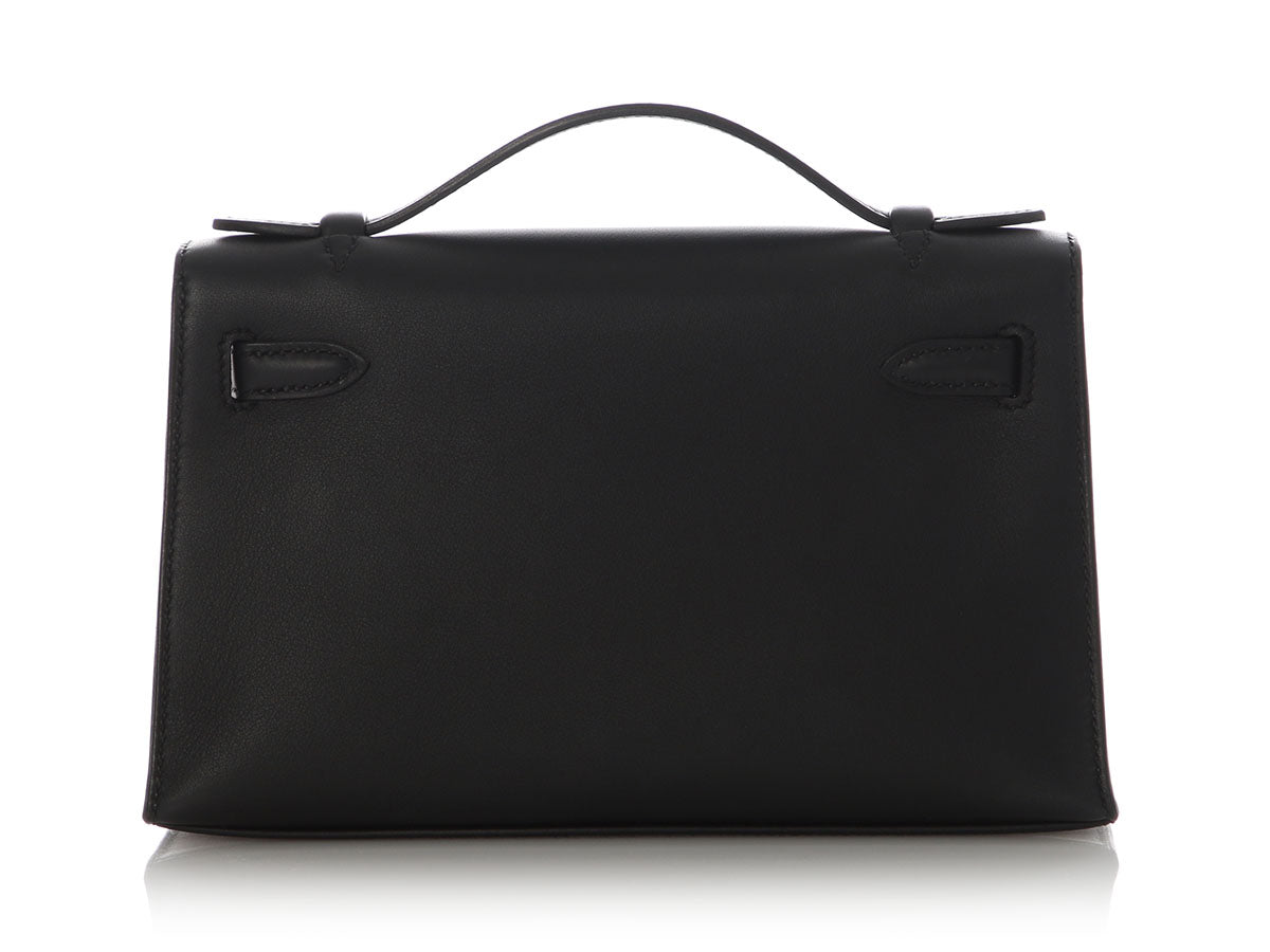 Hermès’ Black Swift Kelly Pochette is a tidy little clutch with loads of panache! The flap secures with a gold turnlock, which opens to black-leather lining with one slide pocket inside and room for just the essentials. Brand new from 2024 (W stamp), it is new and never worn with a dustbag, box, and plastic on the hardware. Tote this little treasure by the top handle or carry it by its structured bottom!