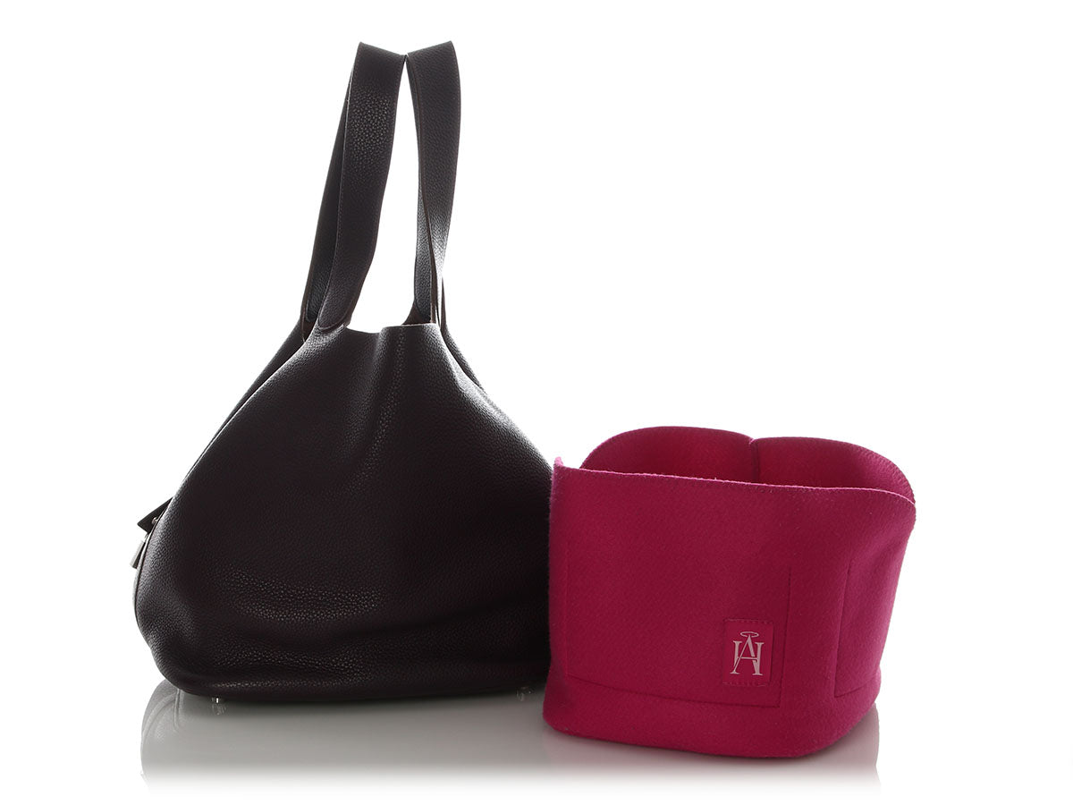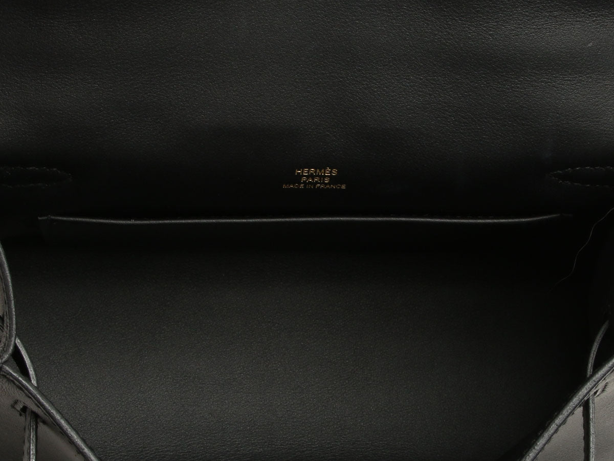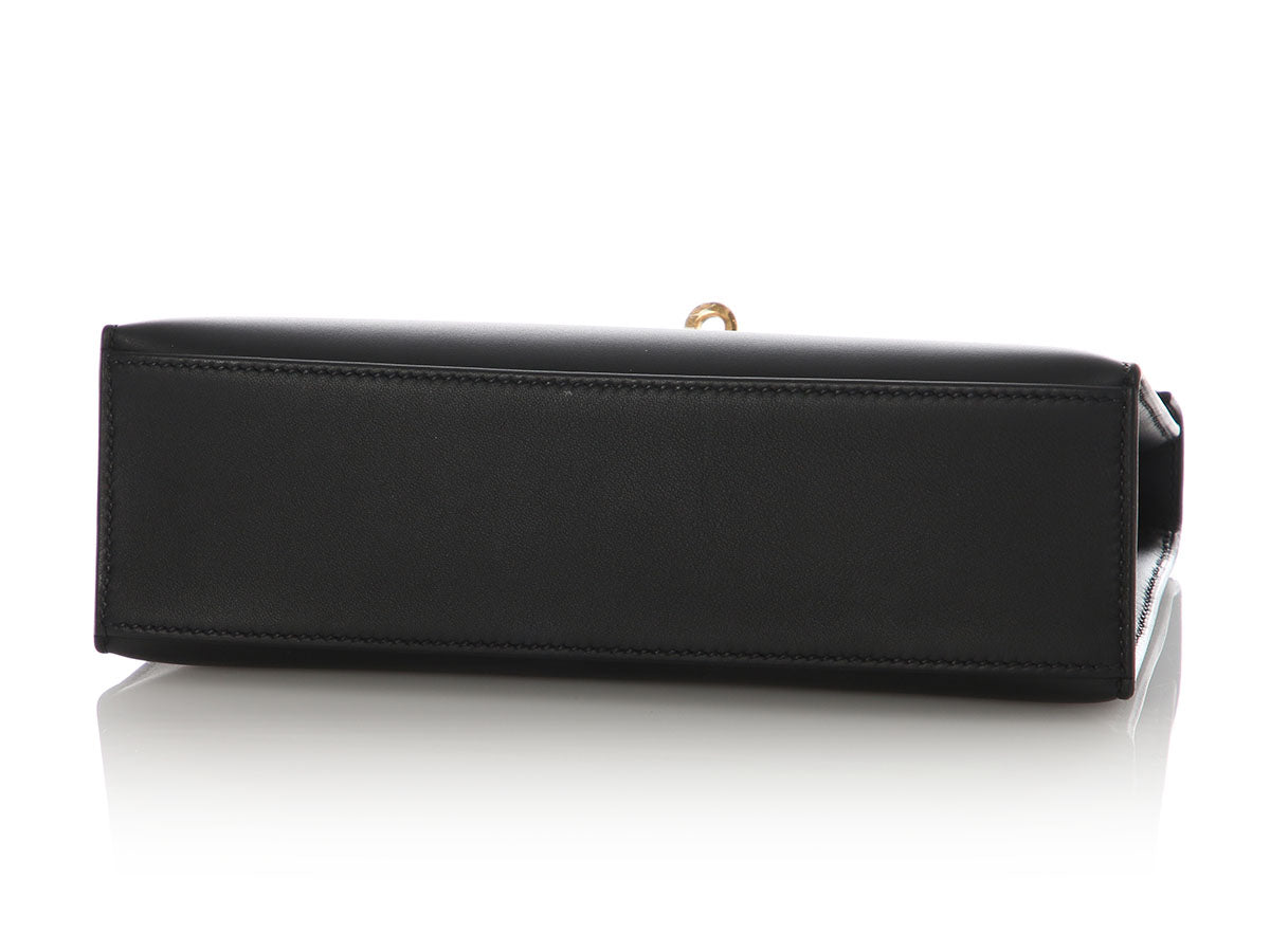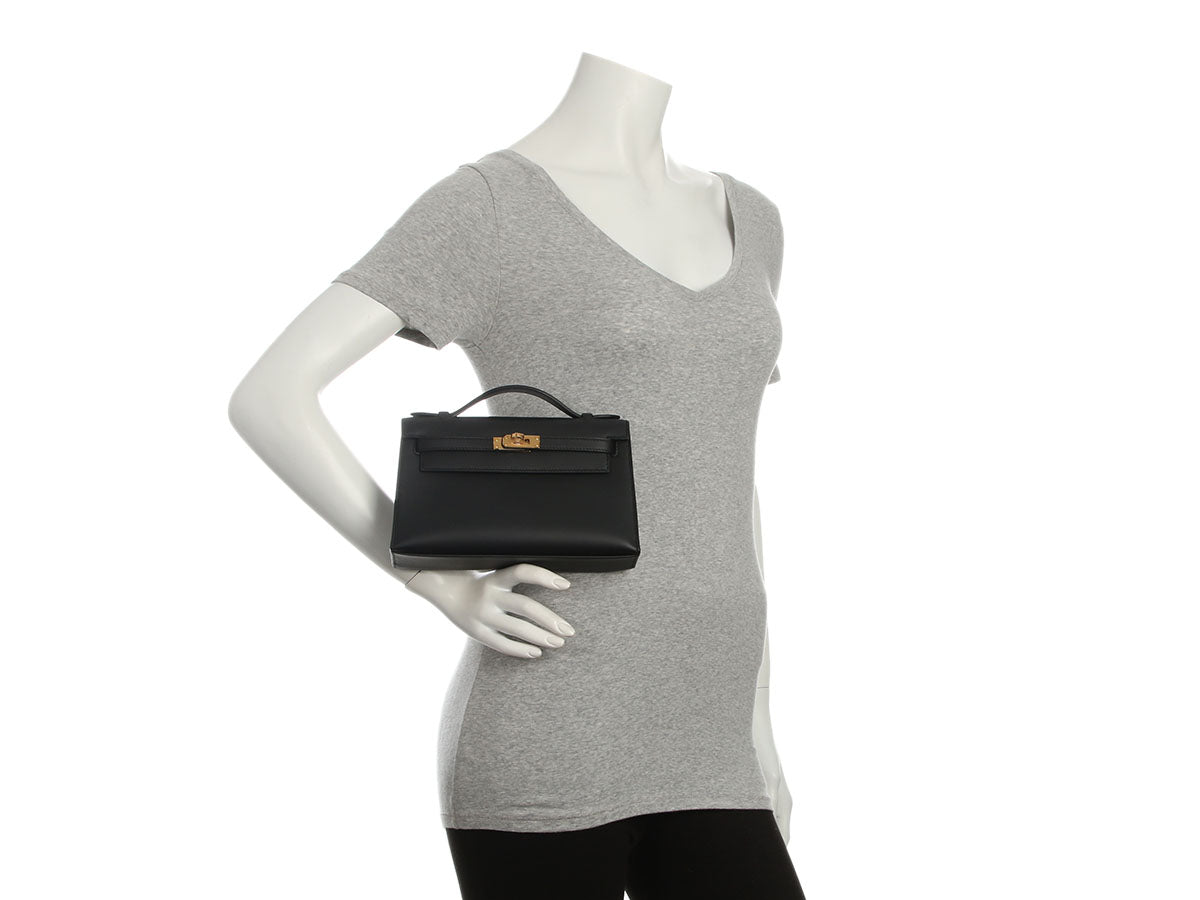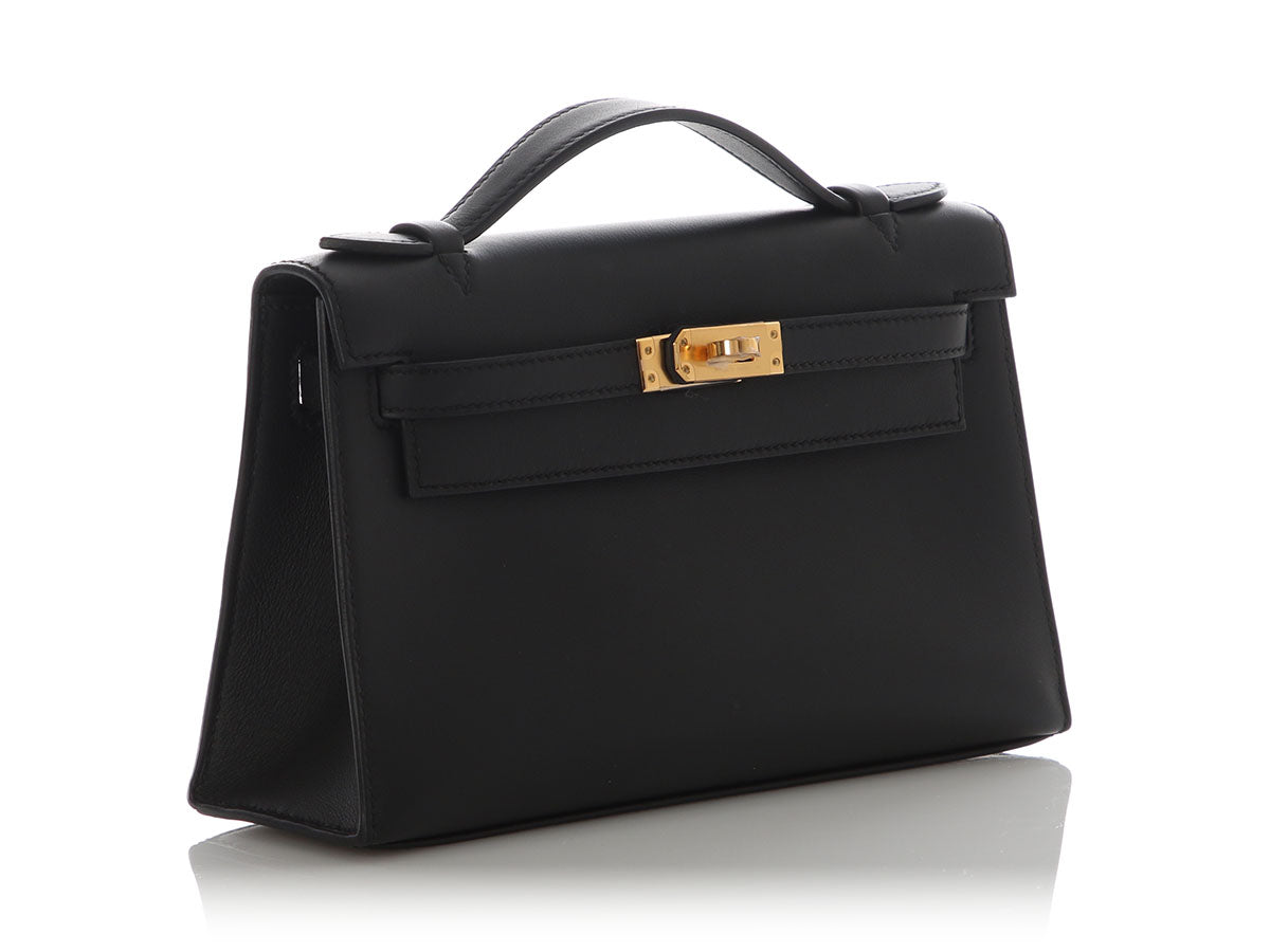 Hermès’ Black Swift Kelly Pochette is a tidy little clutch with loads of panache! The flap secures with a gold turnlock, which opens to black-leather lining with one slide pocket inside and room for just the essentials. Brand new from 2024 (W stamp), it is new and never worn with a dustbag, box, and plastic on the hardware. Tote this little treasure by the top handle or carry it by its structured bottom!